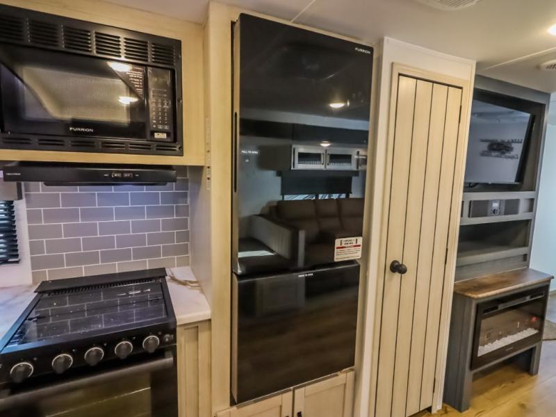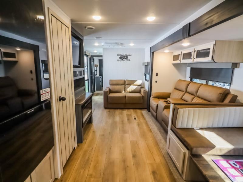 Experience a home away from home with this travel trailer! The front kitchen has everything you will need to prepare your best meals, and you can enjoy them at the booth dinette. The rear private bedroom has a 72" x 80" king bed slide across from a dresser, a wardrobe, and a closet with washer and dryer prep. Freshen up in the full bathroom with the 32" x 40" shower and then enjoy a cup of coffee relaxing on the theater seating or on the sofa! Choose the optional outside micro kitchen with a griddle for even more convenience!
