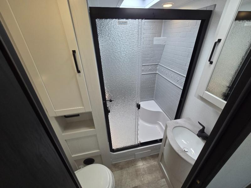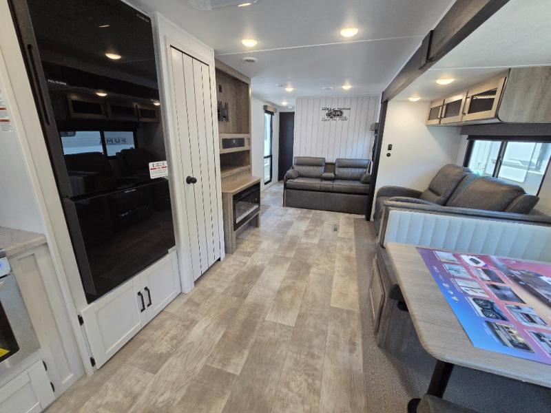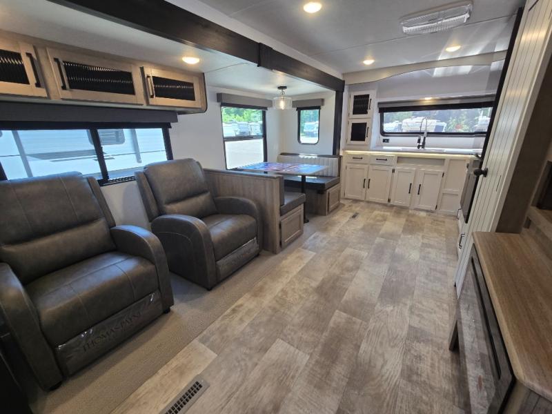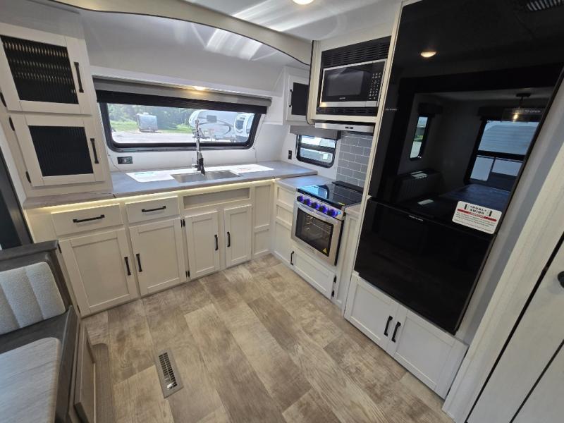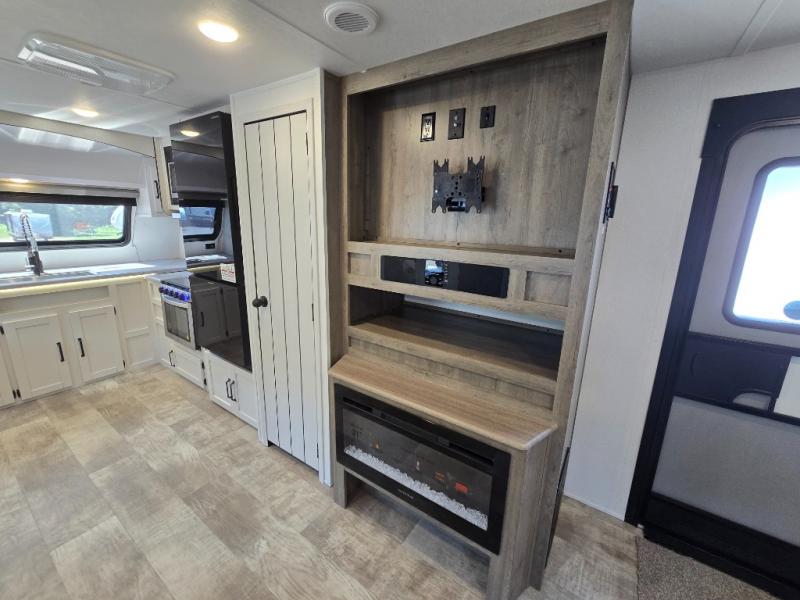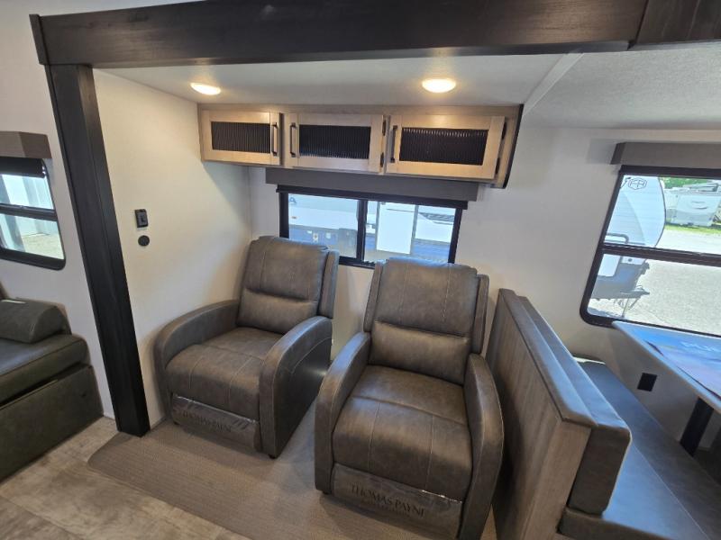 Experience a home away from home with this travel trailer! The front kitchen has everything you will need to prepare your best meals and you can enjoy them at the booth dinette. The rear private bedroom has a 72" x 80" king bed slide across from a dresser, a wardrobe, and a closet with washer and dryer prep. Freshen up in the full bathroom with the 32" x 40" shower and then enjoy a cup of coffee relaxing in one of the two recliners or on the sofa! Choose the optional outside micro kitchen with a griddle for even more convenience!