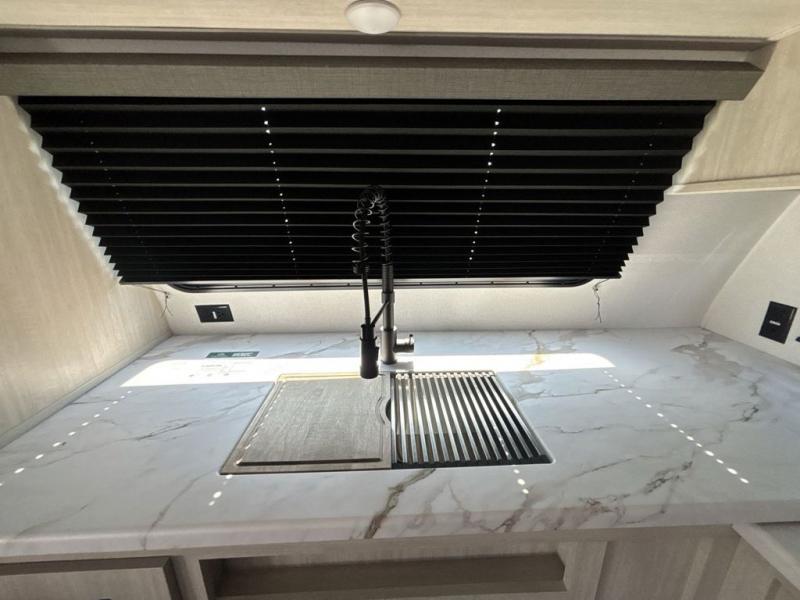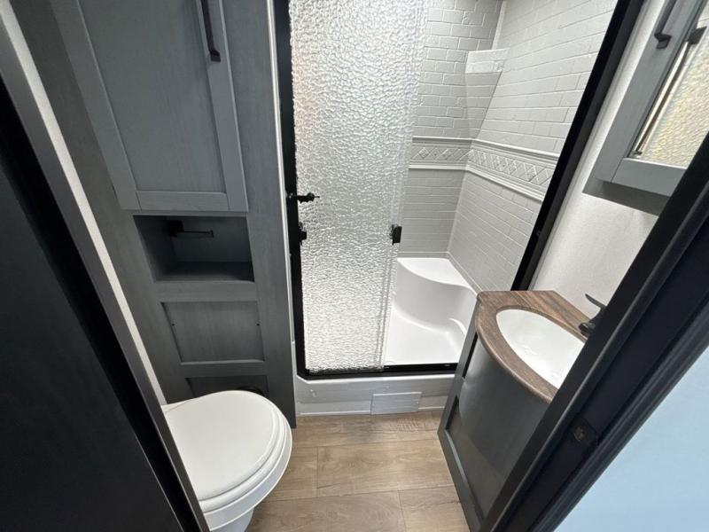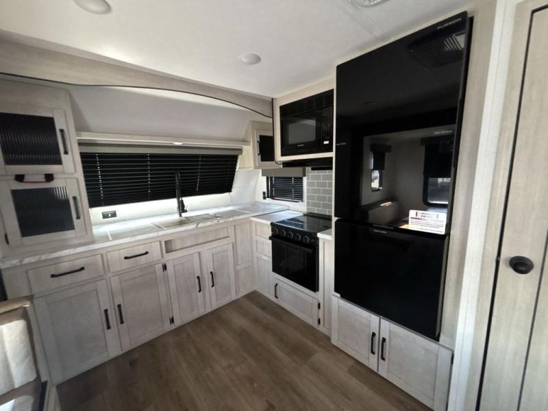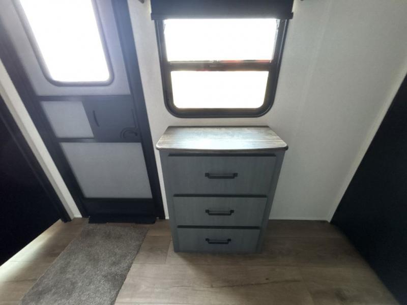 Experience a home away from home with this travel trailer! The front kitchen has everything you will need to prepare your best meals and you can enjoy them at the booth dinette. The rear private bedroom has a 72" x 80" king bed slide across from a dresser, a wardrobe, and a closet with washer and dryer prep. Freshen up in the full bathroom with the 32" x 40" shower and then enjoy a cup of coffee relaxing in one of the two recliners or on the sofa! Choose the optional outside micro kitchen with a griddle for even more convenience!