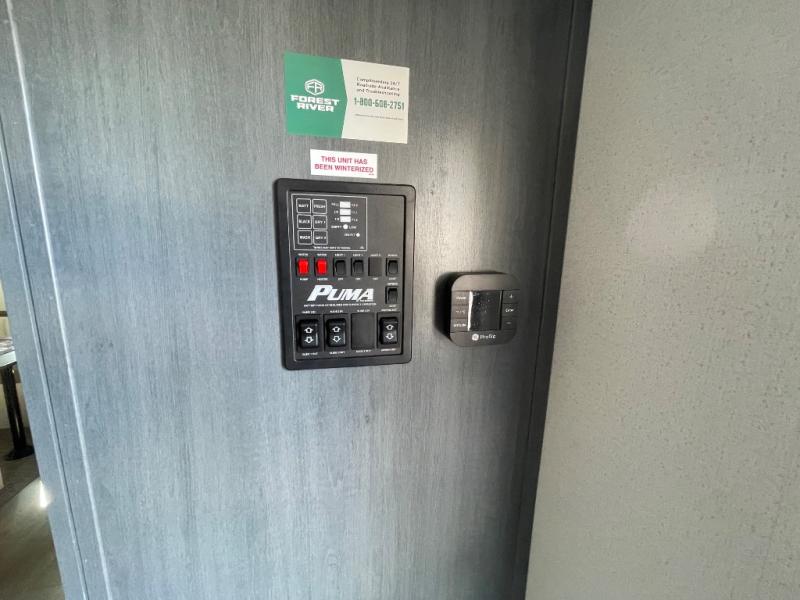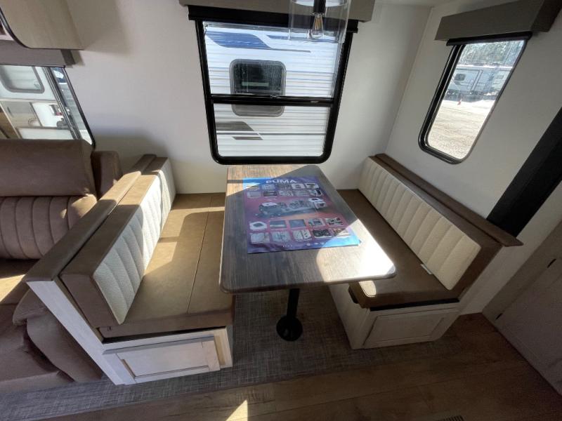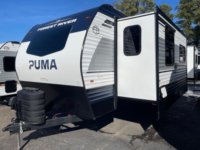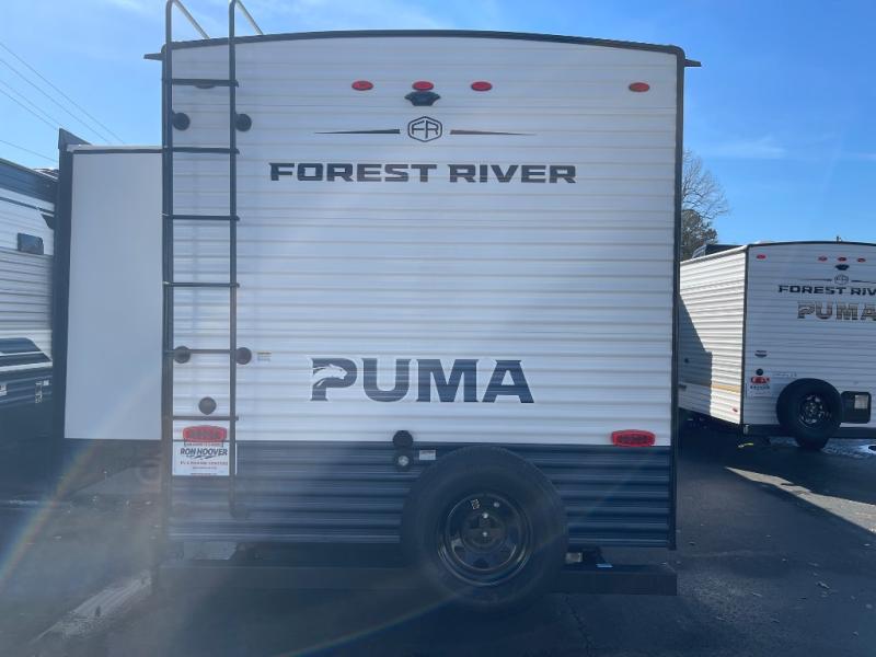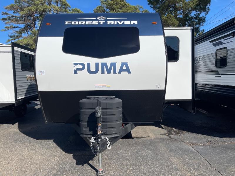 If you're looking for family-fun adventures, then you need one of these Forest River Puma travel trailers! They are built rugged, easy to tow, and jam packed with features. The Darco wrapped underbelly will help protect your unit, and the roof and side mount solar prep gives you the option to add off-grid power. Inside, the Congoleum linoleum will be easy to keep clean, and the night roller shades will provide privacy when it's time to turn in. You'll also enjoy an electric awning with an LED light strip plus an AM/FM/Bluetooth stereo and two outside speakers to keep the party going!