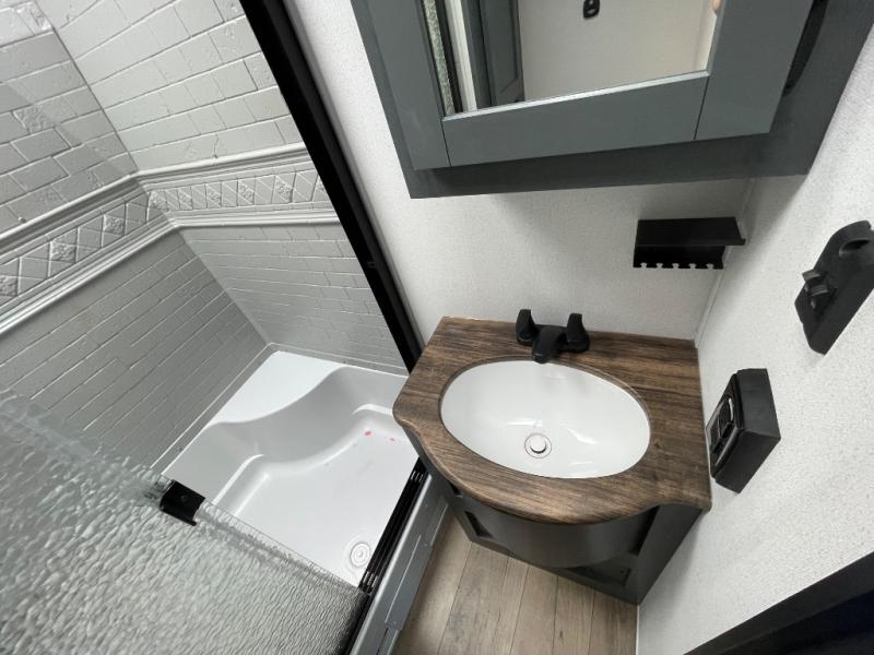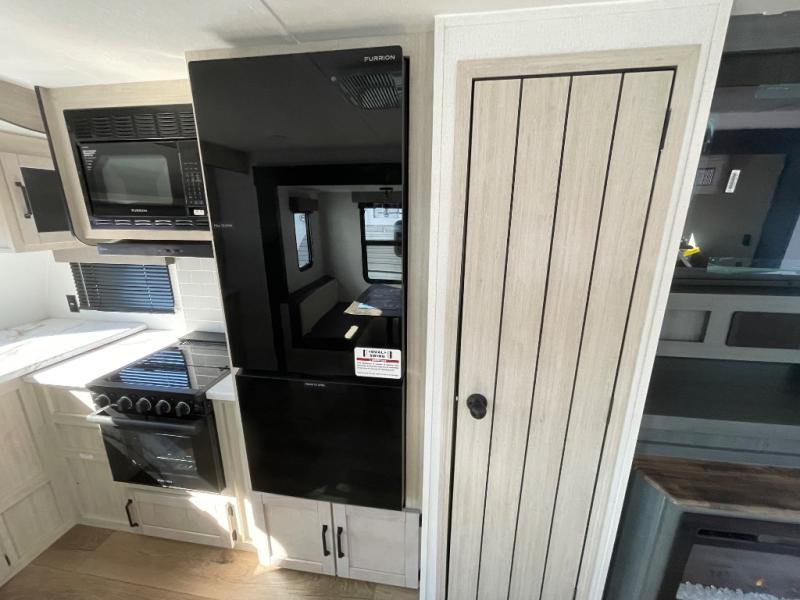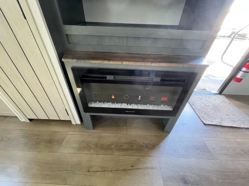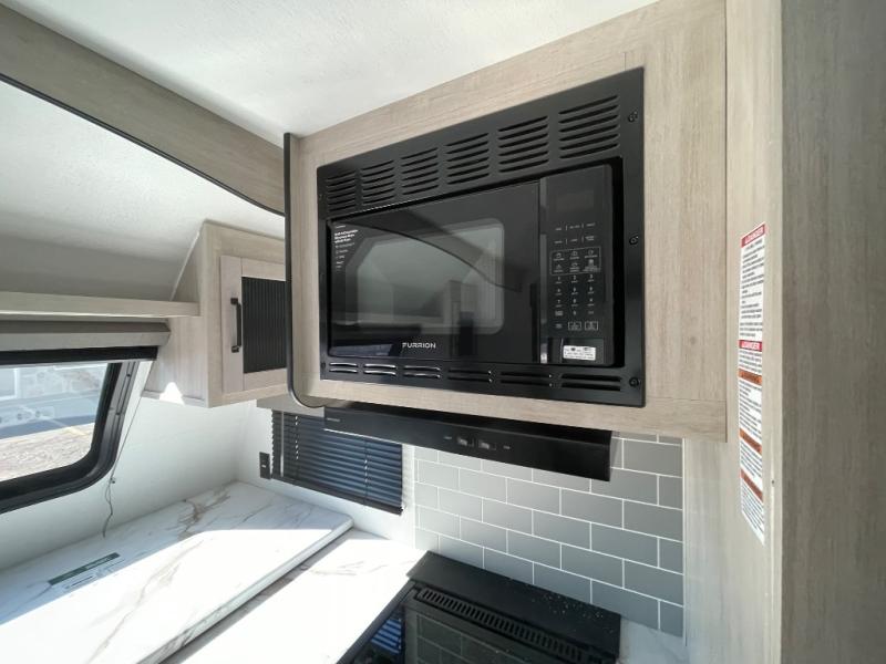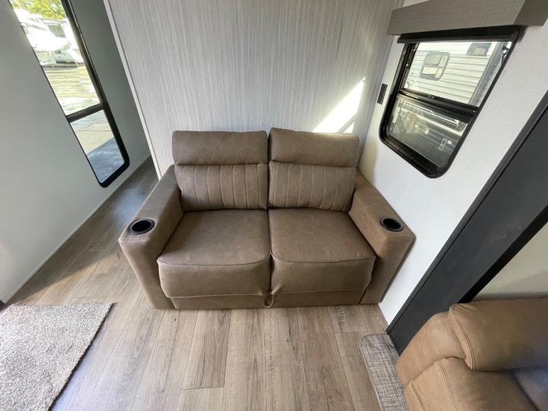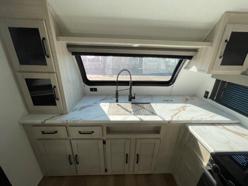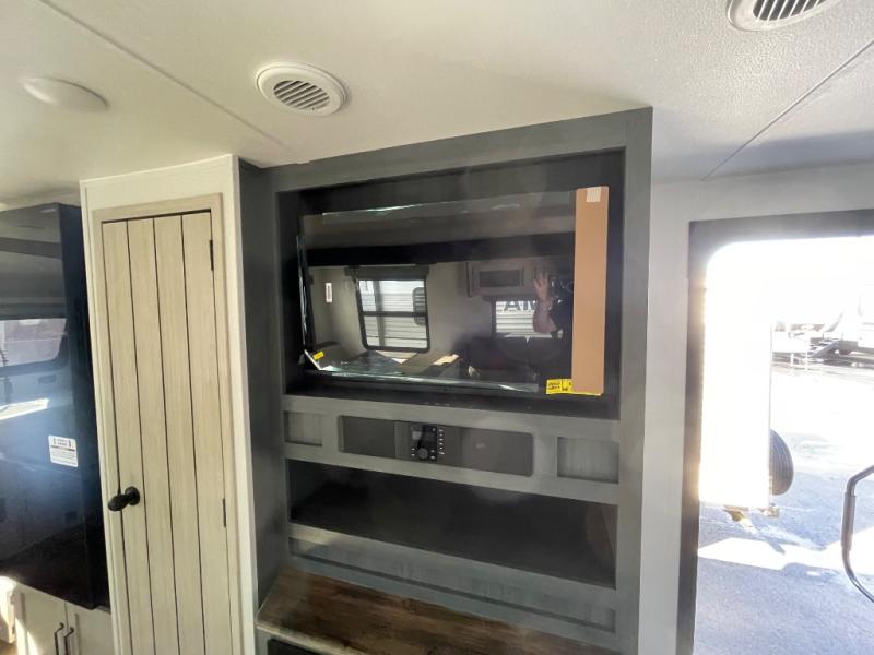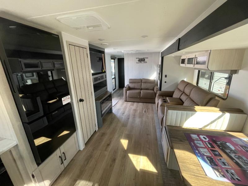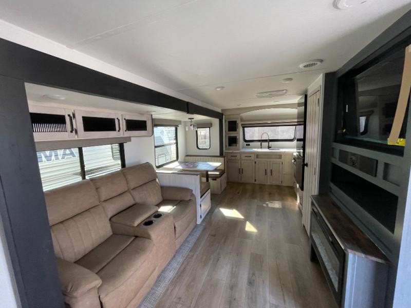 Experience a home away from home with this travel trailer! The front kitchen has everything you will need to prepare your best meals, and you can enjoy them at the booth dinette. The rear private bedroom has a 72" x 80" king bed slide across from a dresser, a wardrobe, and a closet with washer and dryer prep. Freshen up in the full bathroom with the 32" x 40" shower and then enjoy a cup of coffee relaxing on the theater seating or on the sofa! Choose the optional outside micro kitchen with a griddle for even more convenience!