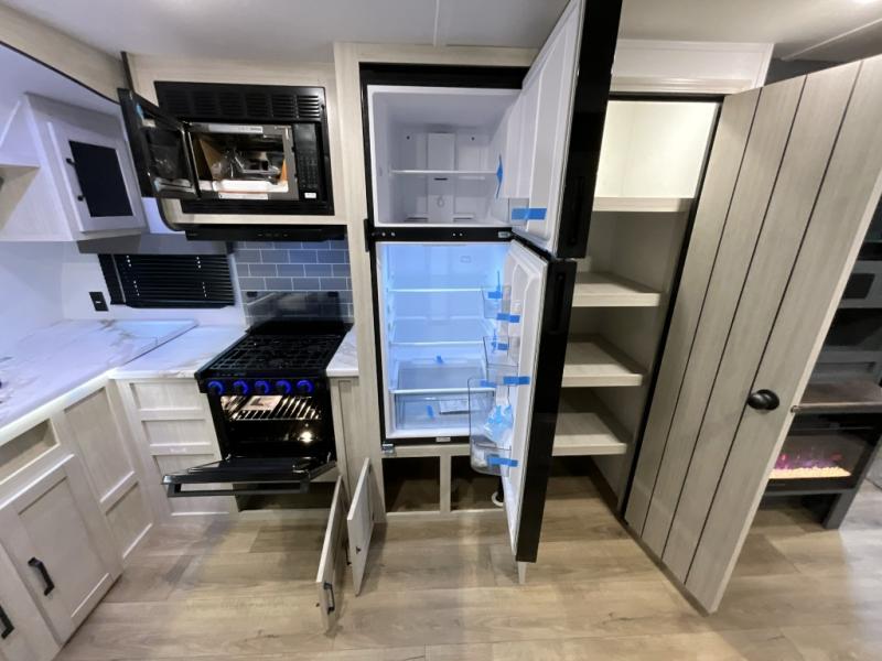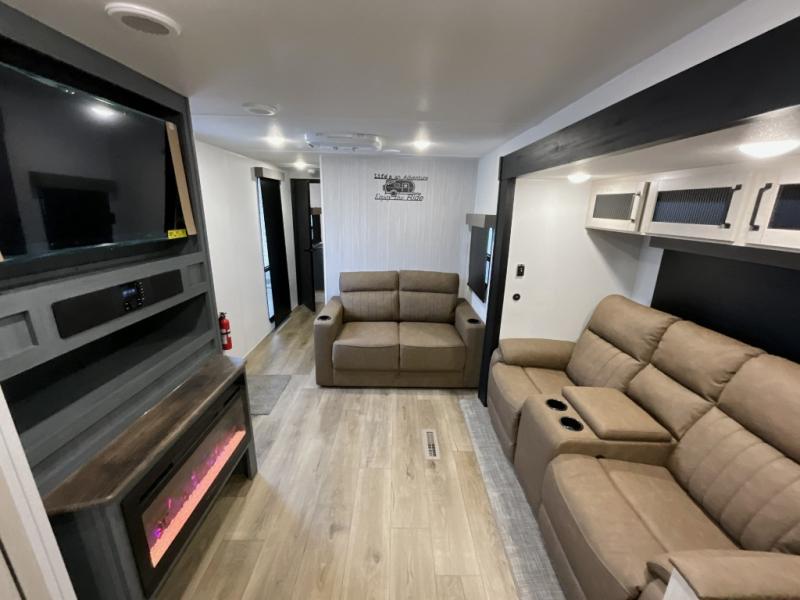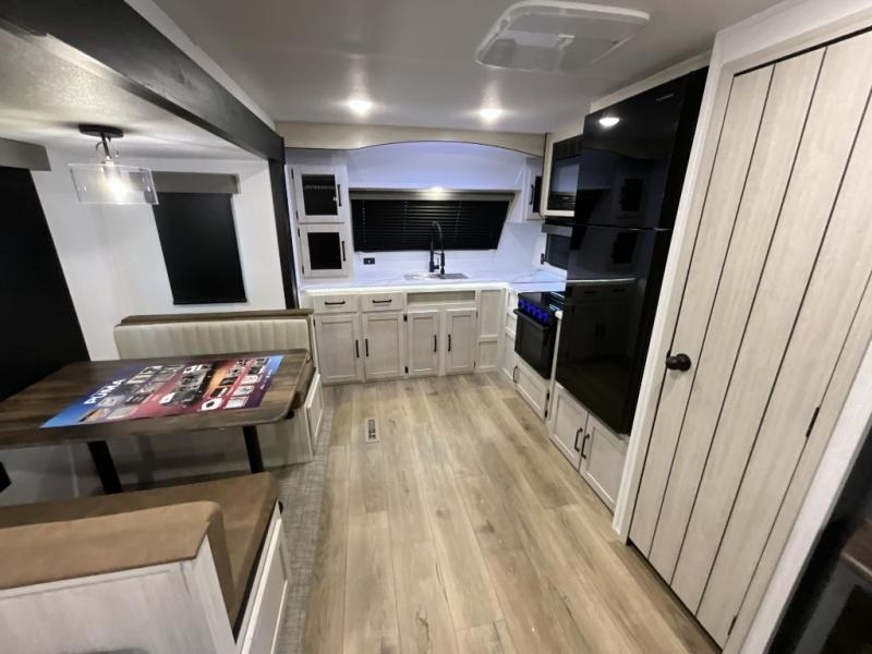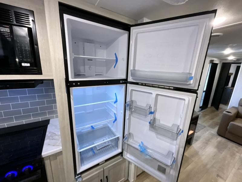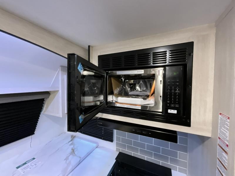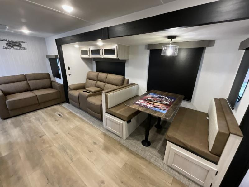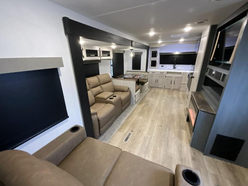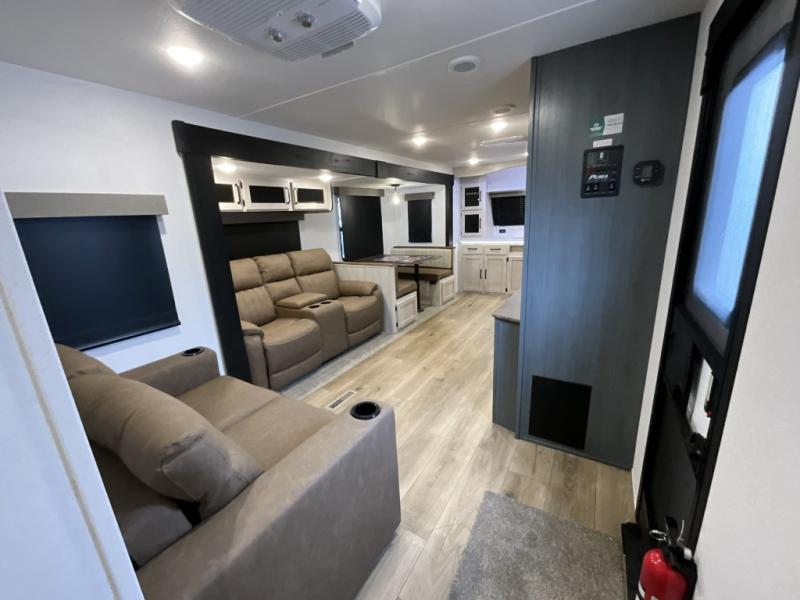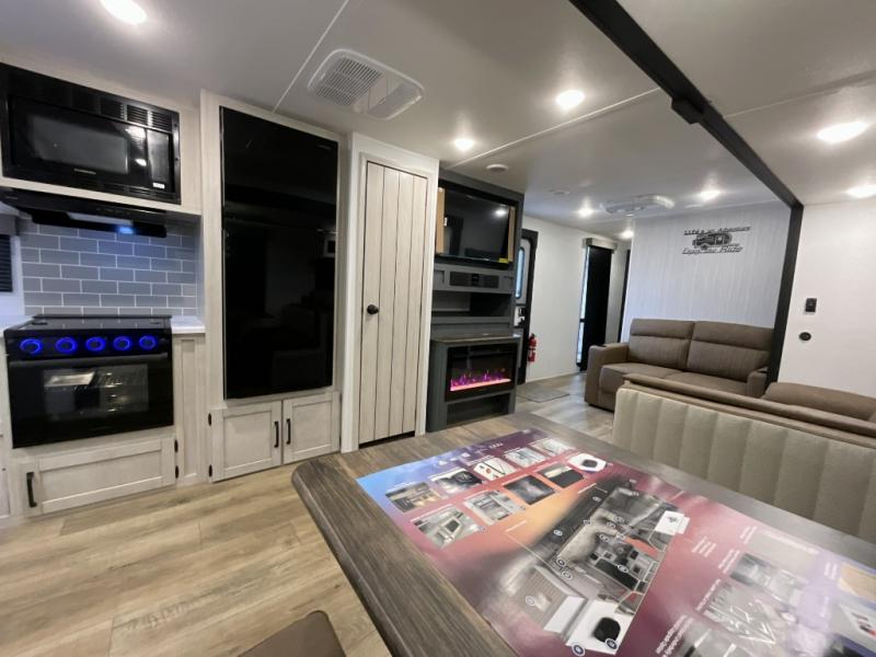 Experience a home away from home with this travel trailer! The front kitchen has everything you will need to prepare your best meals, and you can enjoy them at the booth dinette. The rear private bedroom has a 72" x 80" king bed slide across from a dresser, a wardrobe, and a closet with washer and dryer prep. Freshen up in the full bathroom with the 32" x 40" shower and then enjoy a cup of coffee relaxing on the theater seating or on the sofa! Choose the optional outside micro kitchen with a griddle for even more convenience!
