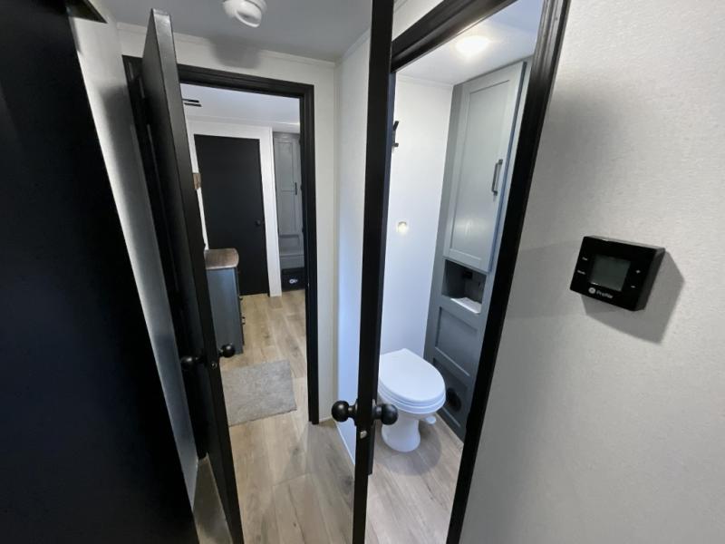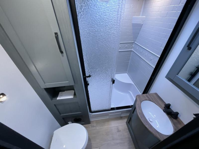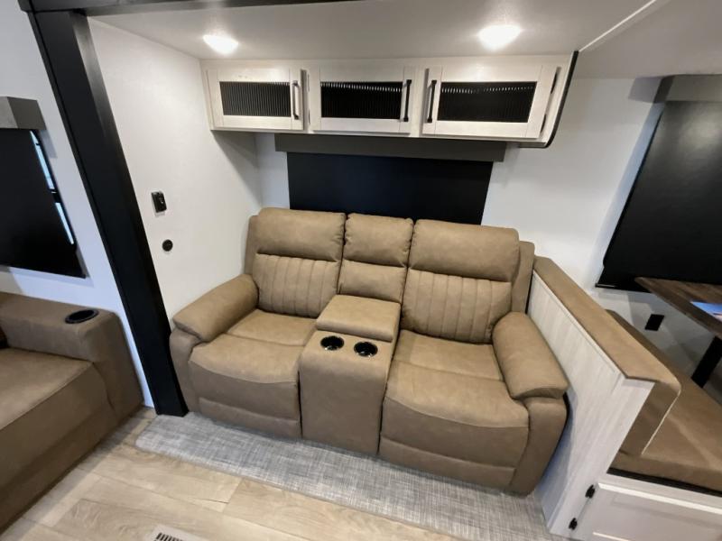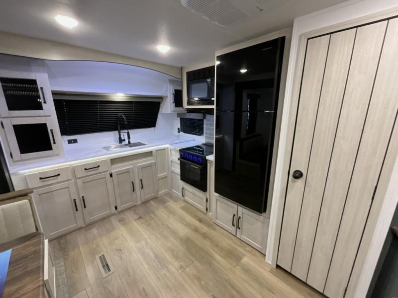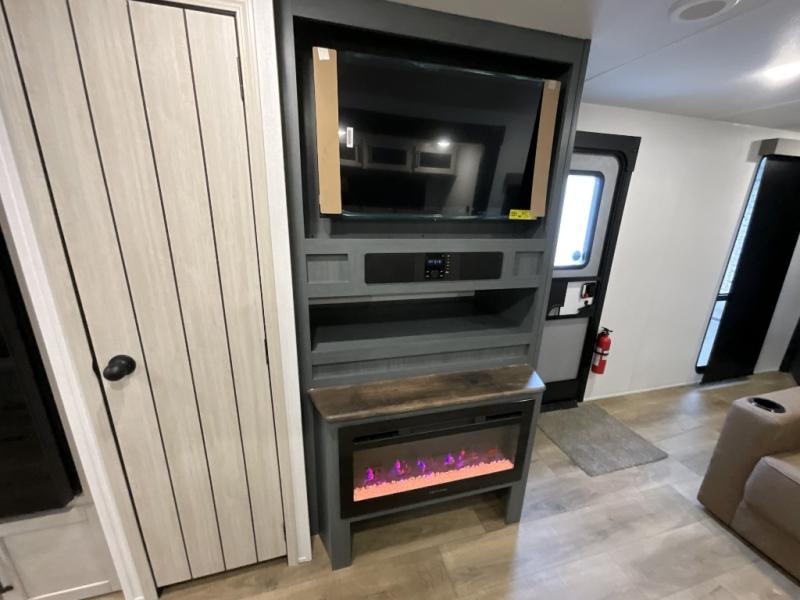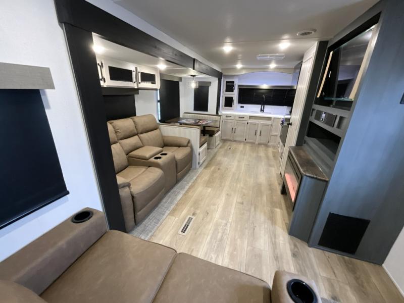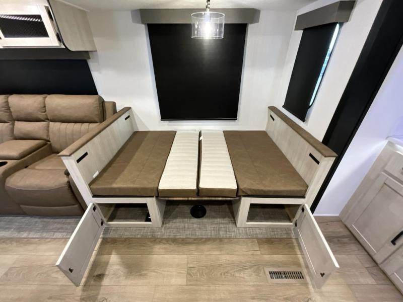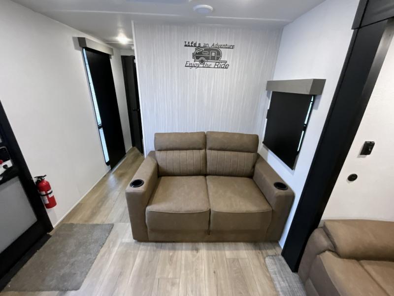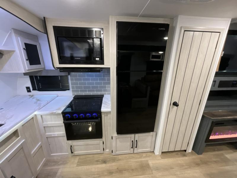 Experience a home away from home with this travel trailer! The front kitchen has everything you will need to prepare your best meals, and you can enjoy them at the booth dinette. The rear private bedroom has a 72" x 80" king bed slide across from a dresser, a wardrobe, and a closet with washer and dryer prep. Freshen up in the full bathroom with the 32" x 40" shower and then enjoy a cup of coffee relaxing on the theater seating or on the sofa! Choose the optional outside micro kitchen with a griddle for even more convenience!