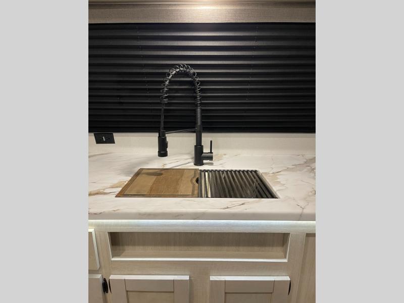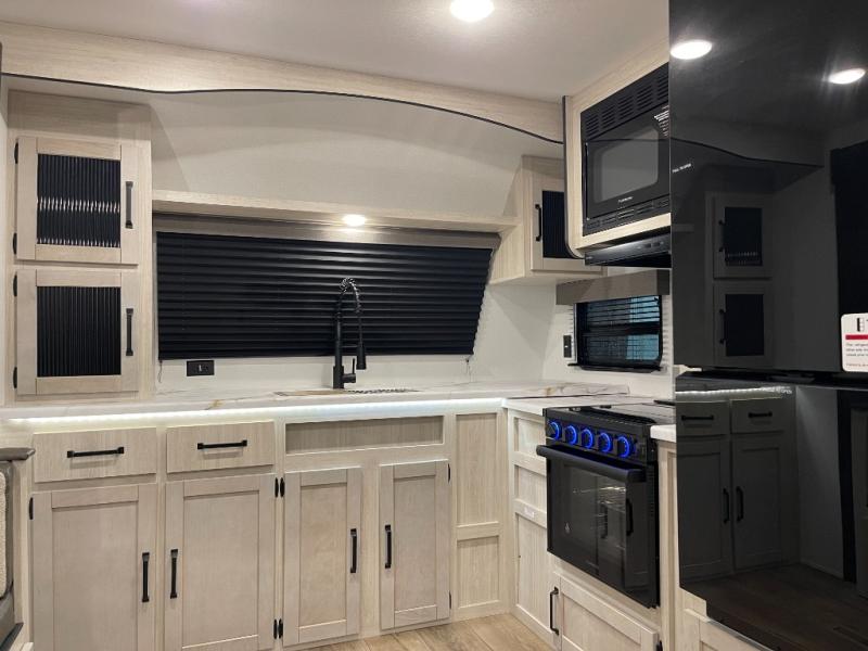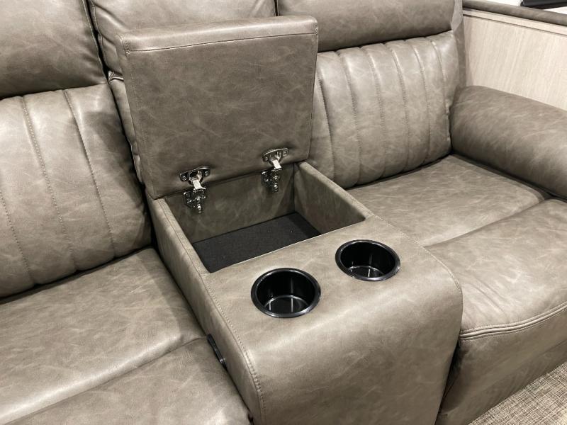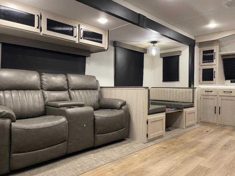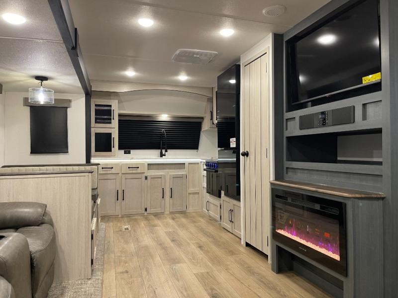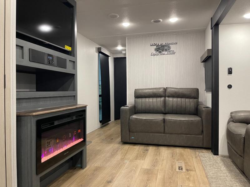 King Bed on Slide, Front Kitchen, Theater Seating with Fireplace, Sofa Bed, Outdoor Kitchen