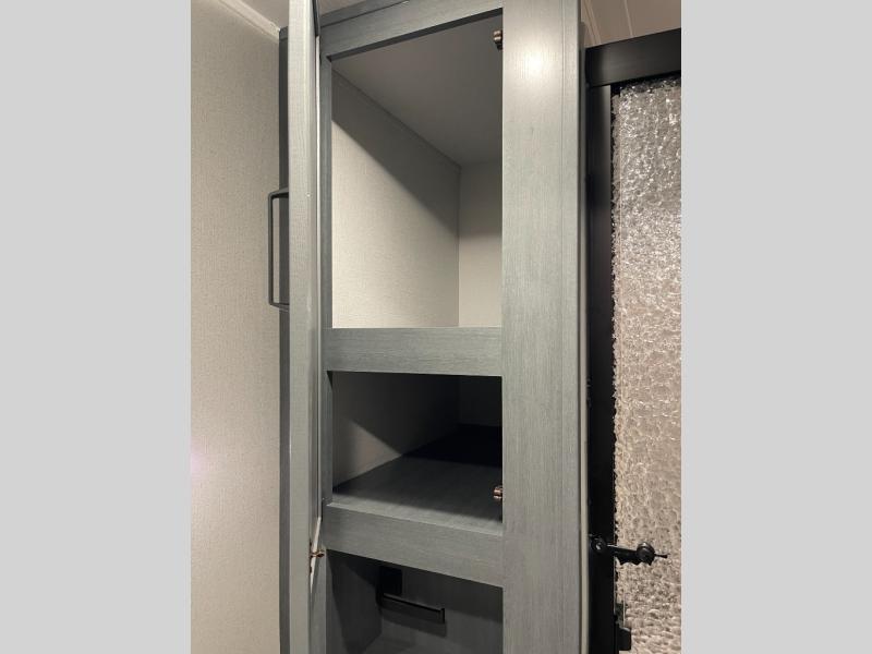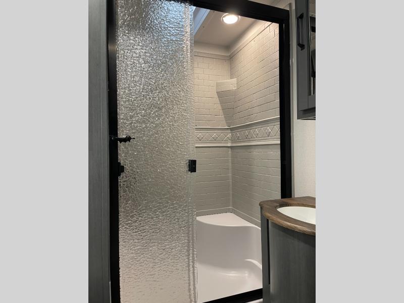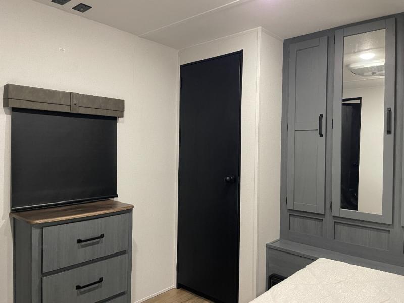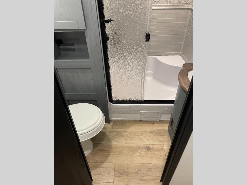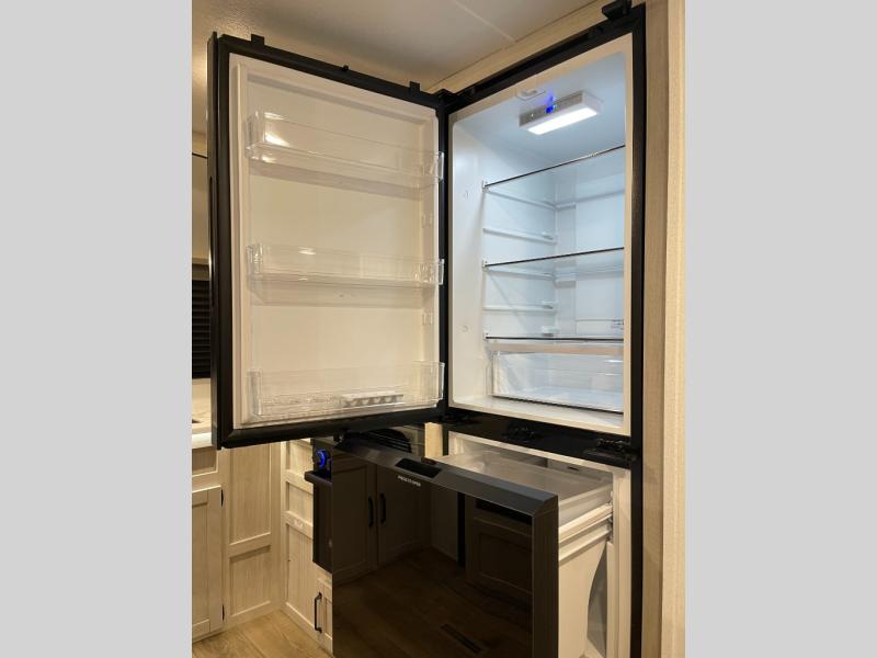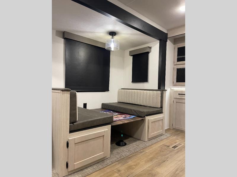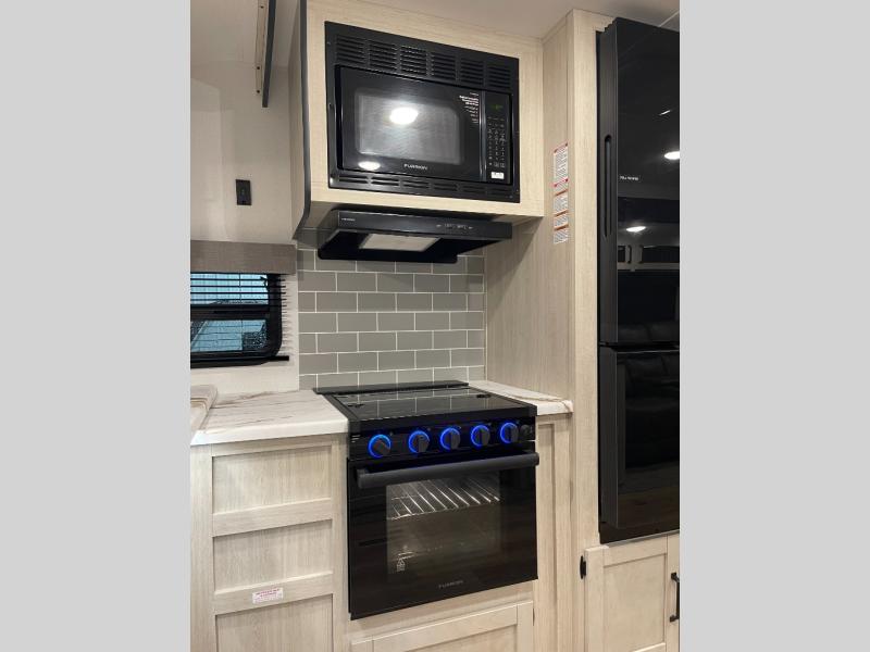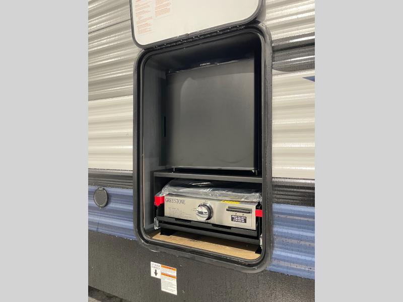 Experience a home away from home with this travel trailer! The front kitchen has everything you will need to prepare your best meals, and you can enjoy them at the booth dinette. The rear private bedroom has a 72" x 80" king bed slide across from a dresser, a wardrobe, and a closet with washer and dryer prep. Freshen up in the full bathroom with the 32" x 40" shower and then enjoy a cup of coffee relaxing on the theater seating or on the sofa! Choose the optional outside micro kitchen with a griddle for even more convenience!