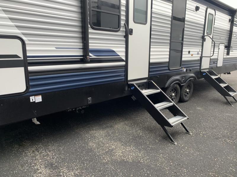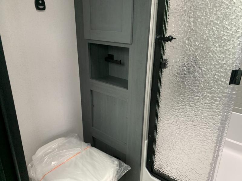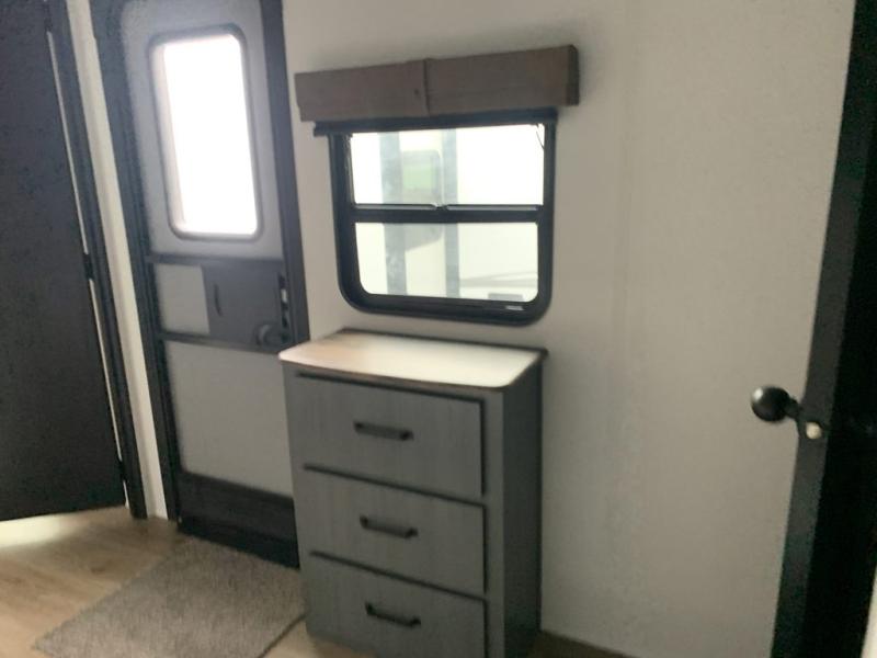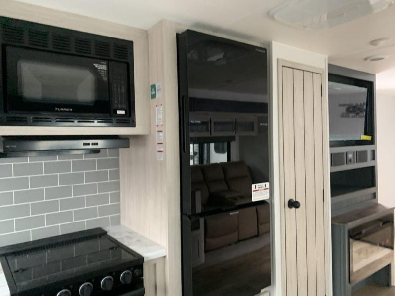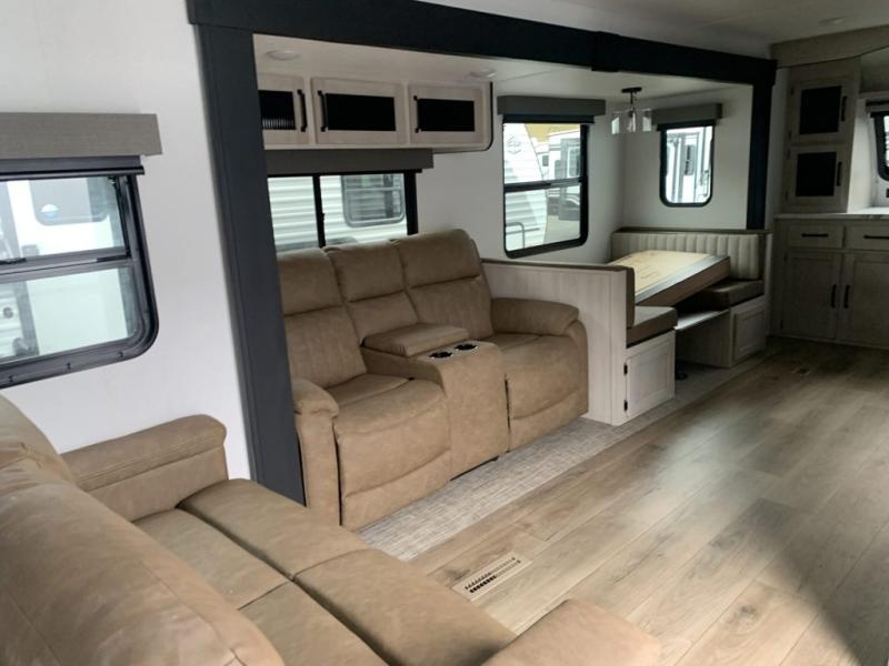 Experience a home away from home with this travel trailer! The front kitchen has everything you will need to prepare your best meals, and you can enjoy them at the booth dinette. The rear private bedroom has a 72" x 80" king bed slide across from a dresser, a wardrobe, and a closet with washer and dryer prep. Freshen up in the full bathroom with the 32" x 40" shower and then enjoy a cup of coffee relaxing on the theater seating or on the sofa! Choose the optional outside micro kitchen with a griddle for even more convenience!