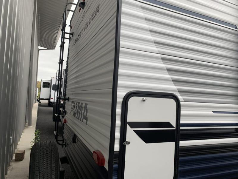 If you're looking for family-fun adventures, then you need one of these Forest River Puma travel trailers! They are built rugged, easy to tow, and jam packed with features. The Darco wrapped underbelly will help protect your unit, and the roof and side mount solar prep gives you the option to add off-grid power. Inside, the Congoleum linoleum will be easy to keep clean, and the night roller shades will provide privacy when it's time to turn in. You'll also enjoy an electric awning with an LED light strip plus an AM/FM/Bluetooth stereo and two outside speakers to keep the party going!