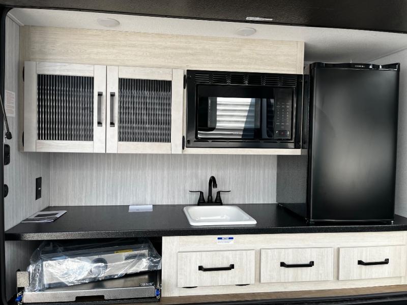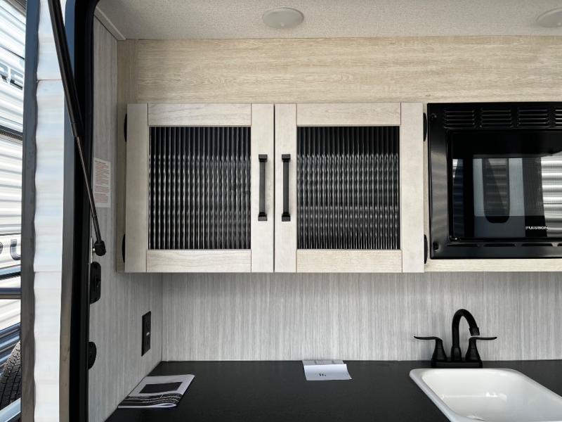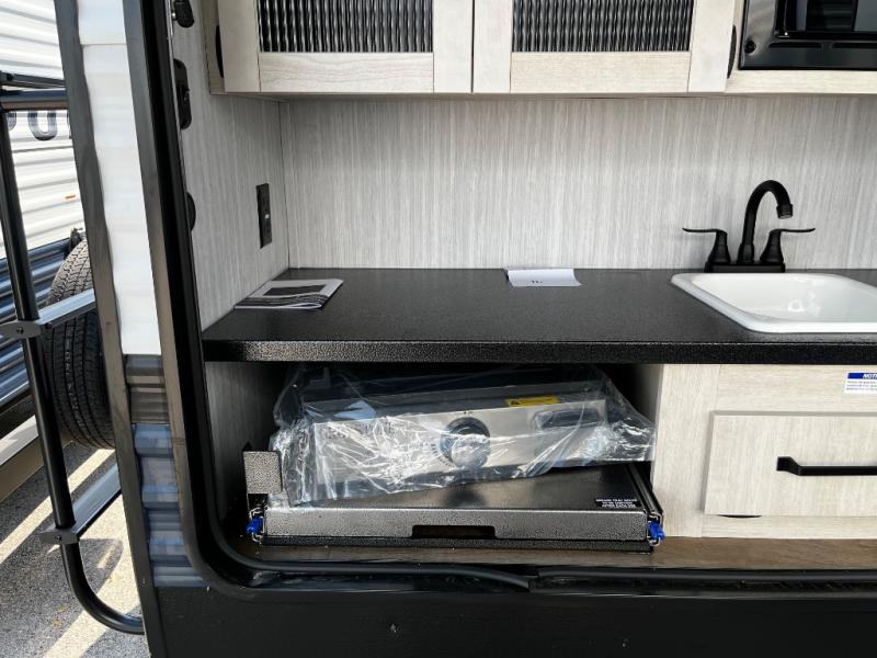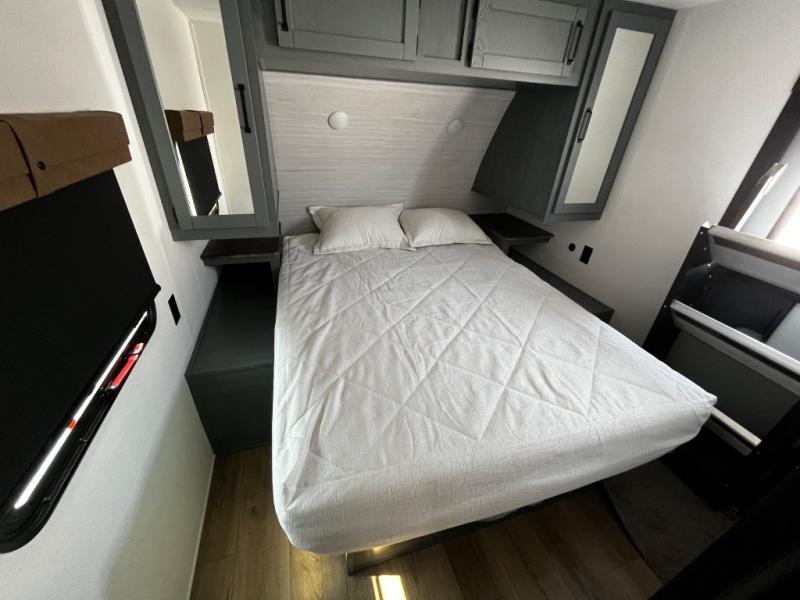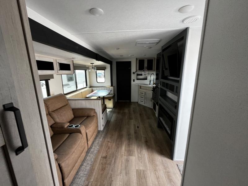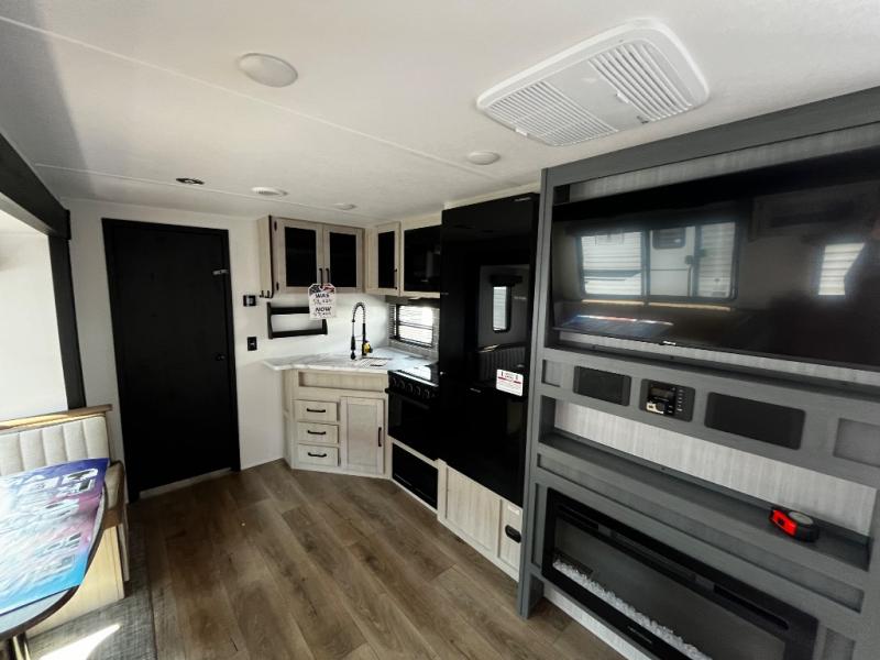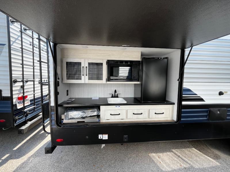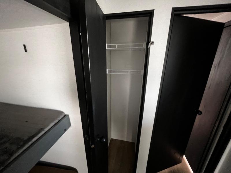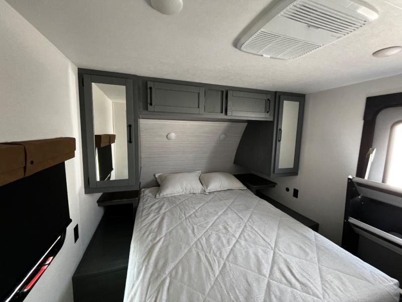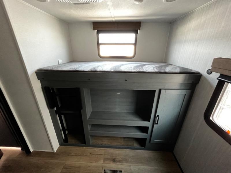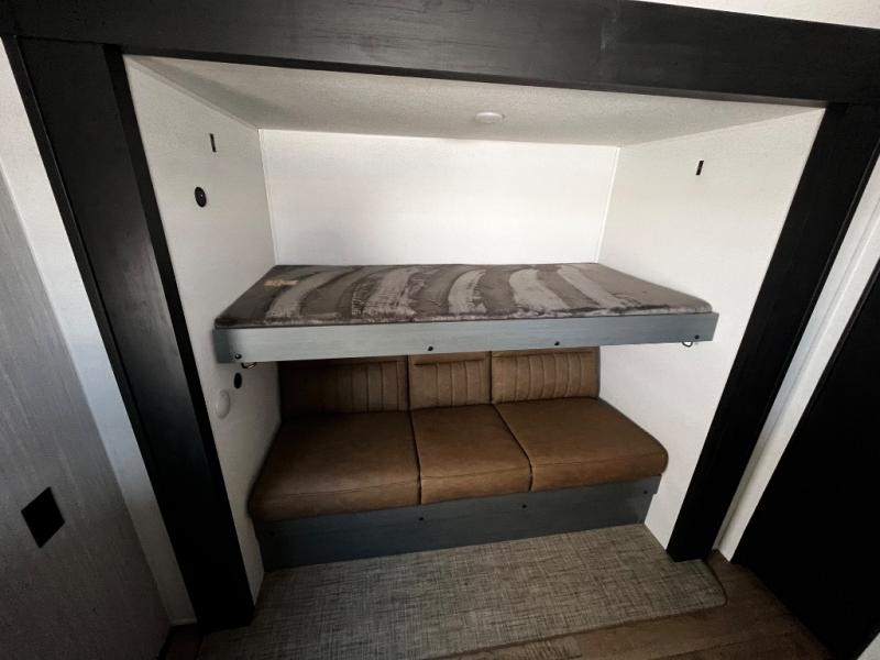 The kids will love having their own rear private bunkhouse in this travel trailer! Inside the bunkhouse is a 38" x 76" bunk above an entertainment center, a closet, and a 32" x 69" bunk above a jiffy sofa slide. The full bathroom with a 34" x 34" radius shower is just outside the bunkhouse for them to easily access it at night. They can even invite a friend or two to tag along and sleep on the sofa and U-shaped dinette once converted. Behind the entertainment center is a closet/pantry to keep your favorite snacks and the kitchen has a 12V refrigerator to keep your beverages cold. When you're ready to wind down your nights, head to the front private bedroom and relax on the queen bed with shirt closets and nightstands on either side of it, plus it has one of the dual entry doors to the unit! This model also includes two outside kitchen options if you enjoy cooking in the fresh outdoors!