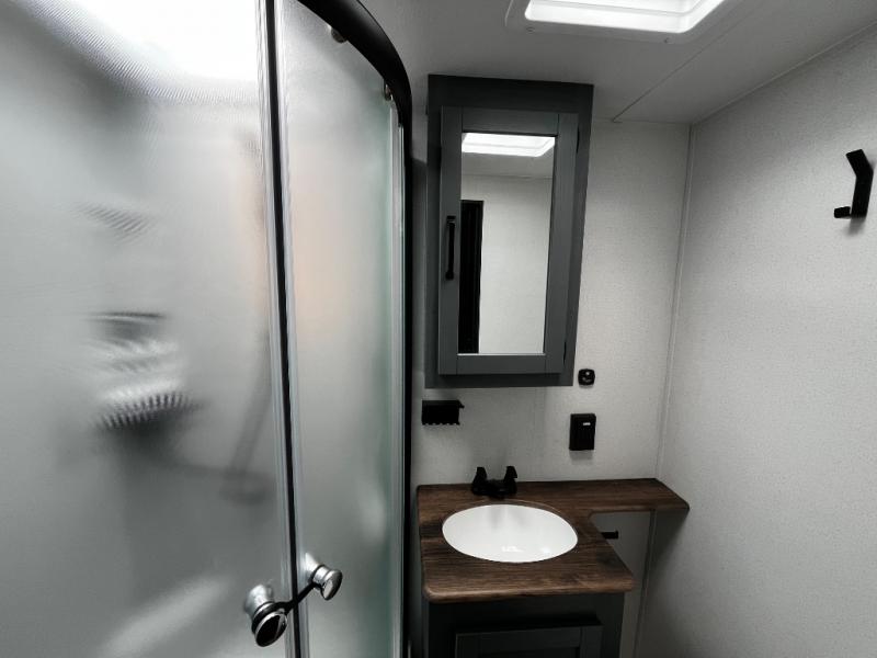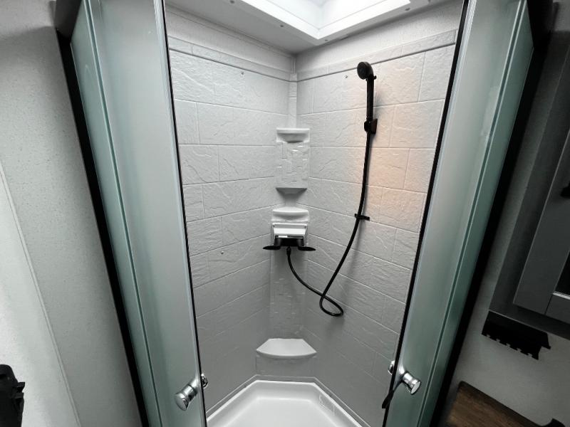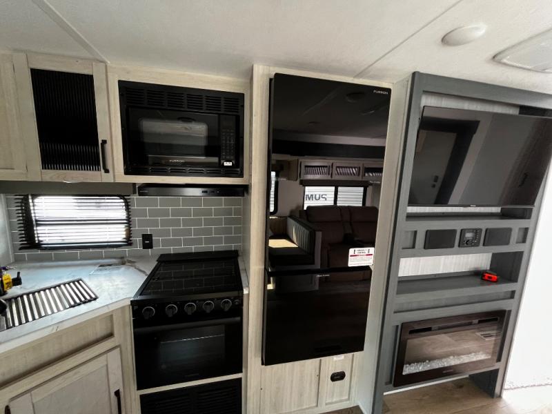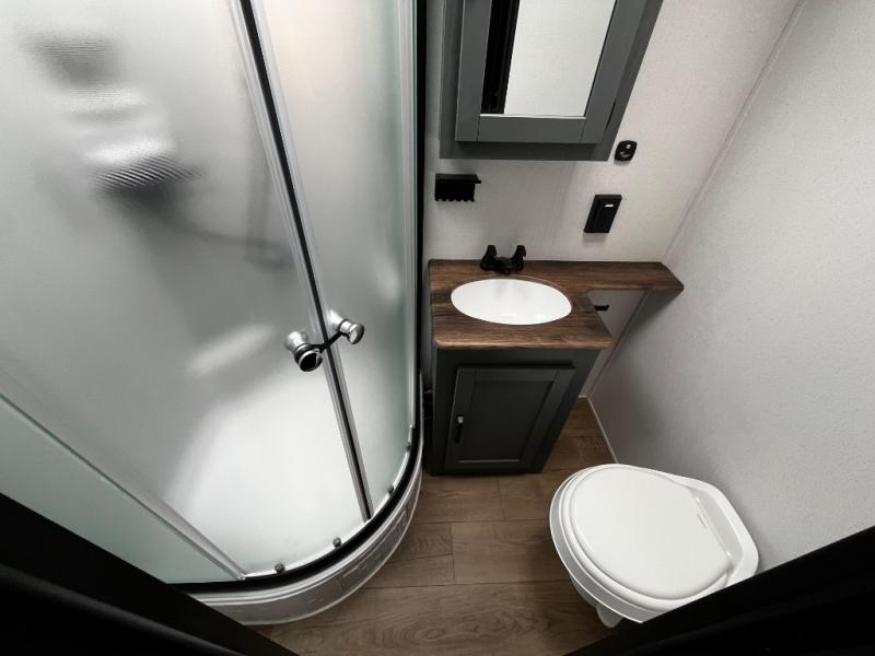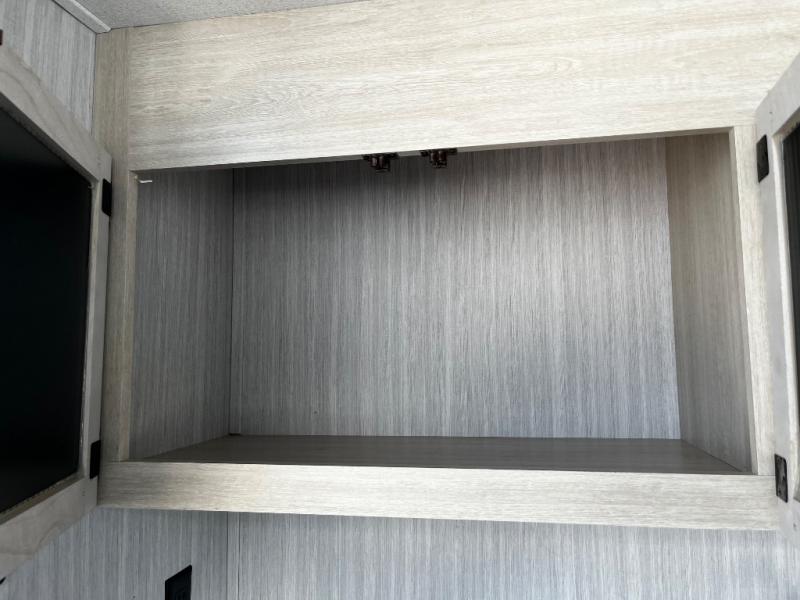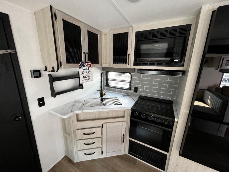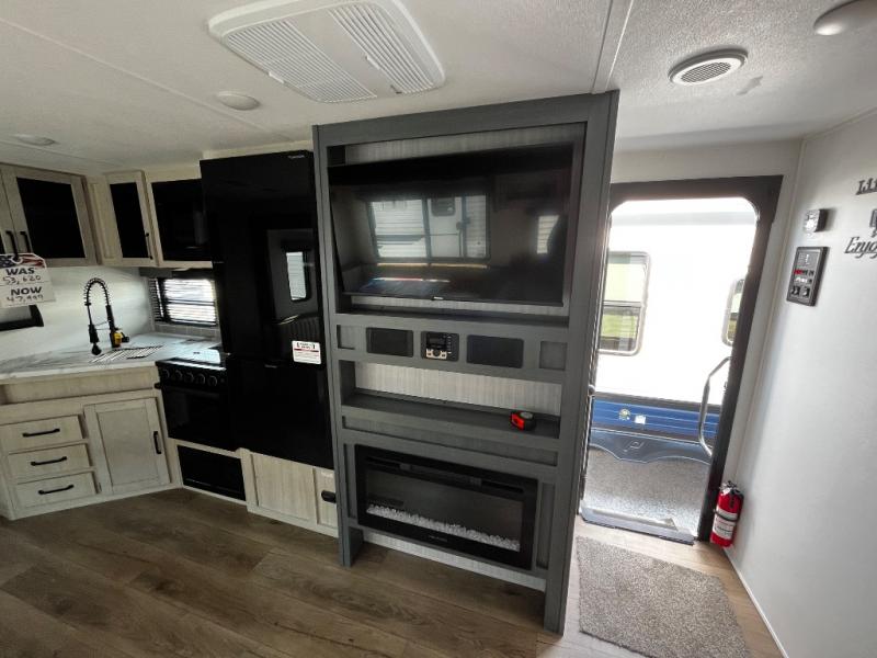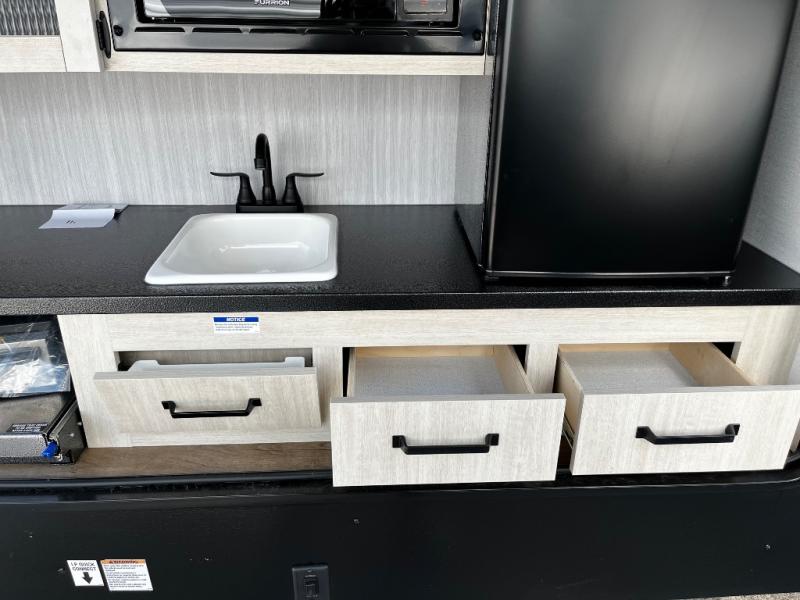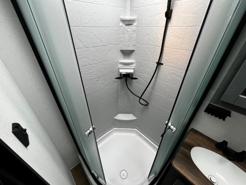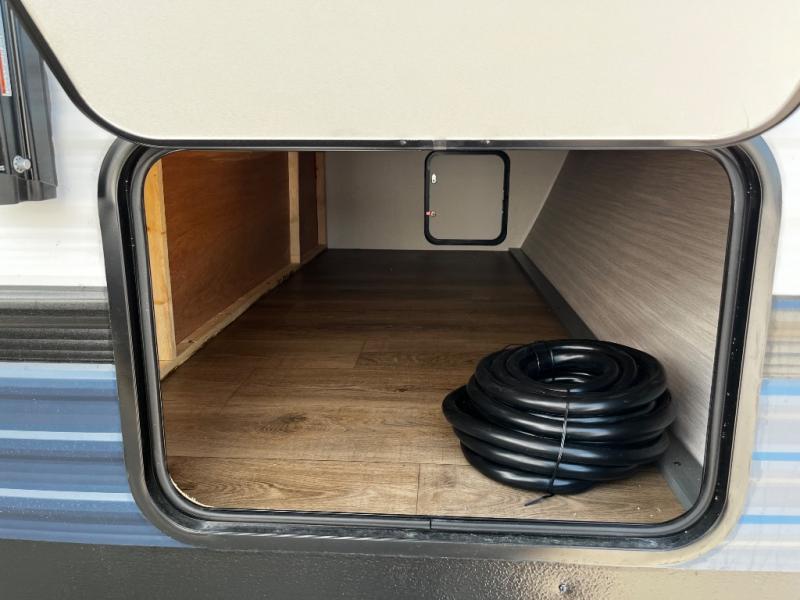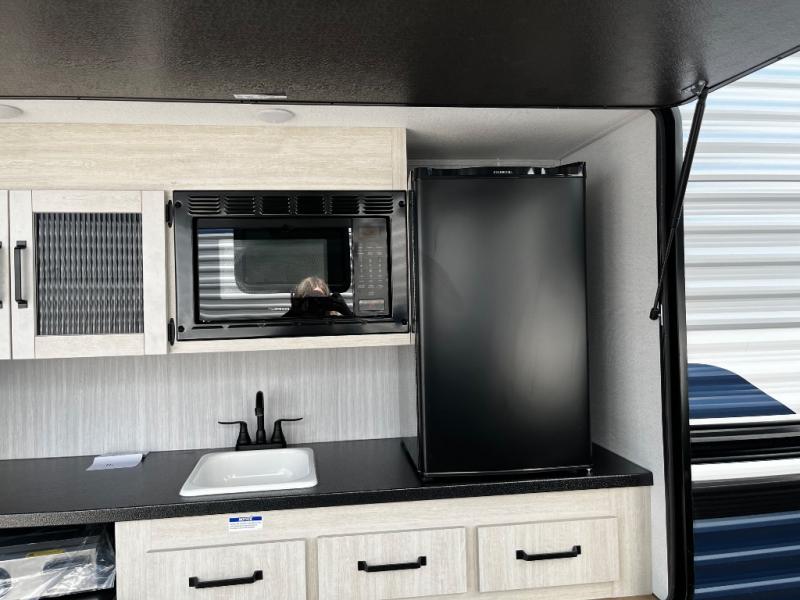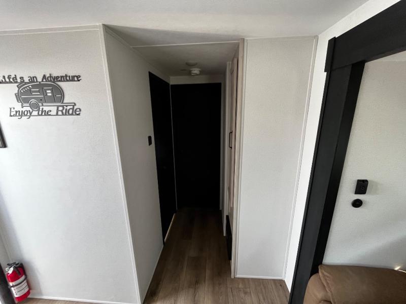 The kids will love having their own rear private bunkhouse in this travel trailer! Inside the bunkhouse is a 38" x 76" bunk above an entertainment center, a closet, and a 32" x 69" bunk above a jiffy sofa slide. The full bathroom with a 34" x 34" radius shower is just outside the bunkhouse for them to easily access it at night. They can even invite a friend or two to tag along and sleep on the sofa and U-shaped dinette once converted. Behind the entertainment center is a closet/pantry to keep your favorite snacks and the kitchen has a 12V refrigerator to keep your beverages cold. When you're ready to wind down your nights, head to the front private bedroom and relax on the queen bed with shirt closets and nightstands on either side of it, plus it has one of the dual entry doors to the unit! This model also includes two outside kitchen options if you enjoy cooking in the fresh outdoors!