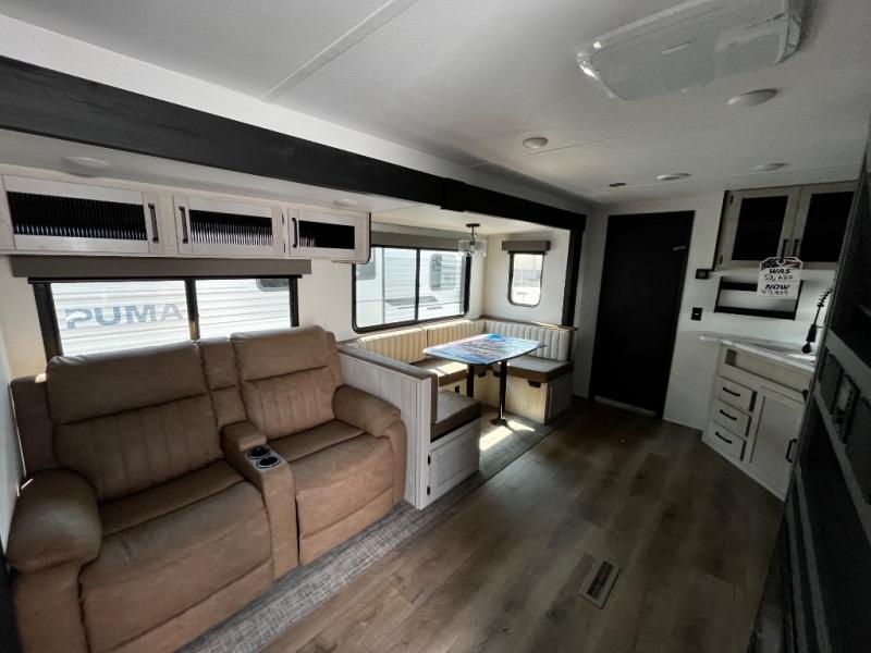 If you're looking for family-fun adventures then you need one of these Palomino Puma fifth wheels or travel trailers! They are built rugged, easy to tow, and jam packed with features. The Darco wrapped underbelly will protect your units vitals and the AlphaPly roofing membrane covers it. They also have new aluminum wheels and a powder coated steel I-beam frame. Inside, the Congoleum linoleum will be easy to keep clean, and the night roller shades will provide privacy when it's time to turn in. You'll also enjoy an electric awning with an LED light strip plus an AM/FM/Bluetooth stereo and two outside speakers to keep the party going!