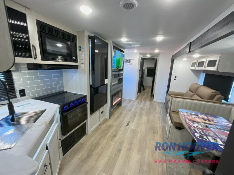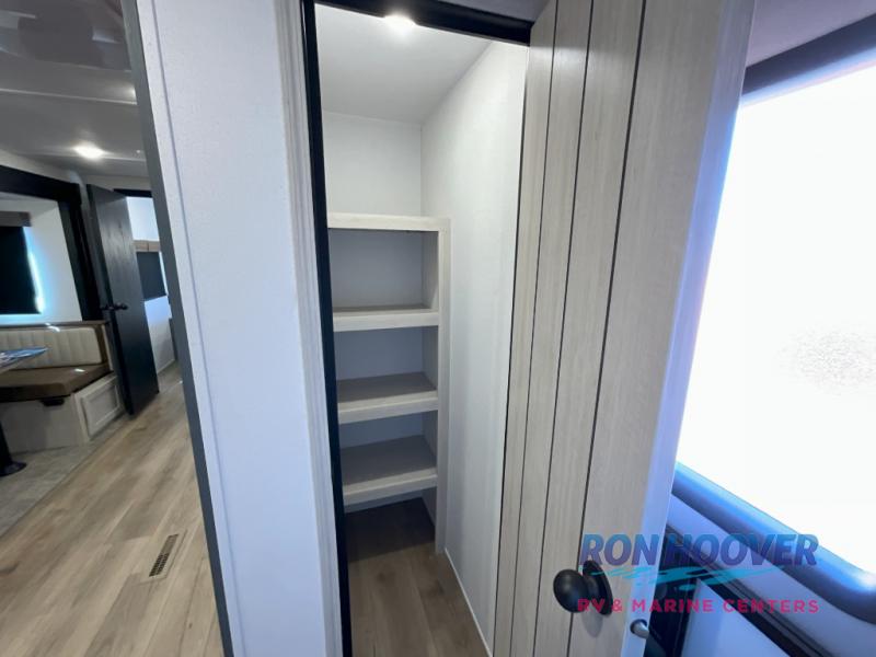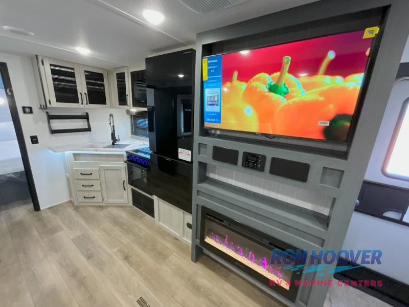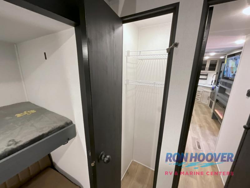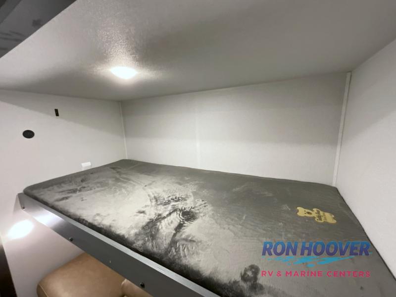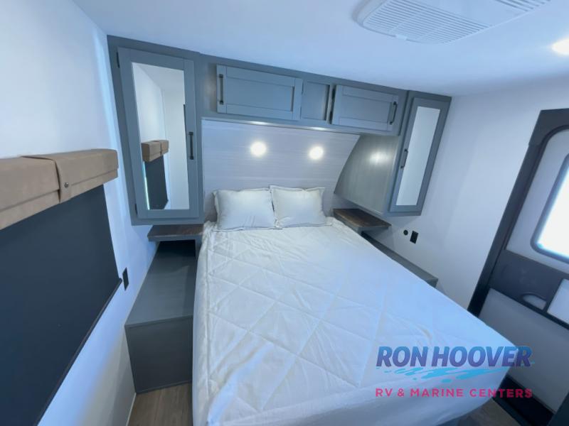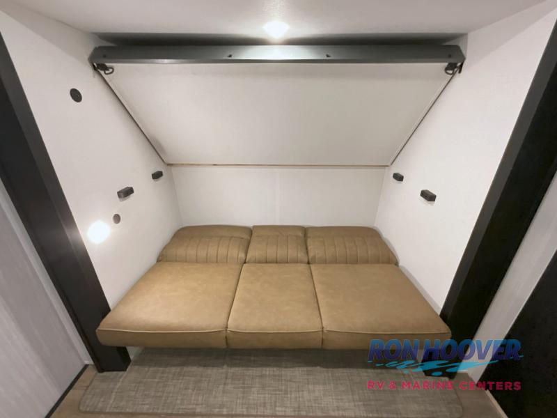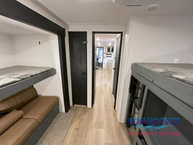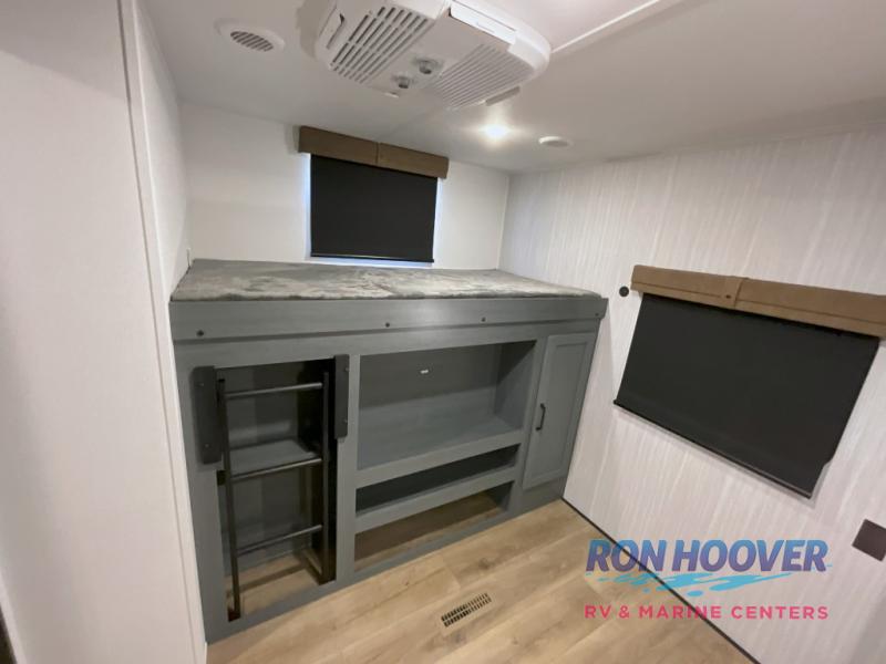 The kids will love having their own rear private bunkhouse in this travel trailer! Inside the bunkhouse is a 38" x 76" bunk above an entertainment center, a closet, and a 32" x 69" bunk above a jiffy sofa slide. The full bathroom with a 34" x 34" radius shower is just outside the bunkhouse for them to easily access it at night. They can even invite a friend or two to tag along and sleep on the sofa and U-shaped dinette once converted. Behind the entertainment center is a closet/pantry to keep your favorite snacks and the kitchen has a 12V refrigerator to keep your beverages cold. When you're ready to wind down your nights, head to the front private bedroom and relax on the queen bed with shirt closets and nightstands on either side of it, plus it has one of the dual entry doors to the unit! This model also includes two outside kitchen options if you enjoy cooking in the fresh outdoors!