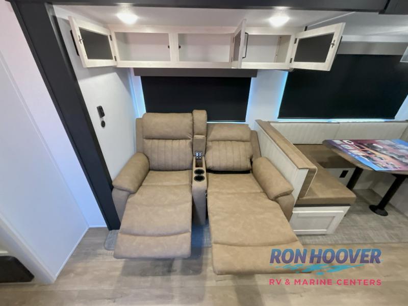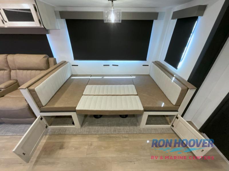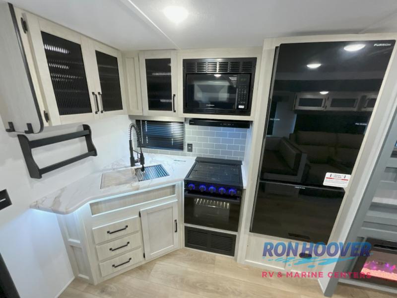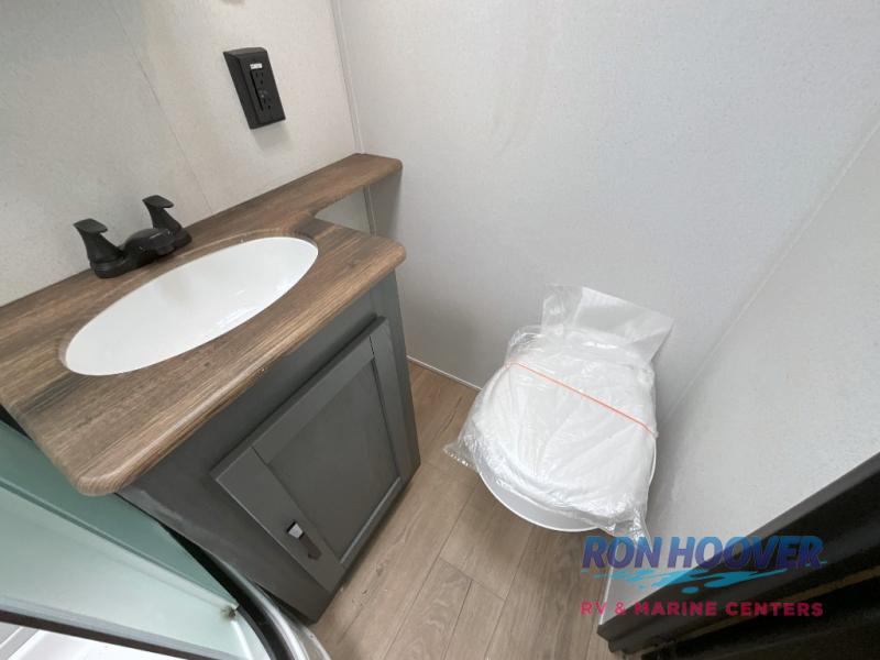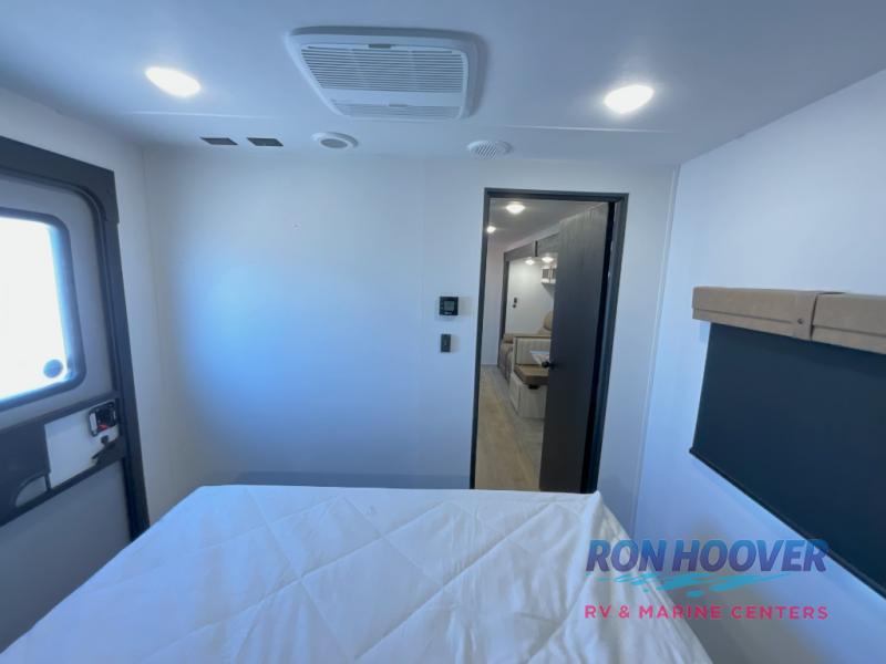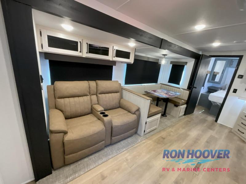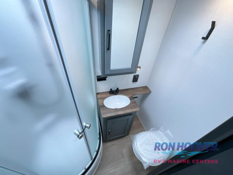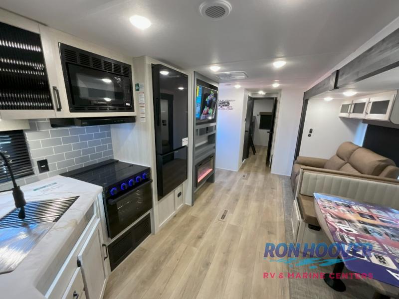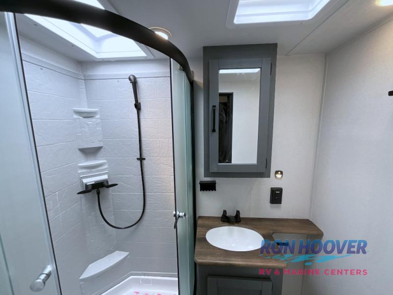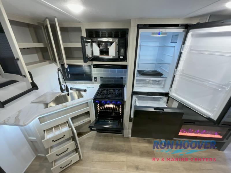 The kids will love having their own rear private bunkhouse in this travel trailer! Inside the bunkhouse is a 38" x 76" bunk above an entertainment center, a closet, and a 32" x 69" bunk above a jiffy sofa slide. The full bathroom with a 34" x 34" radius shower is just outside the bunkhouse for them to easily access it at night. They can even invite a friend or two to tag along and sleep on the sofa and U-shaped dinette once converted. Behind the entertainment center is a closet/pantry to keep your favorite snacks and the kitchen has a 12V refrigerator to keep your beverages cold. When you're ready to wind down your nights, head to the front private bedroom and relax on the queen bed with shirt closets and nightstands on either side of it, plus it has one of the dual entry doors to the unit! This model also includes two outside kitchen options if you enjoy cooking in the fresh outdoors!