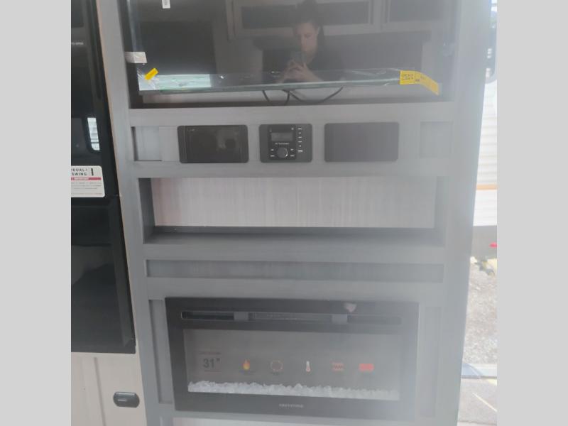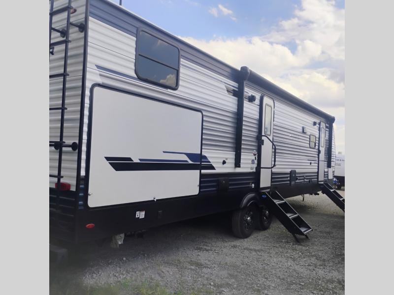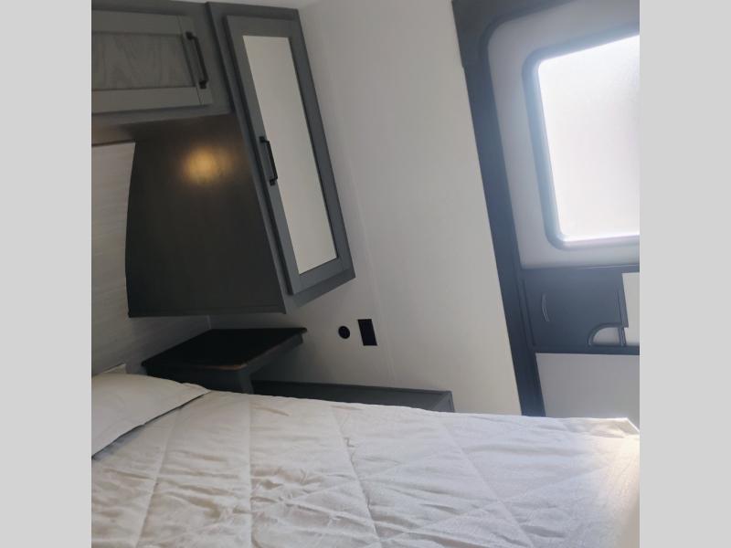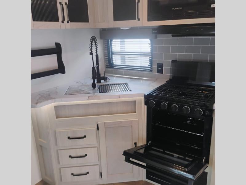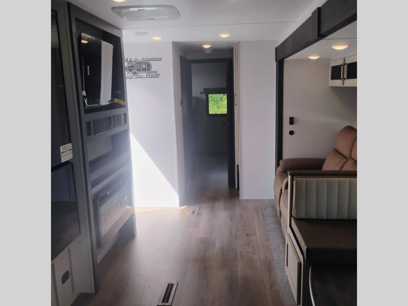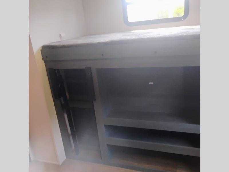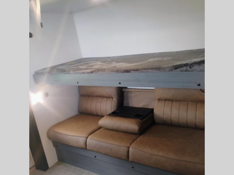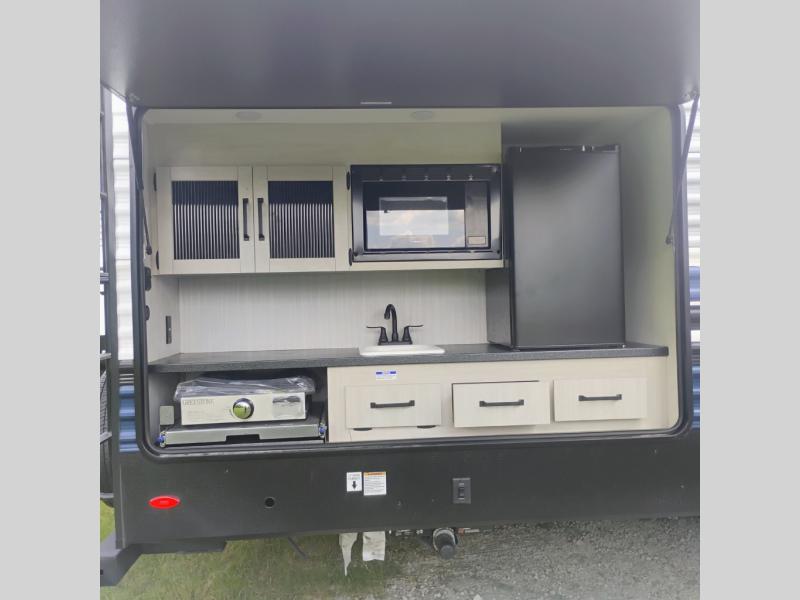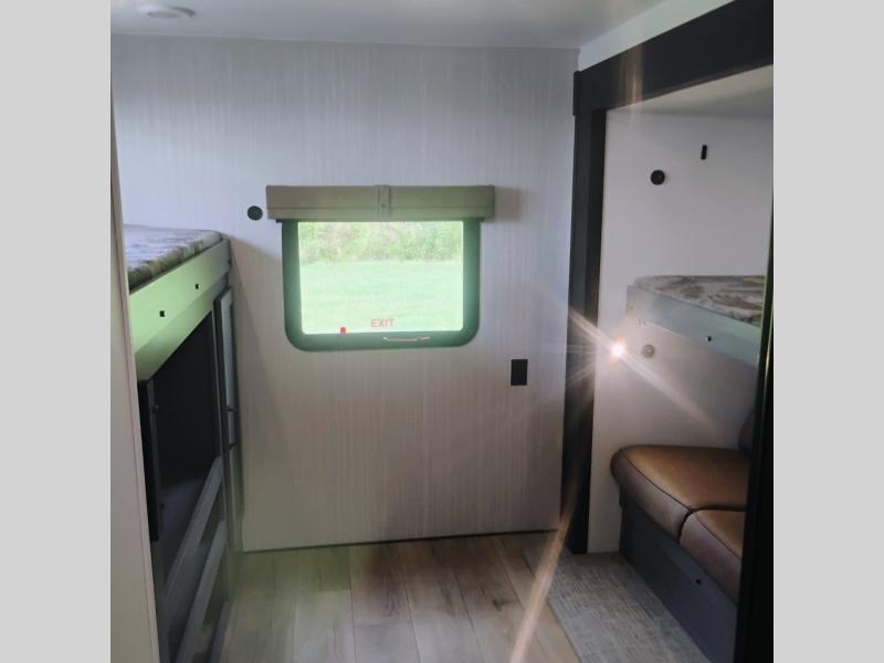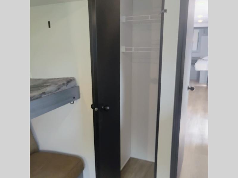 The kids will love having their own rear private bunkhouse in this travel trailer! Inside the bunkhouse is a 38" x 76" bunk above an entertainment center, a closet, and a 32" x 69" bunk above a jiffy sofa slide. The full bathroom with a 34" x 34" radius shower is just outside the bunkhouse for them to easily access it at night. They can even invite a friend or two to tag along and sleep on the sofa and U-shaped dinette once converted. Behind the entertainment center is a closet/pantry to keep your favorite snacks and the kitchen has a 12V refrigerator to keep your beverages cold. When you're ready to wind down your nights, head to the front private bedroom and relax on the queen bed with shirt closets and nightstands on either side of it, plus it has one of the dual entry doors to the unit! This model also includes two outside kitchen options if you enjoy cooking in the fresh outdoors!