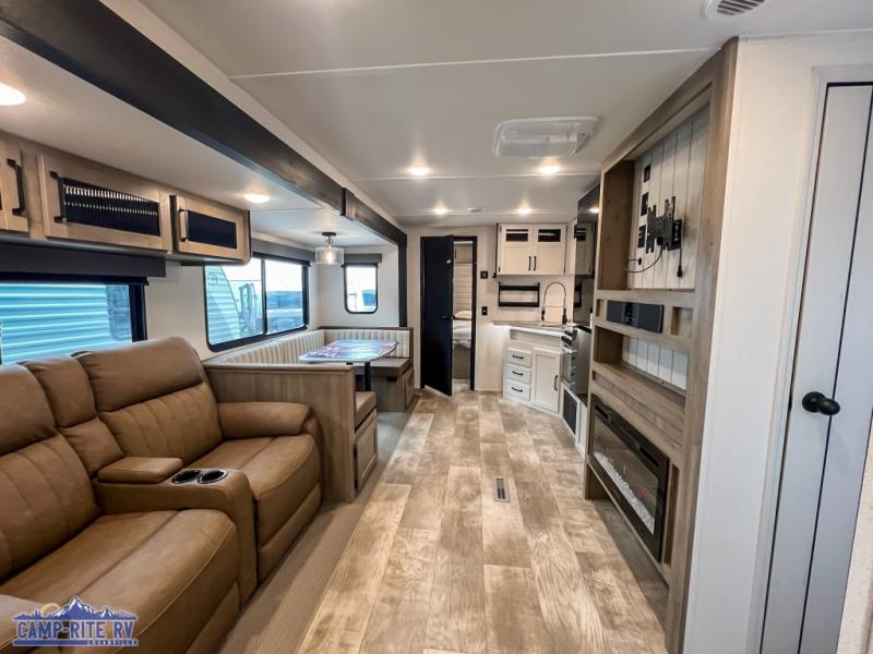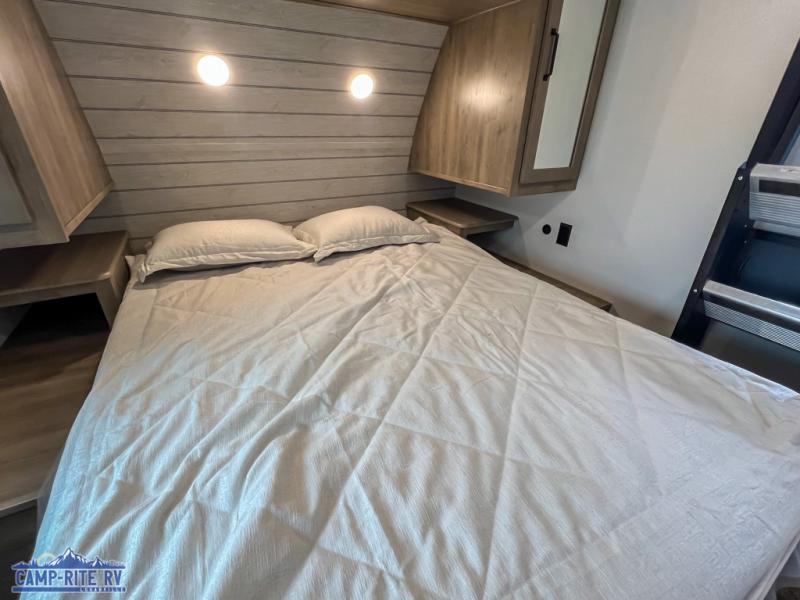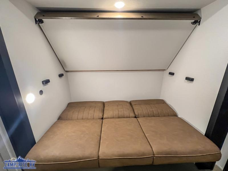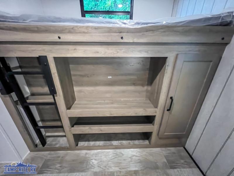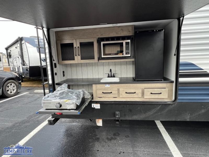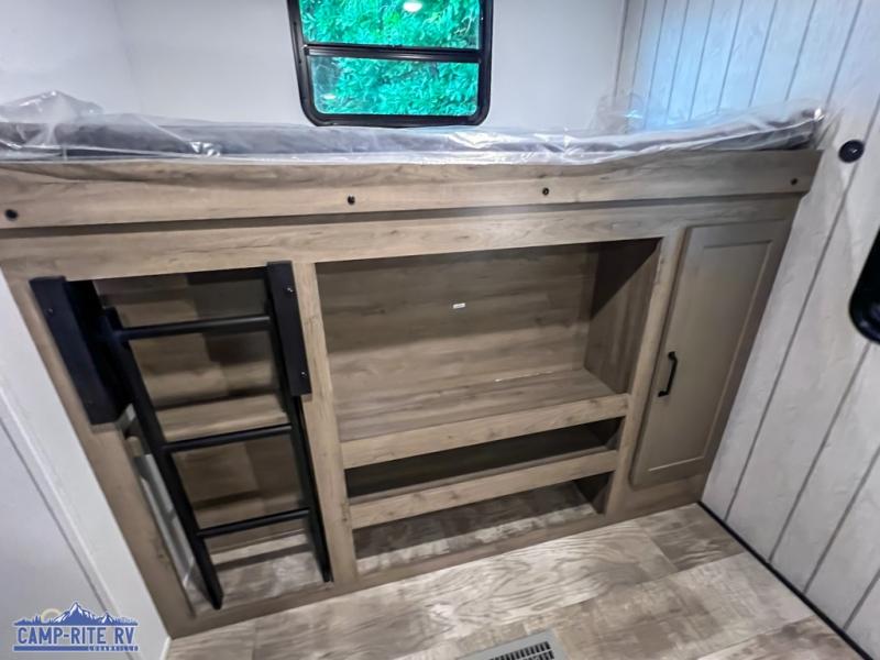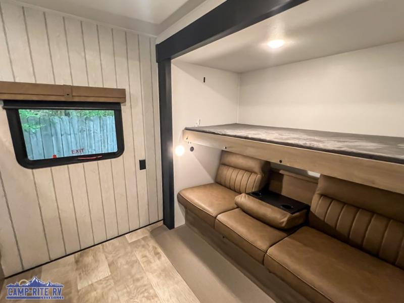 The kids will love having their own rear private bunkhouse in this travel trailer! Inside the bunkhouse is a 38" x 76" bunk above an entertainment center, a closet, and a 32" x 69" bunk above a jiffy sofa slide. The full bathroom with a 34" x 34" radius shower is just outside the bunkhouse for them to easily access it at night. They can even invite a friend or two to tag along and sleep on the sofa and U-shaped dinette once converted. Behind the entertainment center is a closet/pantry to keep your favorite snacks and the kitchen has a 12V refrigerator to keep your beverages cold. When you're ready to wind down your nights, head to the front private bedroom and relax on the queen bed with shirt closets and nightstands on either side of it, plus it has one of the dual entry doors to the unit! This model also includes two outside kitchen options if you enjoy cooking in the fresh outdoors!
