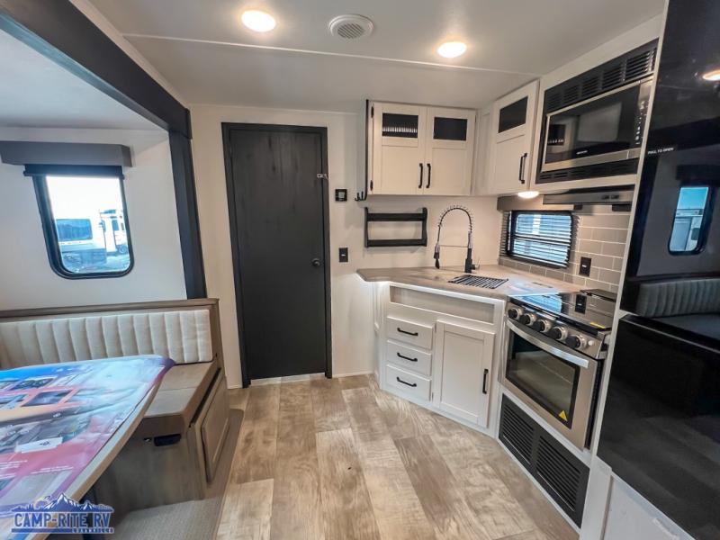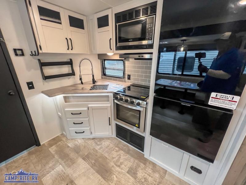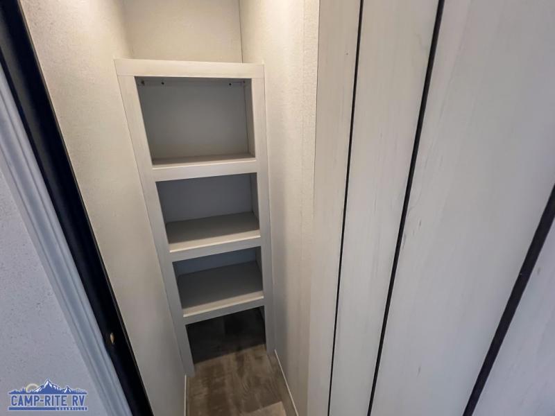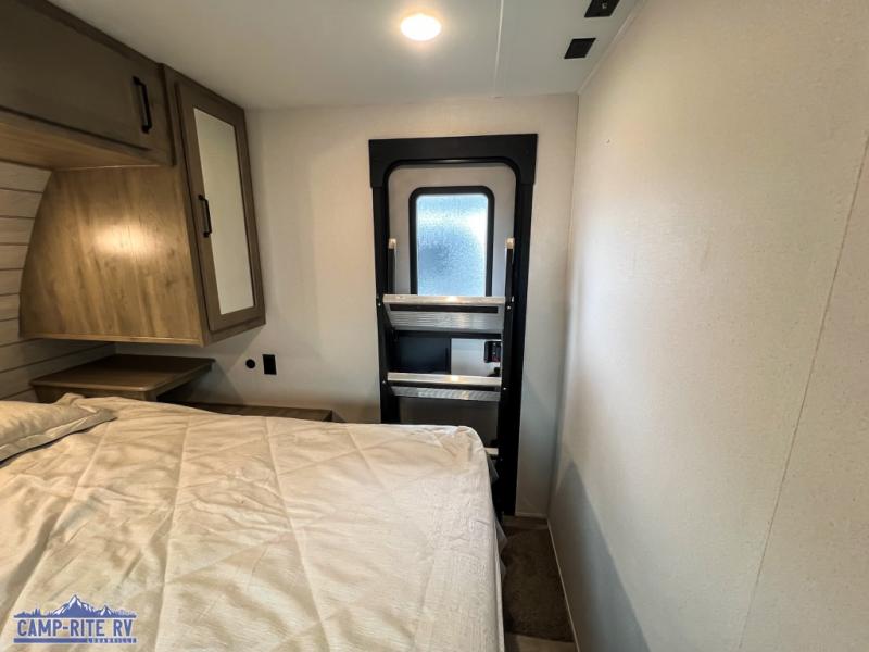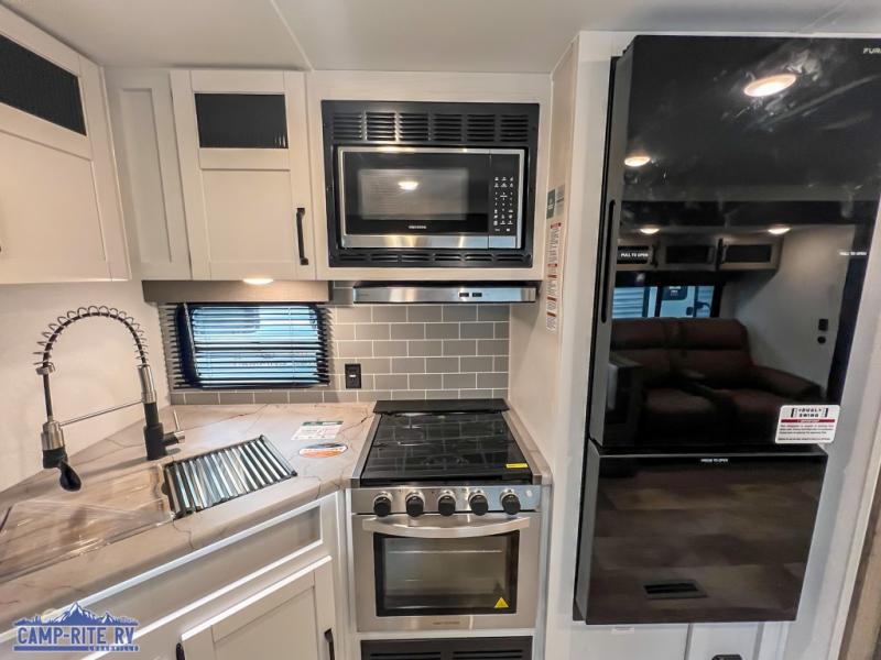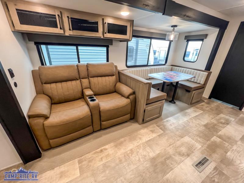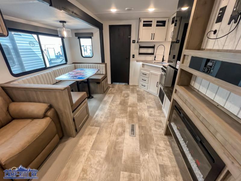 The kids will love having their own rear private bunkhouse in this travel trailer! Inside the bunkhouse is a 38" x 76" bunk above an entertainment center, a closet, and a 32" x 69" bunk above a jiffy sofa slide. The full bathroom with a 34" x 34" radius shower is just outside the bunkhouse for them to easily access it at night. They can even invite a friend or two to tag along and sleep on the sofa and U-shaped dinette once converted. Behind the entertainment center is a closet/pantry to keep your favorite snacks and the kitchen has a 12V refrigerator to keep your beverages cold. When you're ready to wind down your nights, head to the front private bedroom and relax on the queen bed with shirt closets and nightstands on either side of it, plus it has one of the dual entry doors to the unit! This model also includes two outside kitchen options if you enjoy cooking in the fresh outdoors!