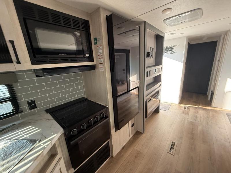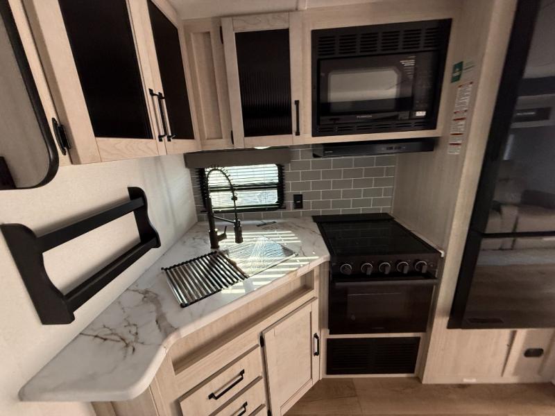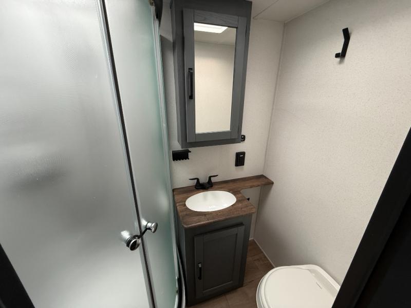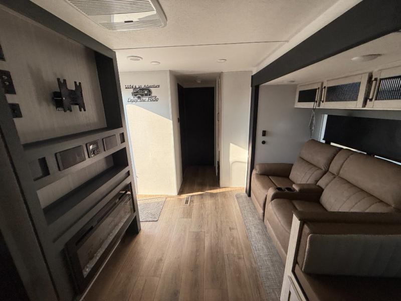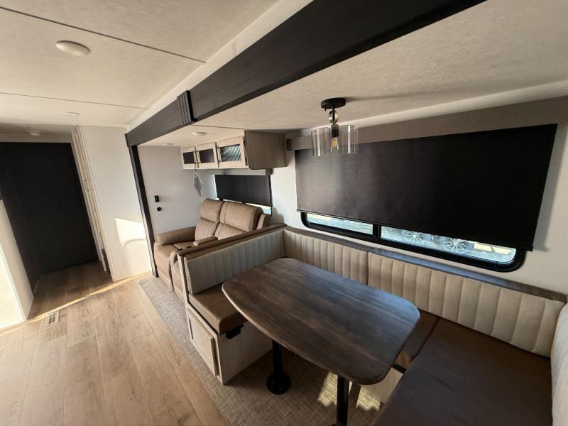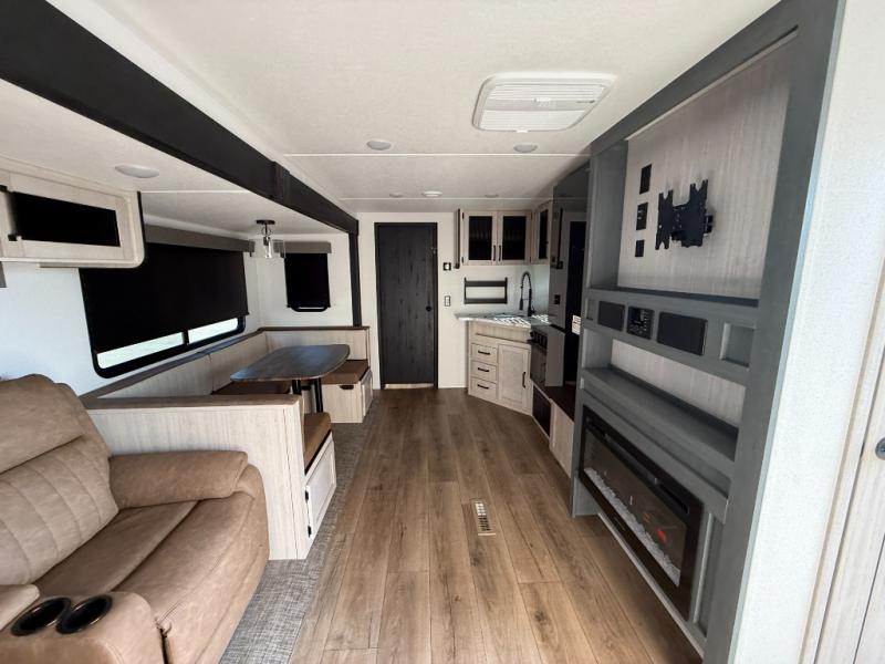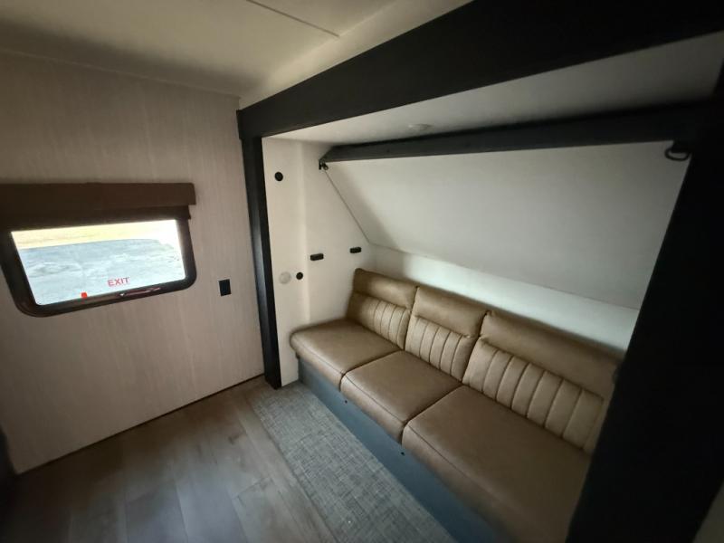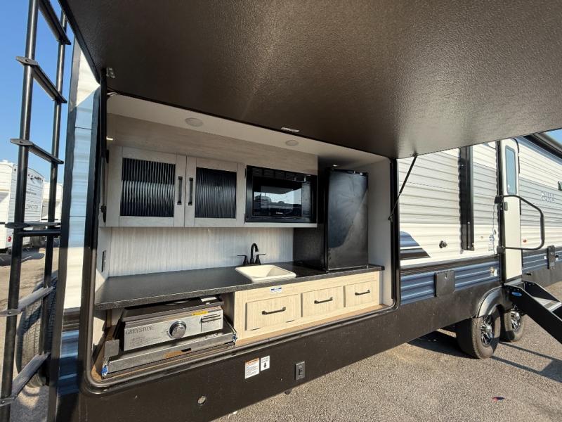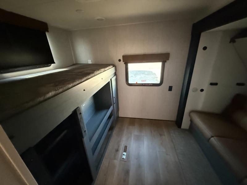 The kids will love having their own rear private bunkhouse in this travel trailer! Inside the bunkhouse is a 38" x 76" bunk above an entertainment center, a closet, and a 32" x 69" bunk above a jiffy sofa slide. The full bathroom with a 34" x 34" radius shower is just outside the bunkhouse for them to easily access it at night. They can even invite a friend or two to tag along and sleep on the sofa and U-shaped dinette once converted. Behind the entertainment center is a closet/pantry to keep your favorite snacks and the kitchen has a 12V refrigerator to keep your beverages cold. When you're ready to wind down your nights, head to the front private bedroom and relax on the queen bed with shirt closets and nightstands on either side of it, plus it has one of the dual entry doors to the unit! This model also includes two outside kitchen options if you enjoy cooking in the fresh outdoors!
