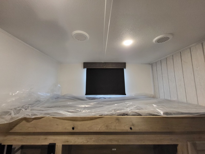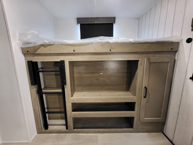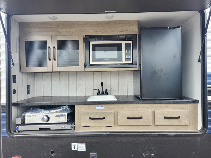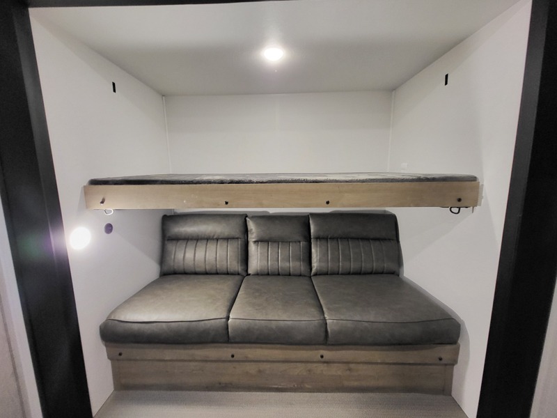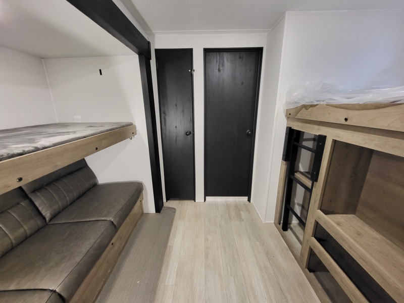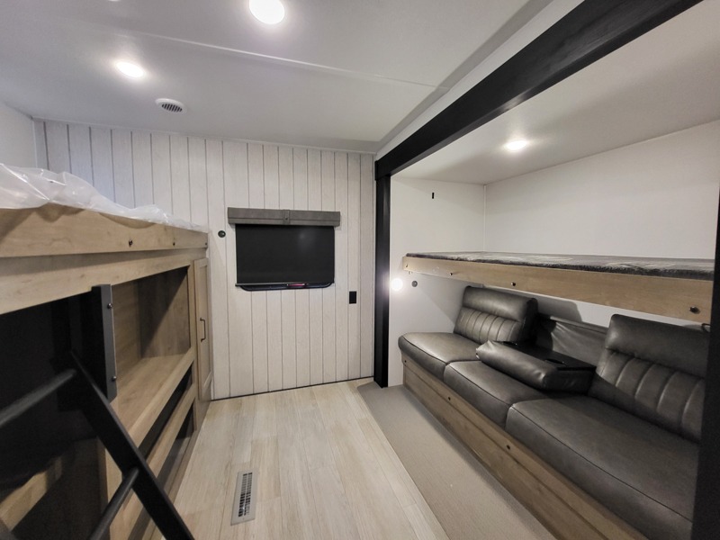 The kids will love having their own rear private bunkhouse in this travel trailer! Inside the bunkhouse is a 38" x 76" bunk above an entertainment center, a closet, and a 32" x 69" bunk above a jiffy sofa slide. The full bathroom with a 34" x 34" radius shower is just outside the bunkhouse for them to easily access it at night. They can even invite a friend or two to tag along and sleep on the sofa and U-shaped dinette once converted. Behind the entertainment center is a closet/pantry to keep your favorite snacks and the kitchen has a 12V refrigerator to keep your beverages cold. When you're ready to wind down your nights, head to the front private bedroom and relax on the queen bed with shirt closets and nightstands on either side of it, plus it has one of the dual entry doors to the unit! This model also includes two outside kitchen options if you enjoy cooking in the fresh outdoors!