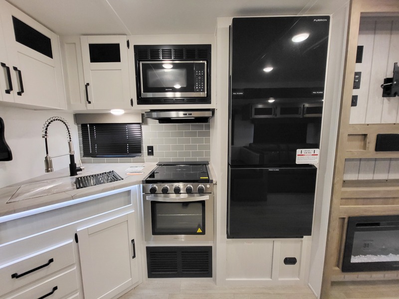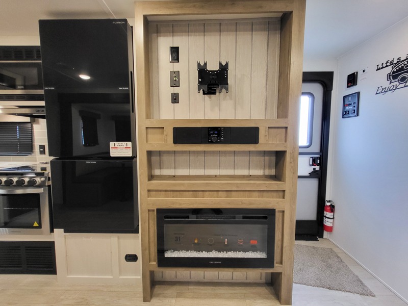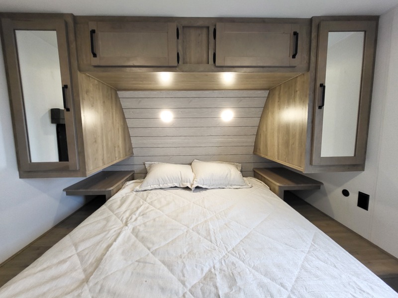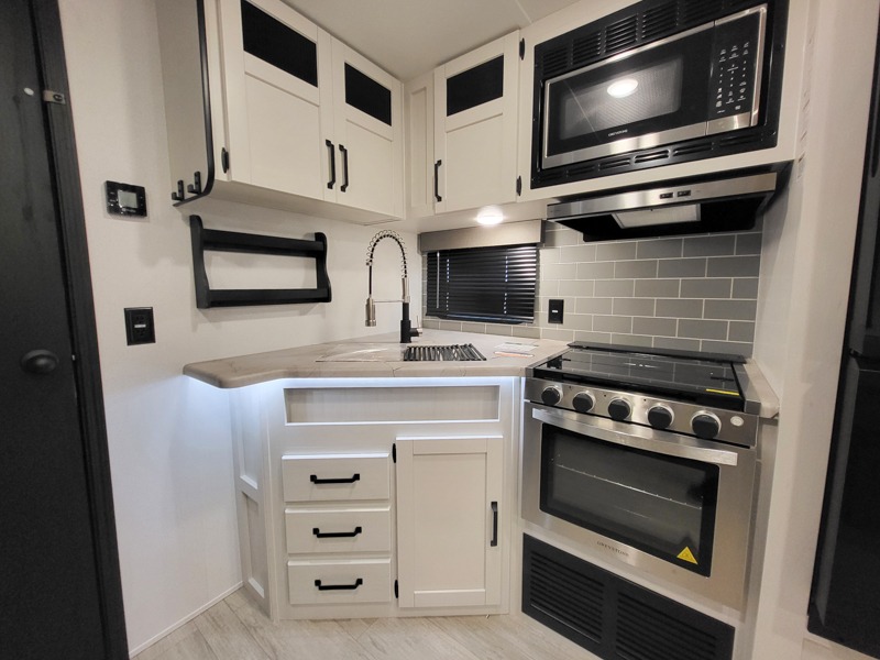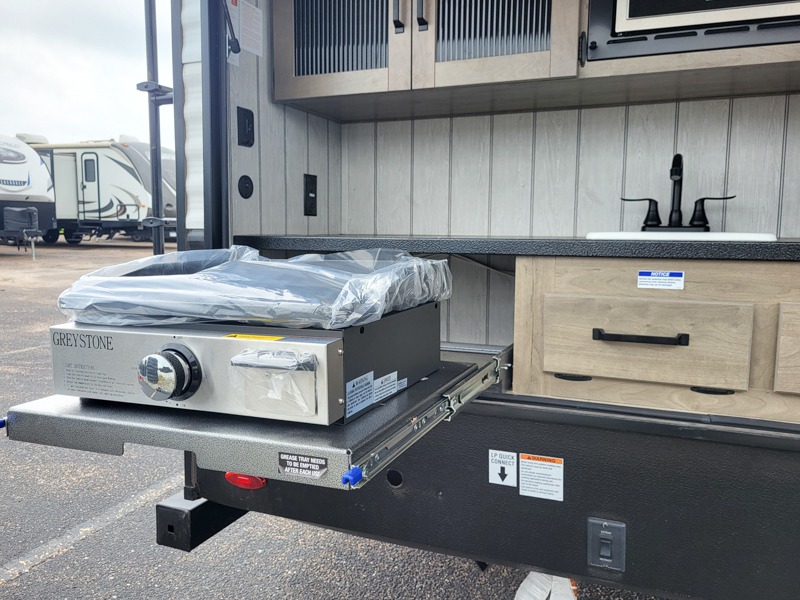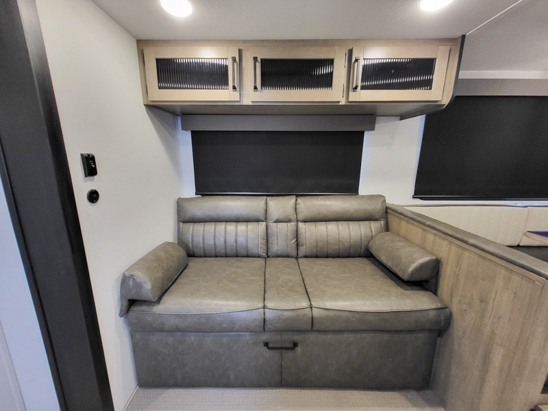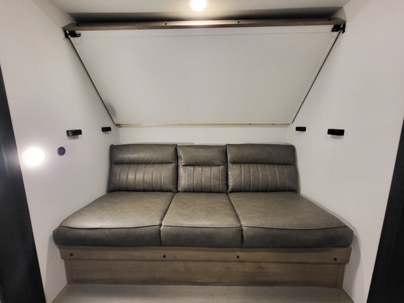 The kids will love having their own rear private bunkhouse in this travel trailer! Inside the bunkhouse is a 38" x 76" bunk above an entertainment center, a closet, and a 32" x 69" bunk above a jiffy sofa slide. The full bathroom with a 34" x 34" radius shower is just outside the bunkhouse for them to easily access it at night. They can even invite a friend or two to tag along and sleep on the sofa and U-shaped dinette once converted. Behind the entertainment center is a closet/pantry to keep your favorite snacks and the kitchen has a 12V refrigerator to keep your beverages cold. When you're ready to wind down your nights, head to the front private bedroom and relax on the queen bed with shirt closets and nightstands on either side of it, plus it has one of the dual entry doors to the unit! This model also includes two outside kitchen options if you enjoy cooking in the fresh outdoors!
