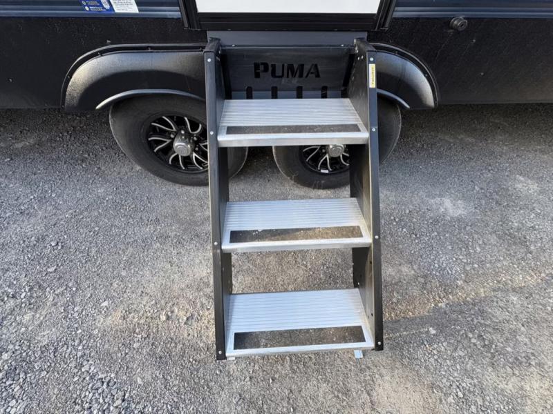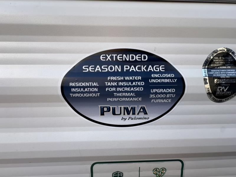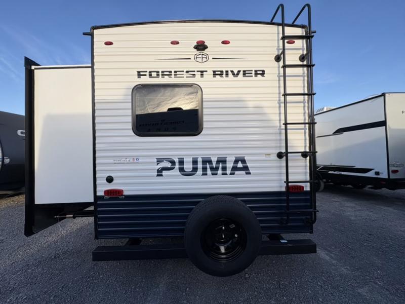 If you're looking for family-fun adventures, then you need one of these Forest River Puma travel trailers! They are built rugged, easy to tow, and jam packed with features. The Darco wrapped underbelly will help protect your unit, and the roof and side mount solar prep gives you the option to add off-grid power. Inside, the Congoleum linoleum will be easy to keep clean, and the night roller shades will provide privacy when it's time to turn in. You'll also enjoy an electric awning with an LED light strip plus an AM/FM/Bluetooth stereo and two outside speakers to keep the party going!