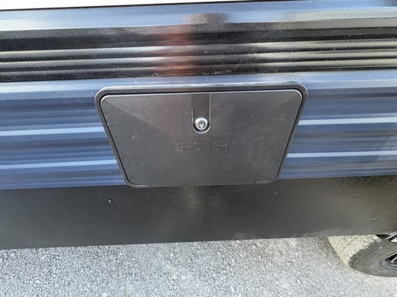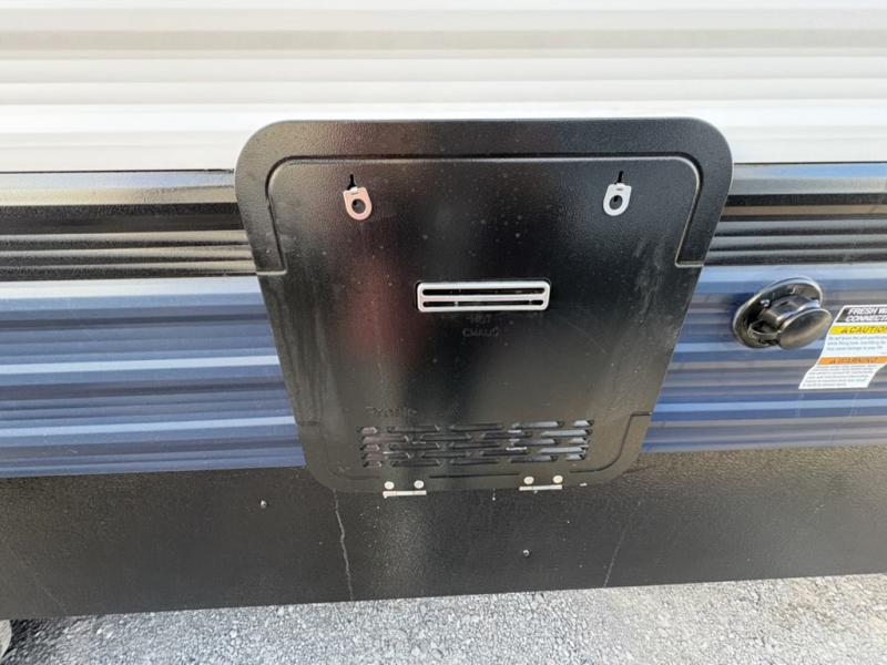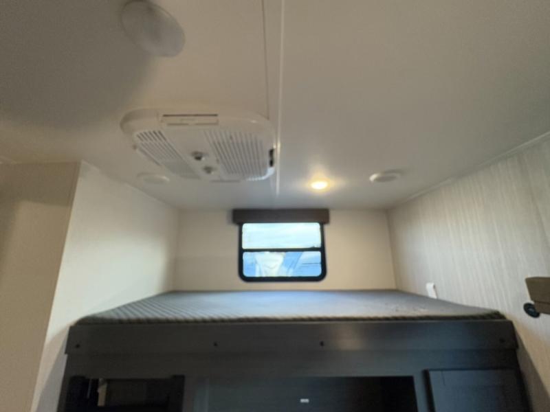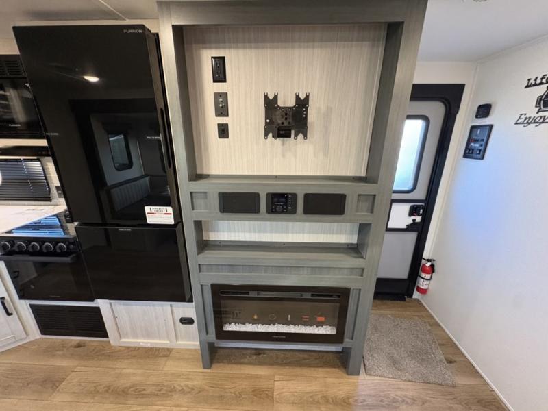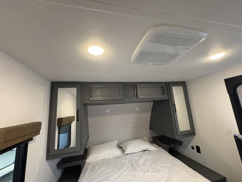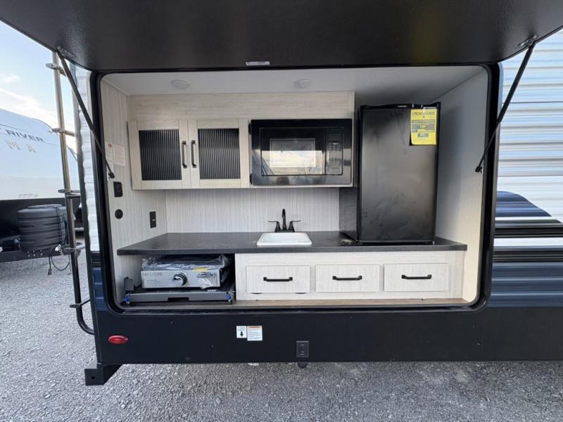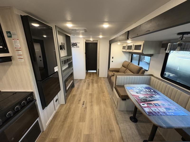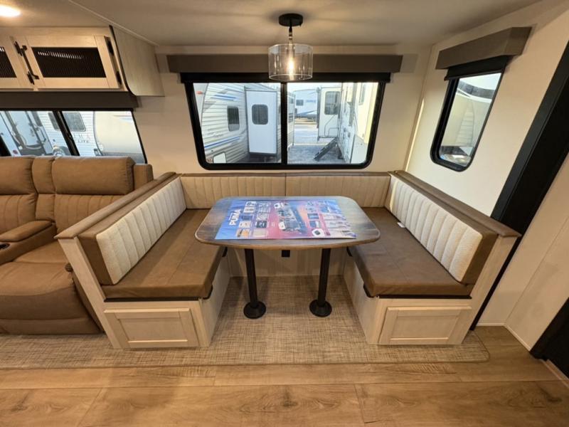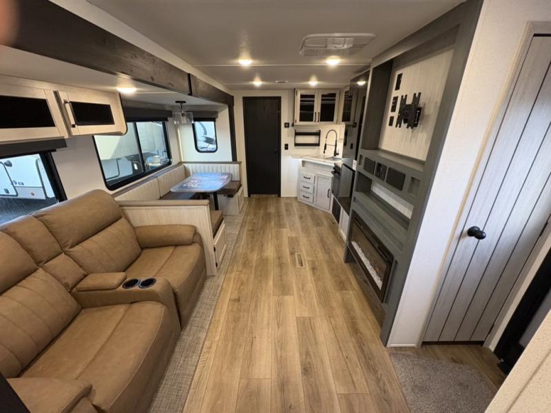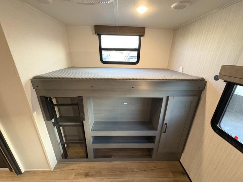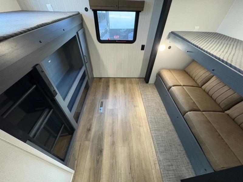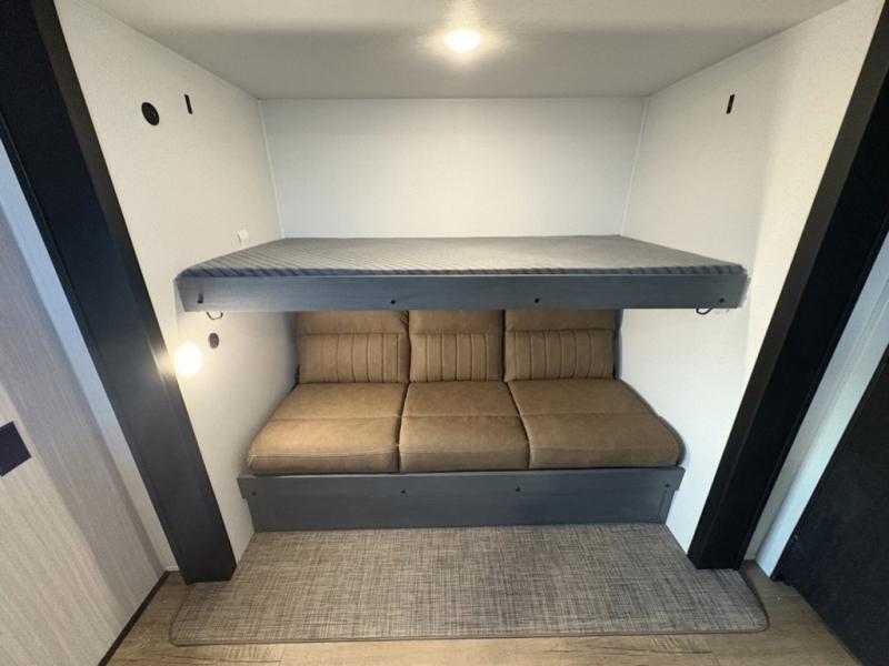 The kids will love having their own rear private bunkhouse in this travel trailer! Inside the bunkhouse is a 38" x 76" bunk above an entertainment center, a closet, and a 32" x 69" bunk above a jiffy sofa slide. The full bathroom with a 34" x 34" radius shower is just outside the bunkhouse for them to easily access it at night. They can even invite a friend or two to tag along and sleep on the sofa and U-shaped dinette once converted. Behind the entertainment center is a closet/pantry to keep your favorite snacks and the kitchen has a 12V refrigerator to keep your beverages cold. When you're ready to wind down your nights, head to the front private bedroom and relax on the queen bed with shirt closets and nightstands on either side of it, plus it has one of the dual entry doors to the unit! This model also has an outside kitchen option if you enjoy cooking in the fresh outdoors!