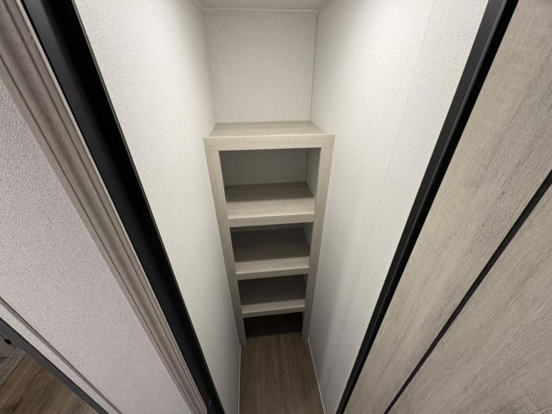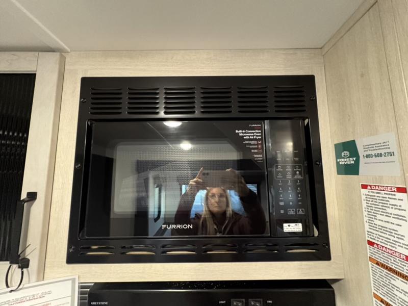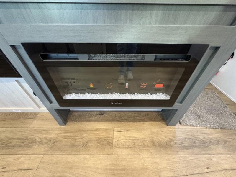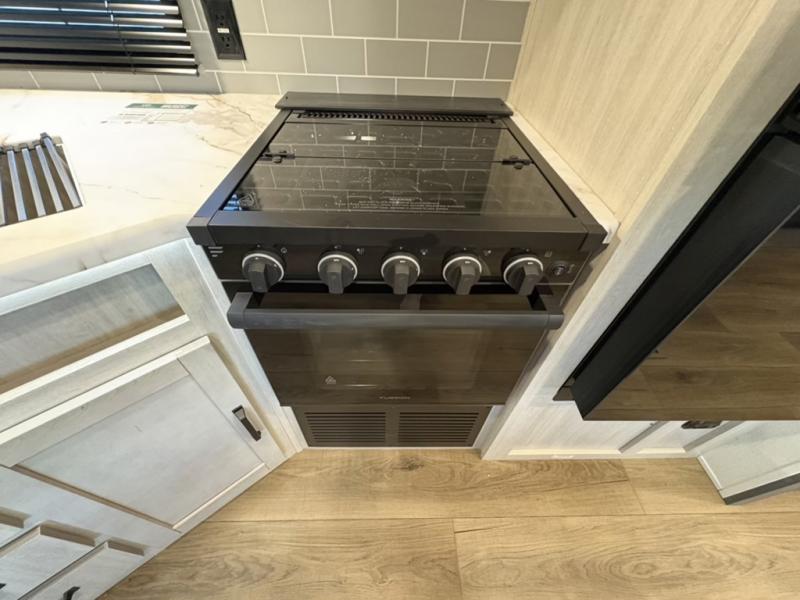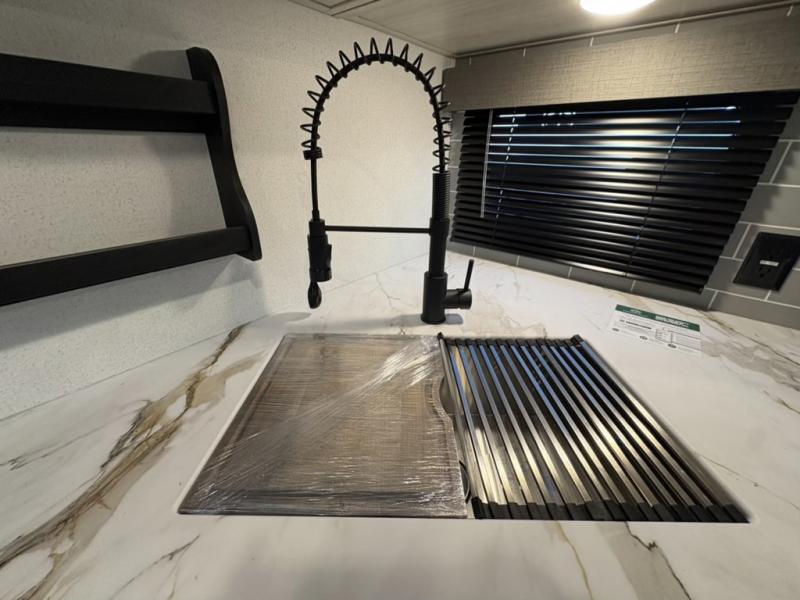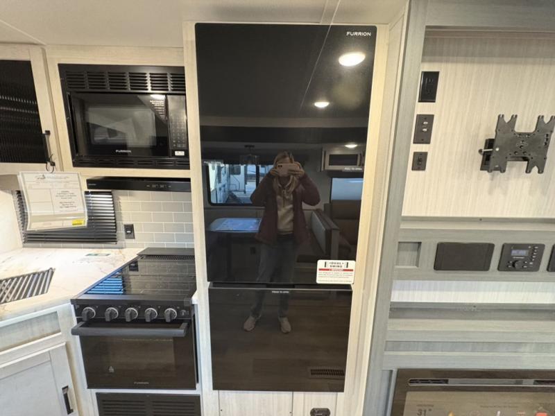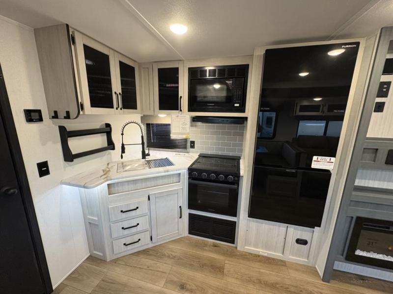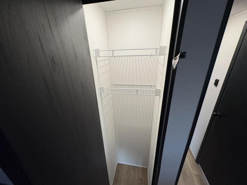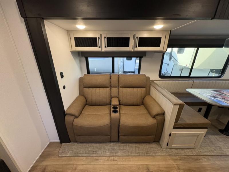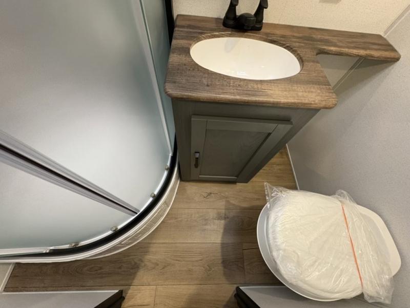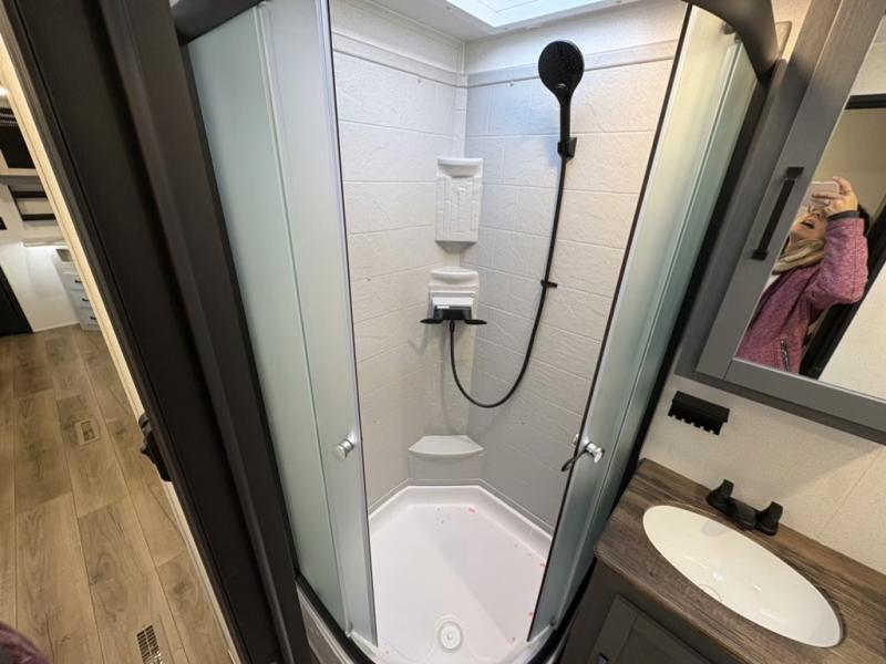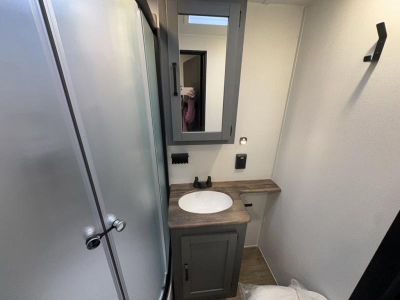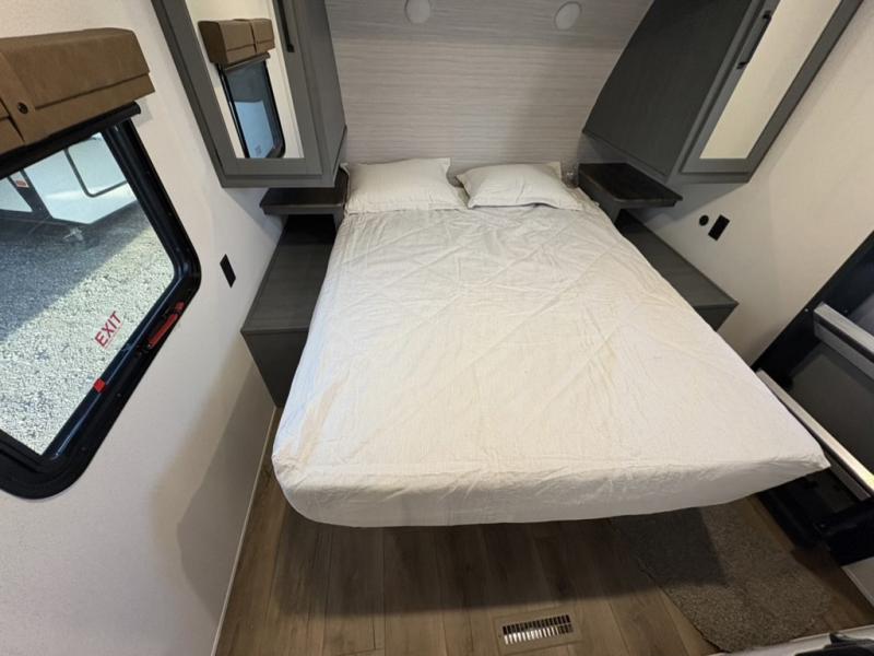 The kids will love having their own rear private bunkhouse in this travel trailer! Inside the bunkhouse is a 38" x 76" bunk above an entertainment center, a closet, and a 32" x 69" bunk above a jiffy sofa slide. The full bathroom with a 34" x 34" radius shower is just outside the bunkhouse for them to easily access it at night. They can even invite a friend or two to tag along and sleep on the sofa and U-shaped dinette once converted. Behind the entertainment center is a closet/pantry to keep your favorite snacks and the kitchen has a 12V refrigerator to keep your beverages cold. When you're ready to wind down your nights, head to the front private bedroom and relax on the queen bed with shirt closets and nightstands on either side of it, plus it has one of the dual entry doors to the unit! This model also has an outside kitchen option if you enjoy cooking in the fresh outdoors!