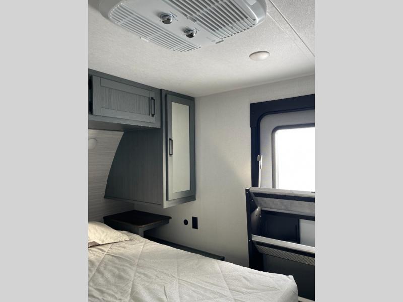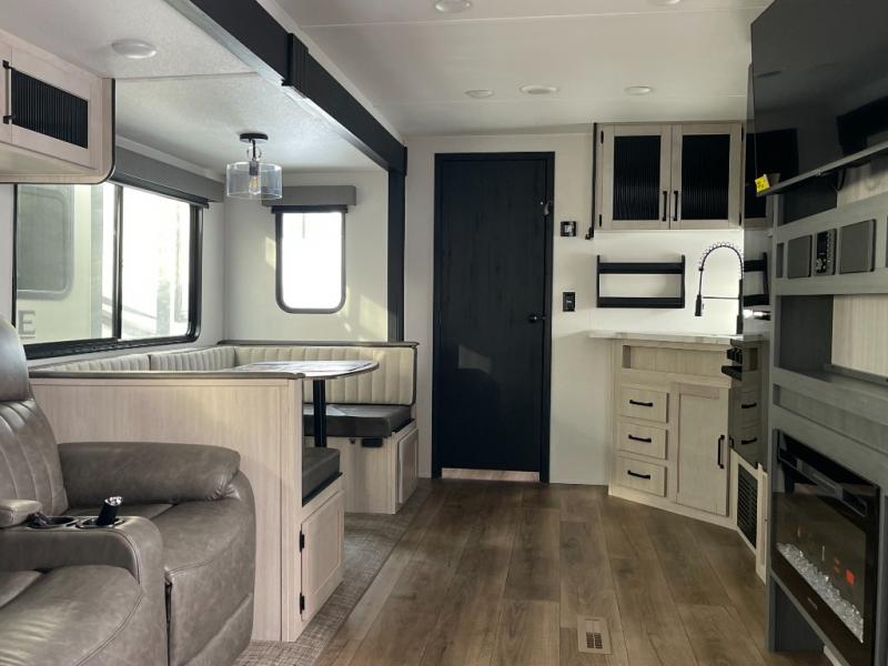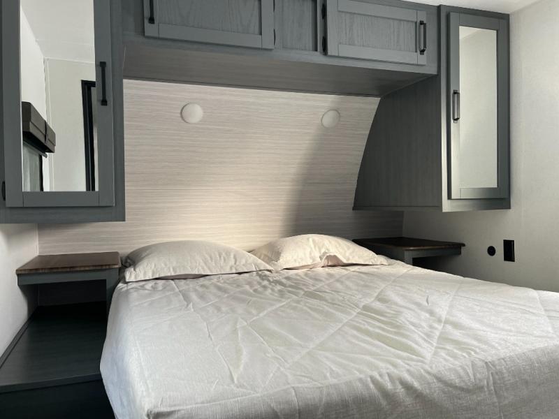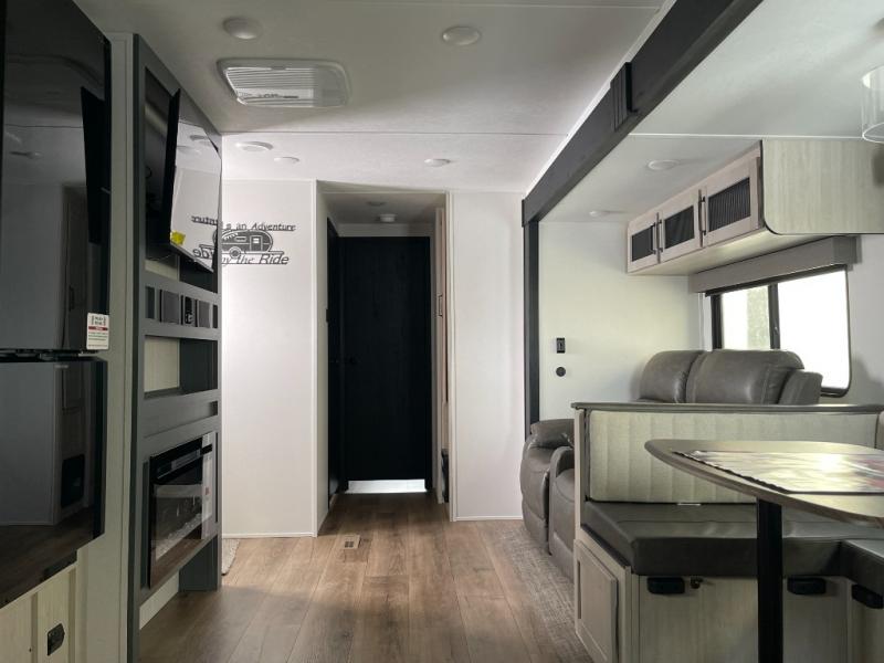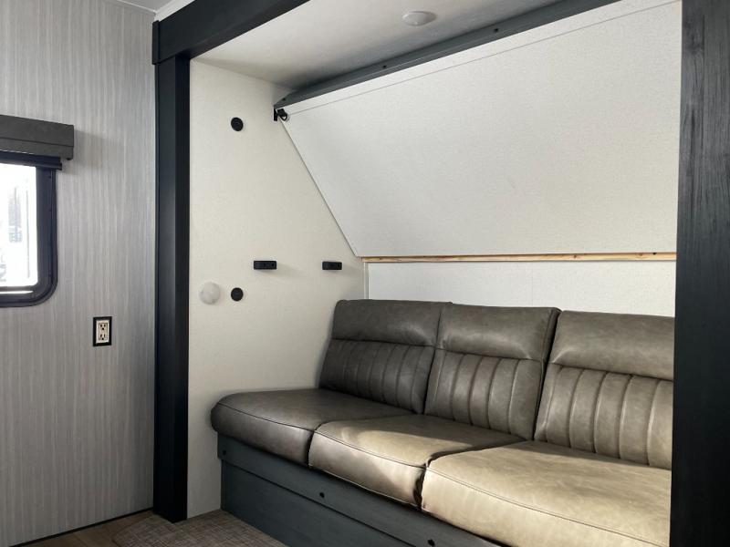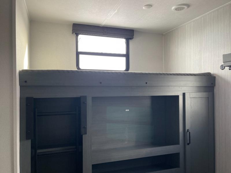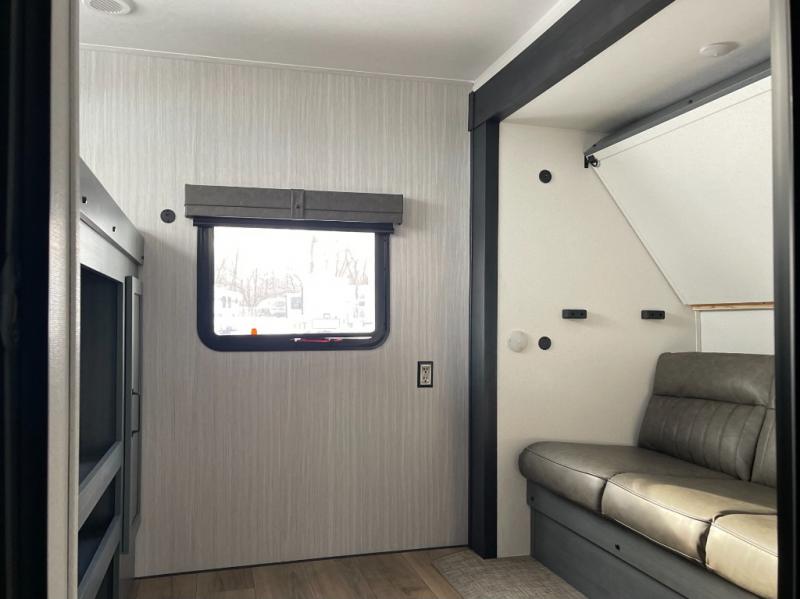 The kids will love having their own rear private bunkhouse in this travel trailer! Inside the bunkhouse is a 38" x 76" bunk above an entertainment center, a closet, and a 32" x 69" bunk above a jiffy sofa slide. The full bathroom with a 34" x 34" radius shower is just outside the bunkhouse for them to easily access it at night. They can even invite a friend or two to tag along and sleep on the sofa and U-shaped dinette once converted. Behind the entertainment center is a closet/pantry to keep your favorite snacks and the kitchen has a 12V refrigerator to keep your beverages cold. When you're ready to wind down your nights, head to the front private bedroom and relax on the queen bed with shirt closets and nightstands on either side of it, plus it has one of the dual entry doors to the unit! This model also has an outside kitchen option if you enjoy cooking in the fresh outdoors!