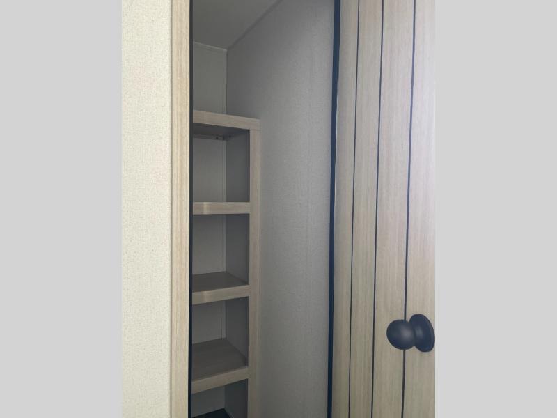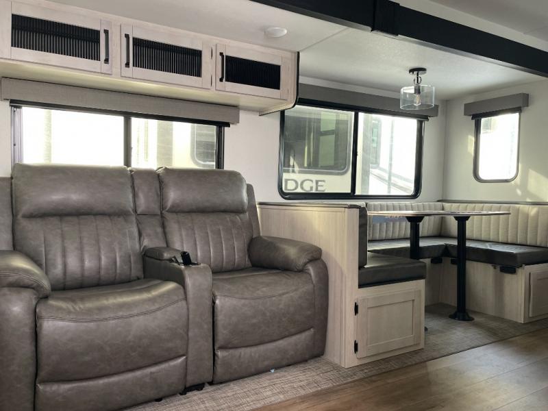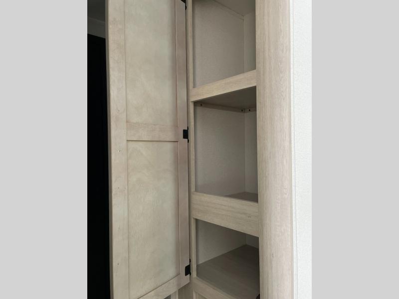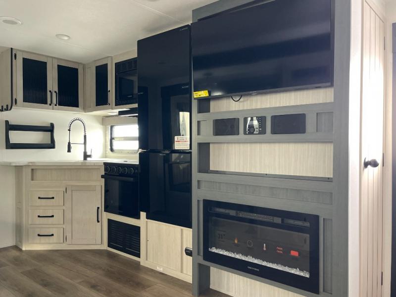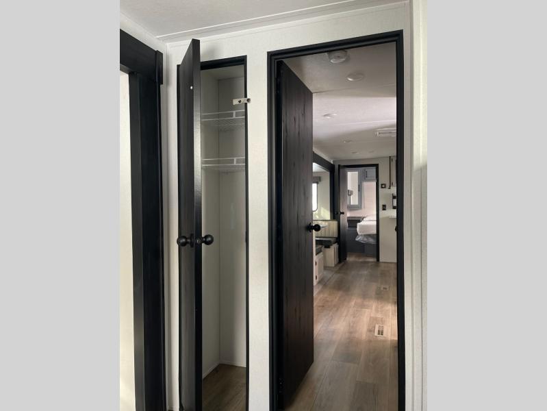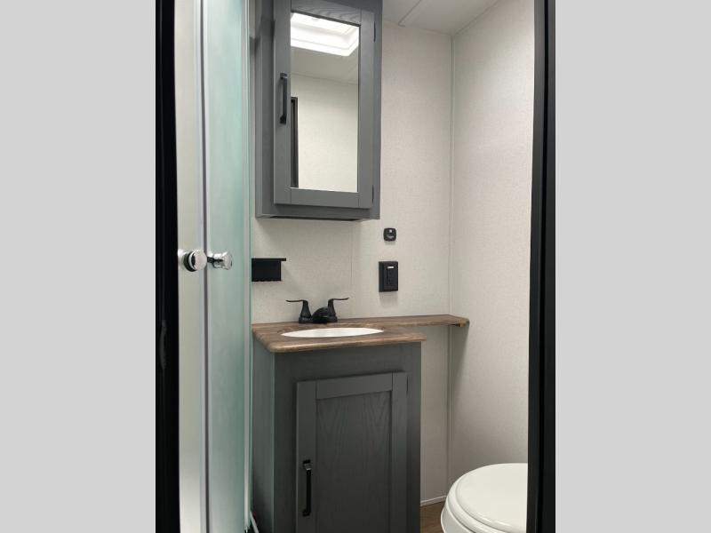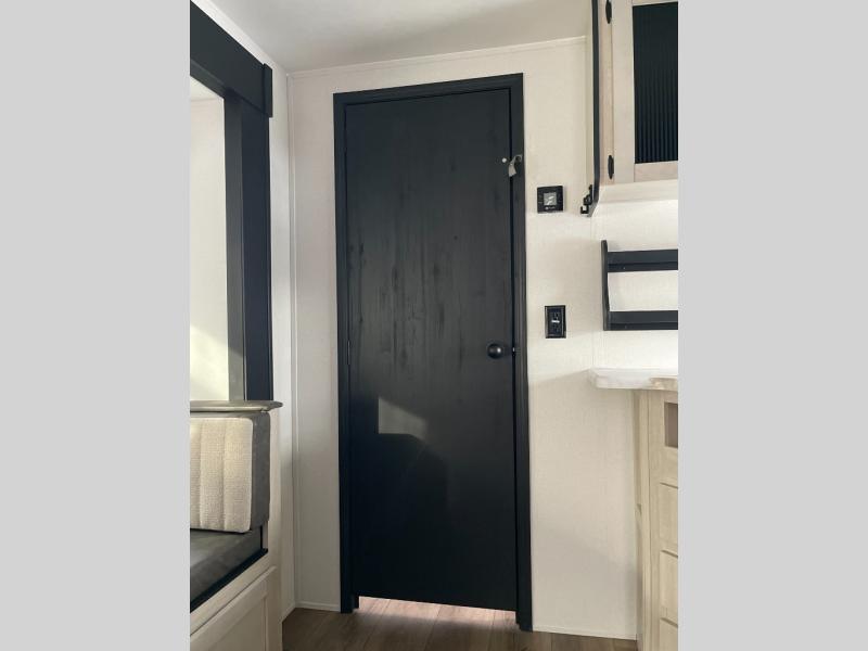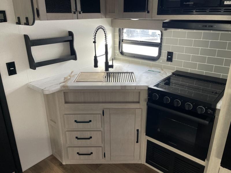 The kids will love having their own rear private bunkhouse in this travel trailer! Inside the bunkhouse is a 38" x 76" bunk above an entertainment center, a closet, and a 32" x 69" bunk above a jiffy sofa slide. The full bathroom with a 34" x 34" radius shower is just outside the bunkhouse for them to easily access it at night. They can even invite a friend or two to tag along and sleep on the sofa and U-shaped dinette once converted. Behind the entertainment center is a closet/pantry to keep your favorite snacks and the kitchen has a 12V refrigerator to keep your beverages cold. When you're ready to wind down your nights, head to the front private bedroom and relax on the queen bed with shirt closets and nightstands on either side of it, plus it has one of the dual entry doors to the unit! This model also has an outside kitchen option if you enjoy cooking in the fresh outdoors!