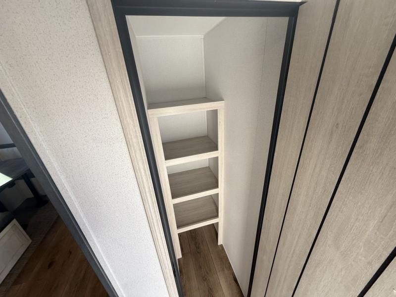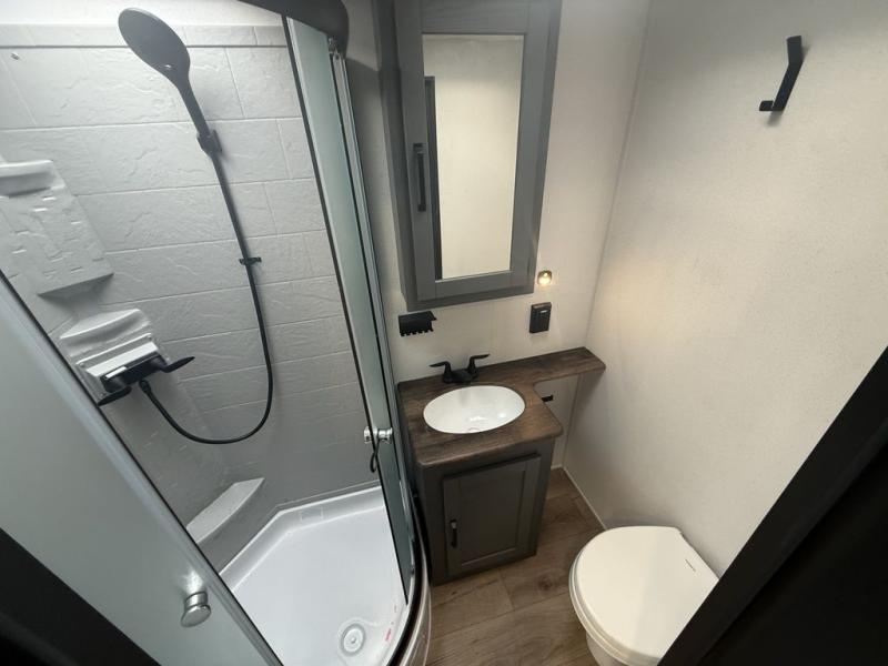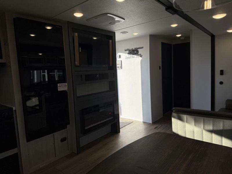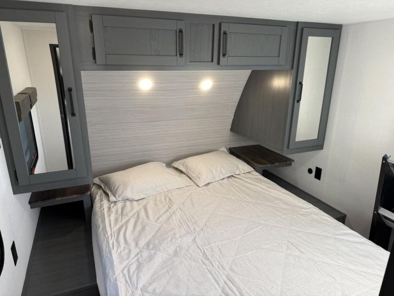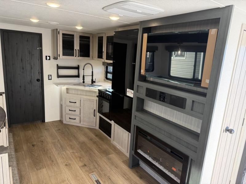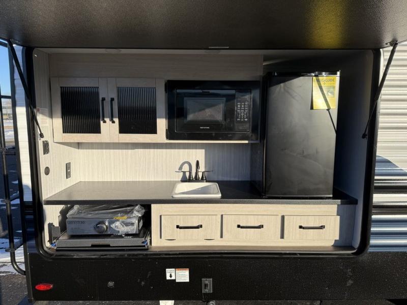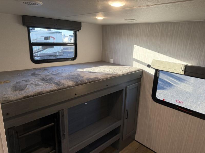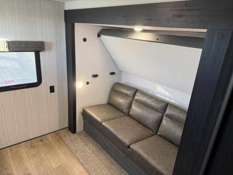 The kids will love having their own rear private bunkhouse in this travel trailer! Inside the bunkhouse is a 38" x 76" bunk above an entertainment center, a closet, and a 32" x 69" bunk above a jiffy sofa slide. The full bathroom with a 34" x 34" radius shower is just outside the bunkhouse for them to easily access it at night. They can even invite a friend or two to tag along and sleep on the sofa and U-shaped dinette once converted. Behind the entertainment center is a closet/pantry to keep your favorite snacks and the kitchen has a 12V refrigerator to keep your beverages cold. When you're ready to wind down your nights, head to the front private bedroom and relax on the queen bed with shirt closets and nightstands on either side of it, plus it has one of the dual entry doors to the unit! This model also has an outside kitchen option if you enjoy cooking in the fresh outdoors!