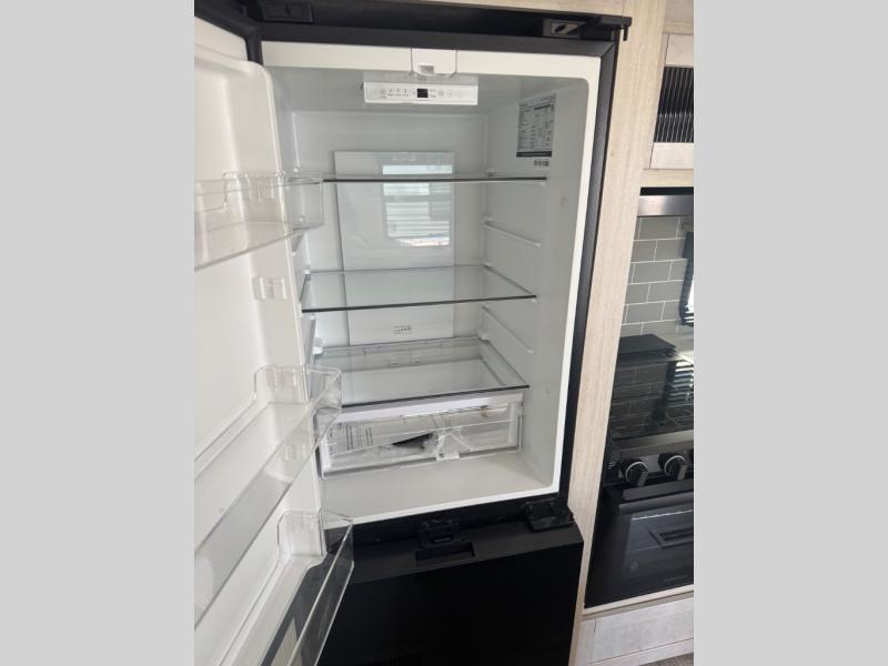 You're going to feel right at home in this travel trailer! The front private bedroom has a queen bed slide for a good night's rest, a dresser and front closet for your clothes, and another closet with washer and dryer prep. Freshen up each morning in the full bathroom with the 32" x 40" shower with a seat and then head to the kitchen to fry up some eggs on the stainless-steel oven and range. You will also appreciate having a kitchen island for easier meal prep and a walk-in pantry to easily see your canned goods and snacks. The booth dinette offers a comfortable place to dine, play, and even sleep once converted. What better way to wind down your nights than to relax on either the rear sofa or on the theater seating across from the entertainment center with a fireplace!