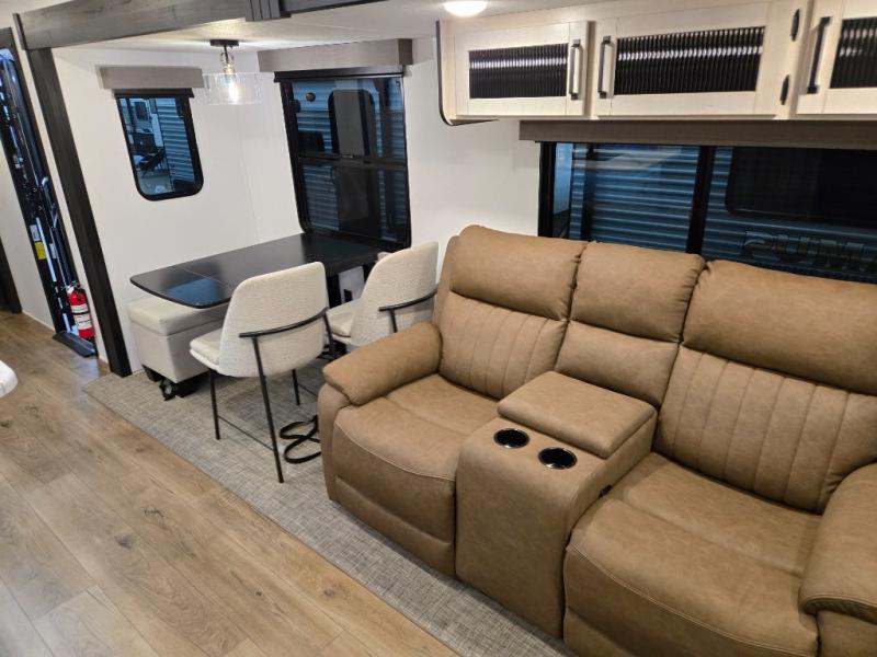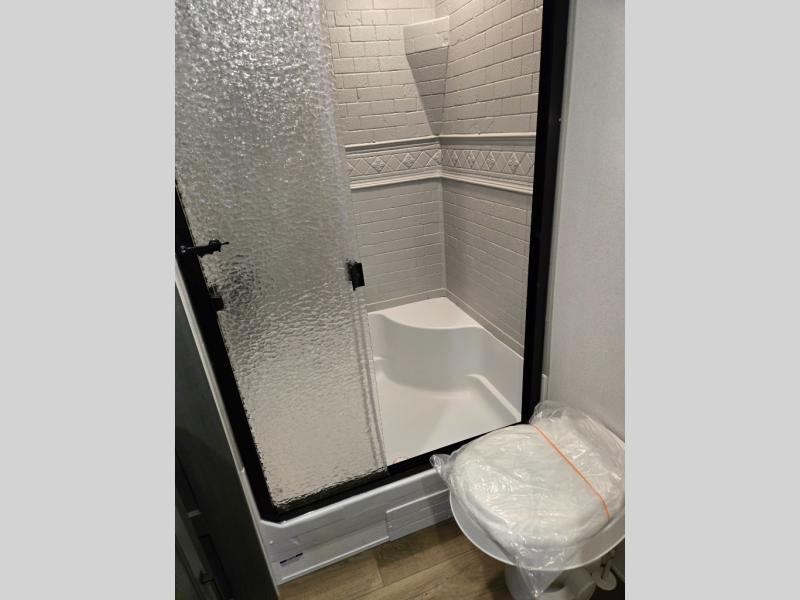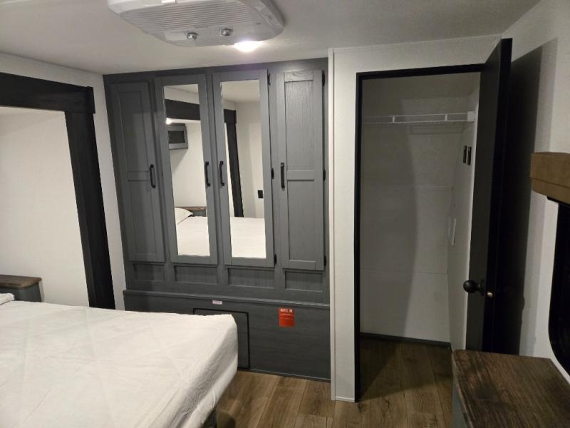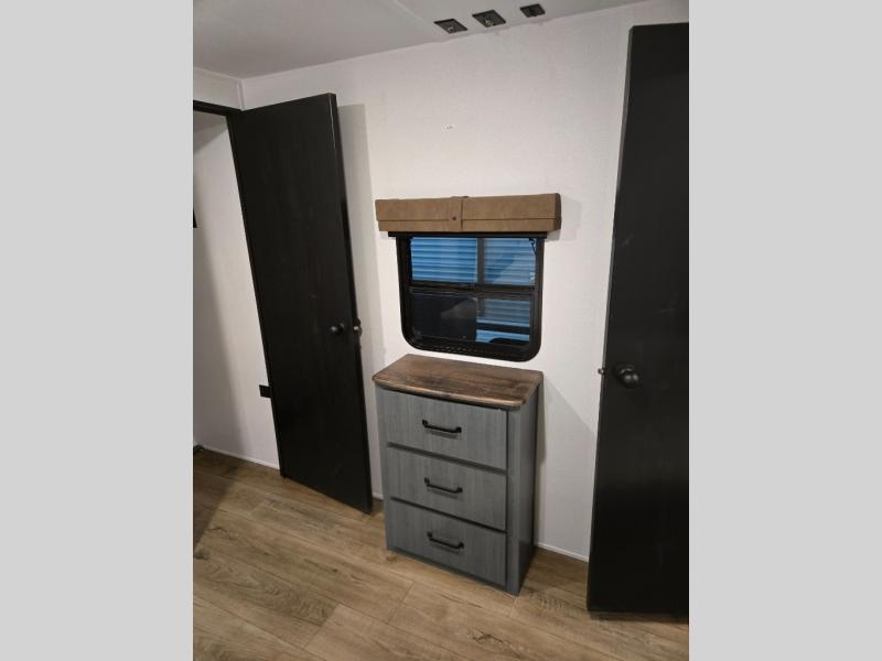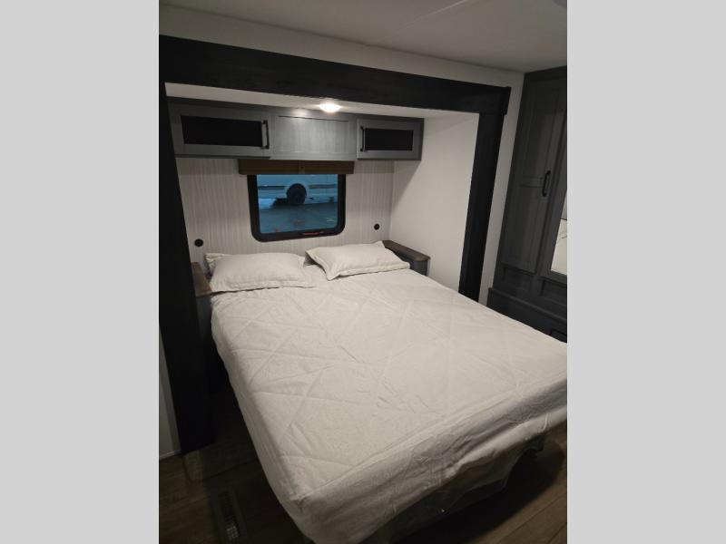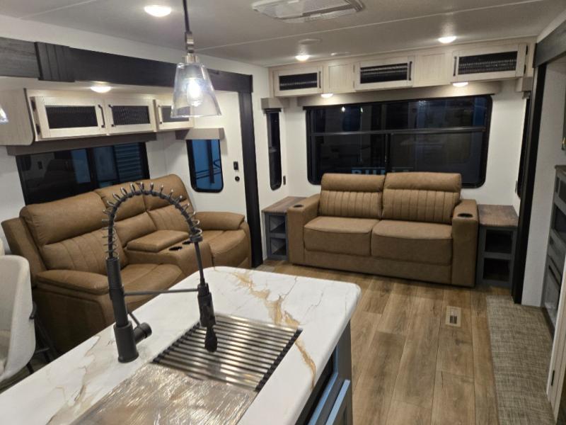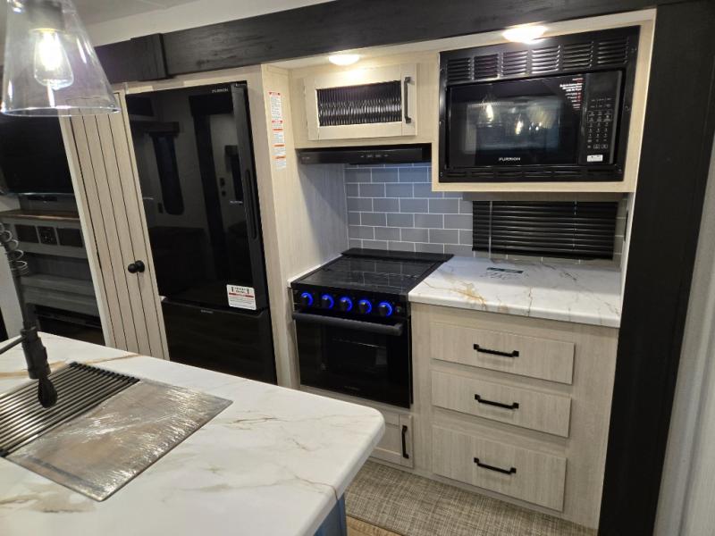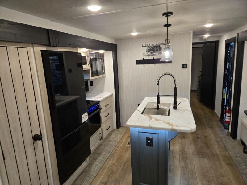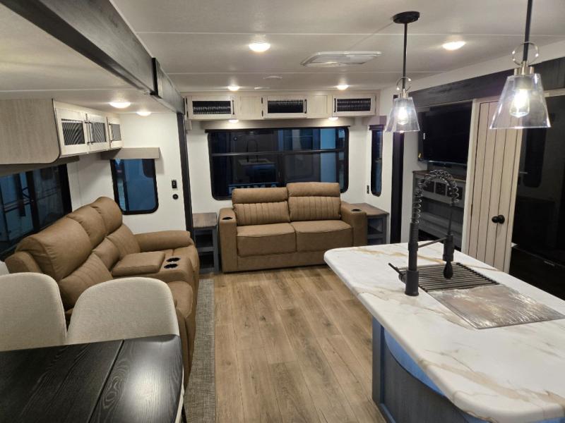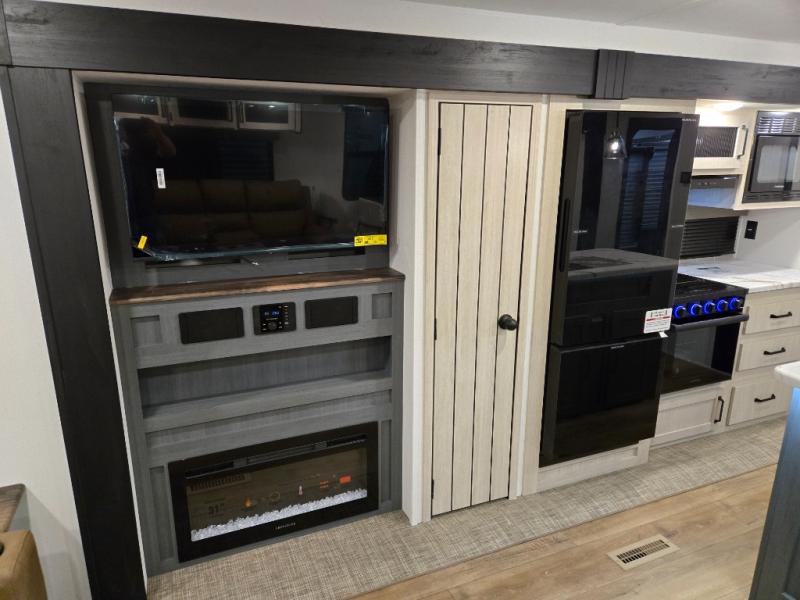 You're going to feel right at home in this travel trailer! The front private bedroom has a queen bed slide for a good night's rest, a dresser and front closet for your clothes, and another closet with washer and dryer prep. Freshen up each morning in the full bathroom with the 32" x 40" shower with a seat and then head to the kitchen to fry up some eggs on the stainless steel oven and range. You will also appreciate having a kitchen island for easier meal prep and a walk-in pantry to easily see your canned goods and snacks. The booth dinette offers a comfortable place to dine, play, and even sleep once converted. What better way to wind down your nights than to relax on either the rear sofa or in one of the two recliners across from the entertainment center with a fireplace!