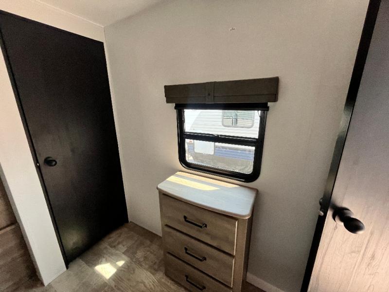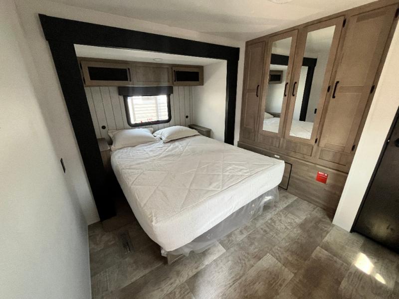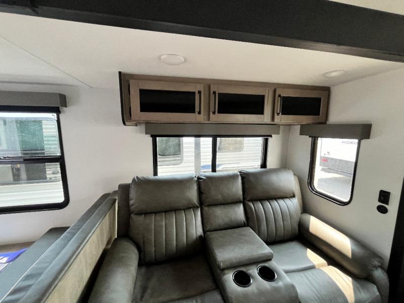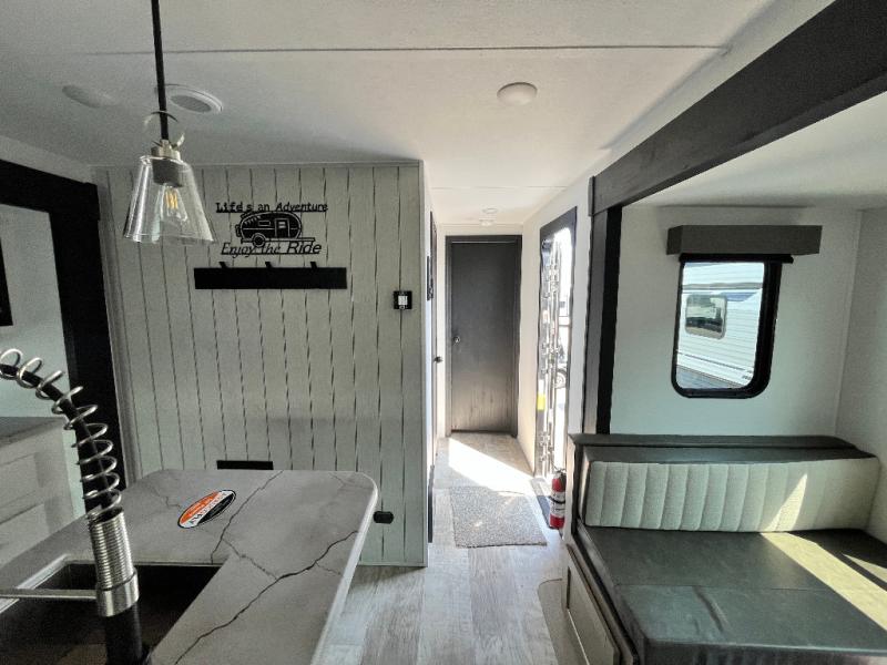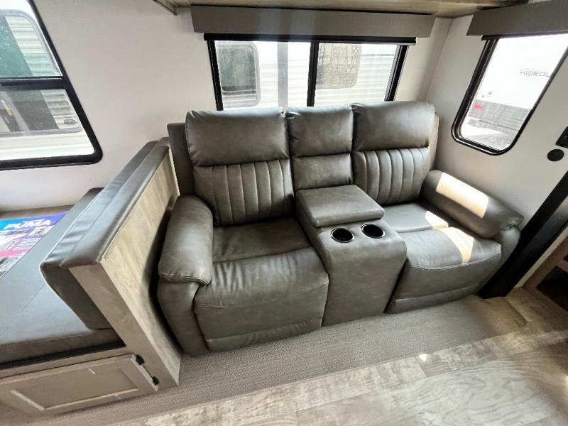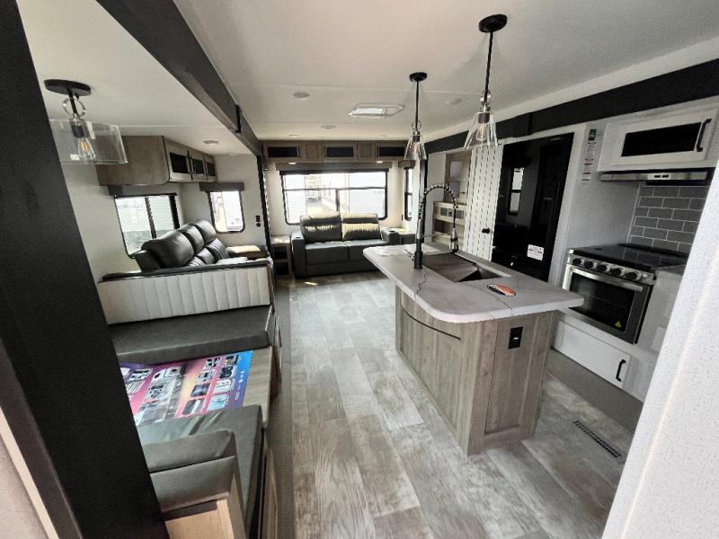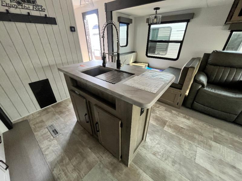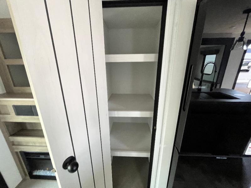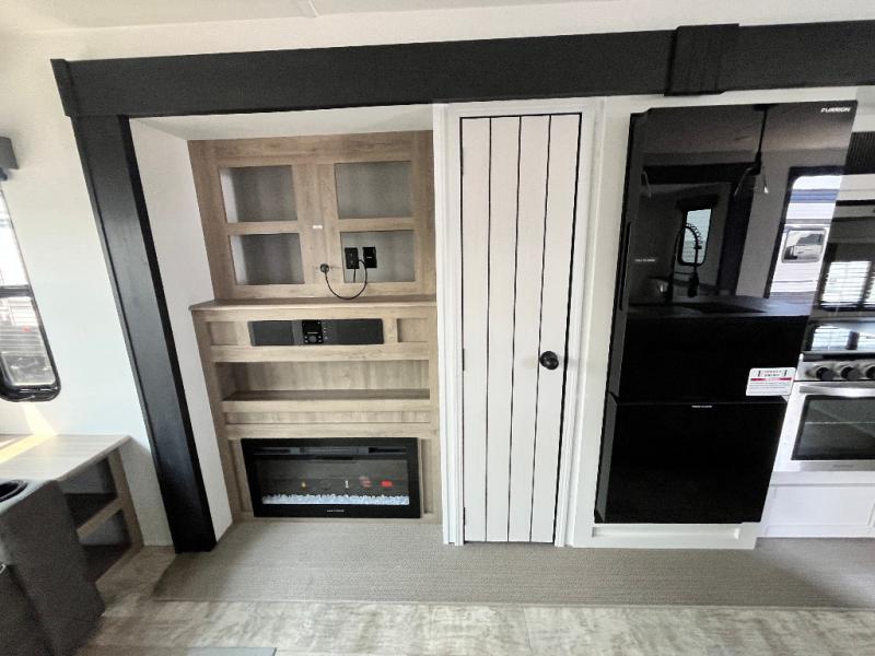 You're going to feel right at home in this travel trailer! The front private bedroom has a queen bed slide for a good night's rest, a dresser and front closet for your clothes, and another closet with washer and dryer prep. Freshen up each morning in the full bathroom with the 32" x 40" shower with a seat and then head to the kitchen to fry up some eggs on the stainless steel oven and range. You will also appreciate having a kitchen island for easier meal prep and a walk-in pantry to easily see your canned goods and snacks. The booth dinette offers a comfortable place to dine, play, and even sleep once converted. What better way to wind down your nights than to relax on either the rear sofa or in one of the two recliners across from the entertainment center with a fireplace!