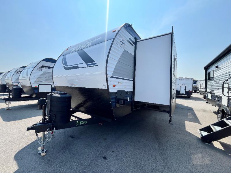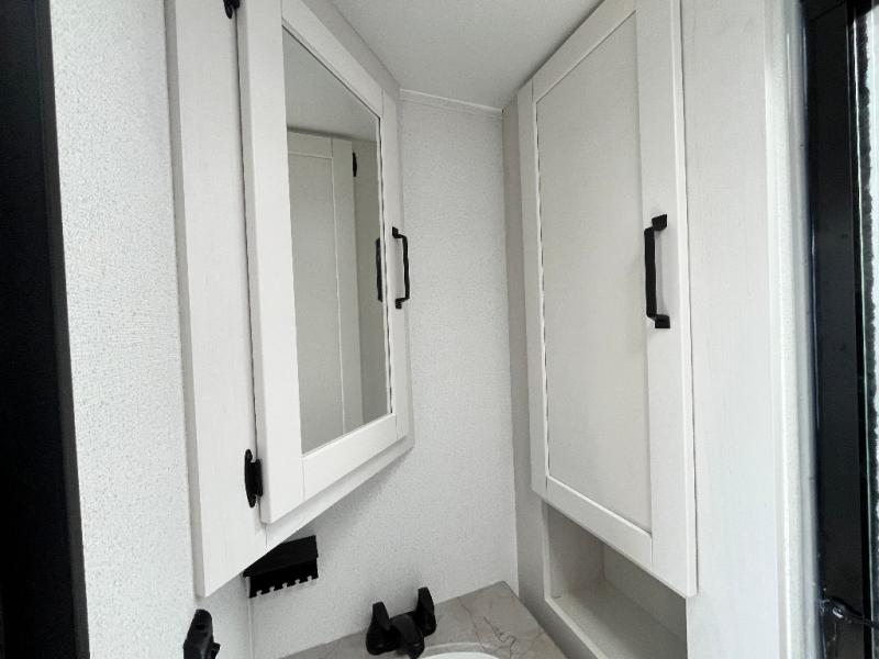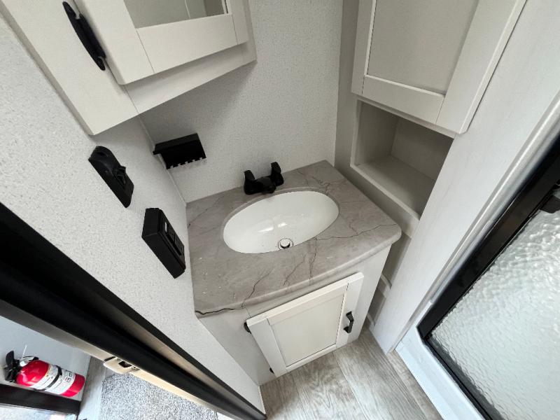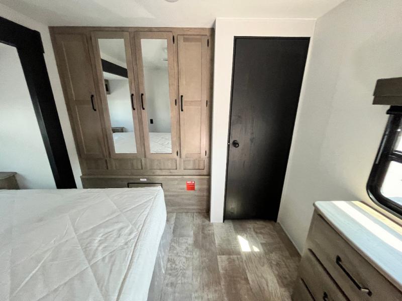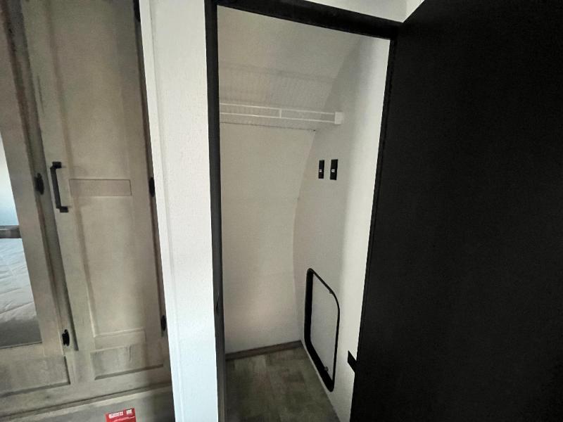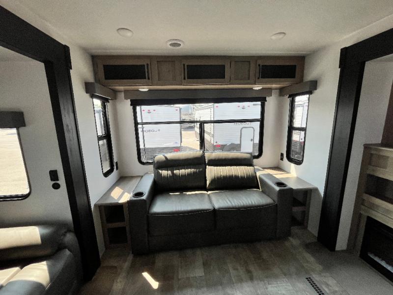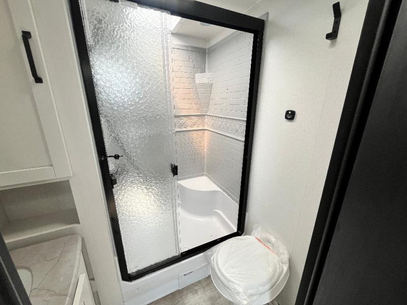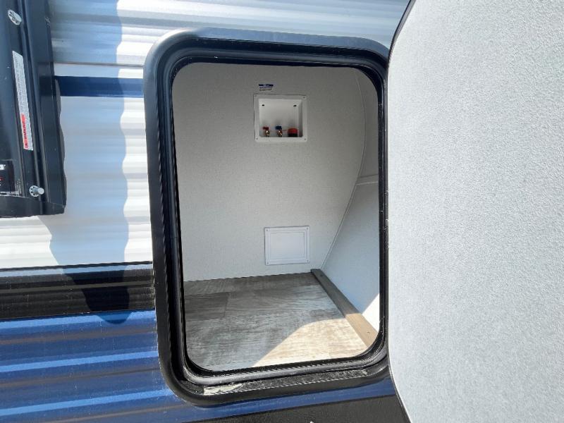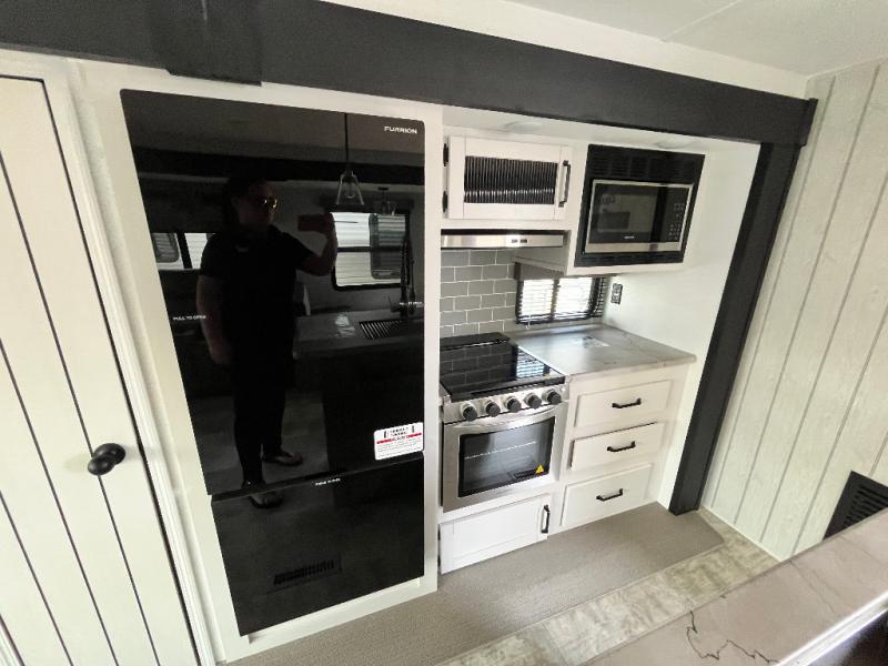You're going to feel right at home in this travel trailer! The front private bedroom has a queen bed slide for a good night's rest, a dresser and front closet for your clothes, and another closet with washer and dryer prep. Freshen up each morning in the full bathroom with the 32" x 40" shower with a seat and then head to the kitchen to fry up some eggs on the stainless steel oven and range. You will also appreciate having a kitchen island for easier meal prep and a walk-in pantry to easily see your canned goods and snacks. The booth dinette offers a comfortable place to dine, play, and even sleep once converted. What better way to wind down your nights than to relax on either the rear sofa or in one of the two recliners across from the entertainment center with a fireplace!