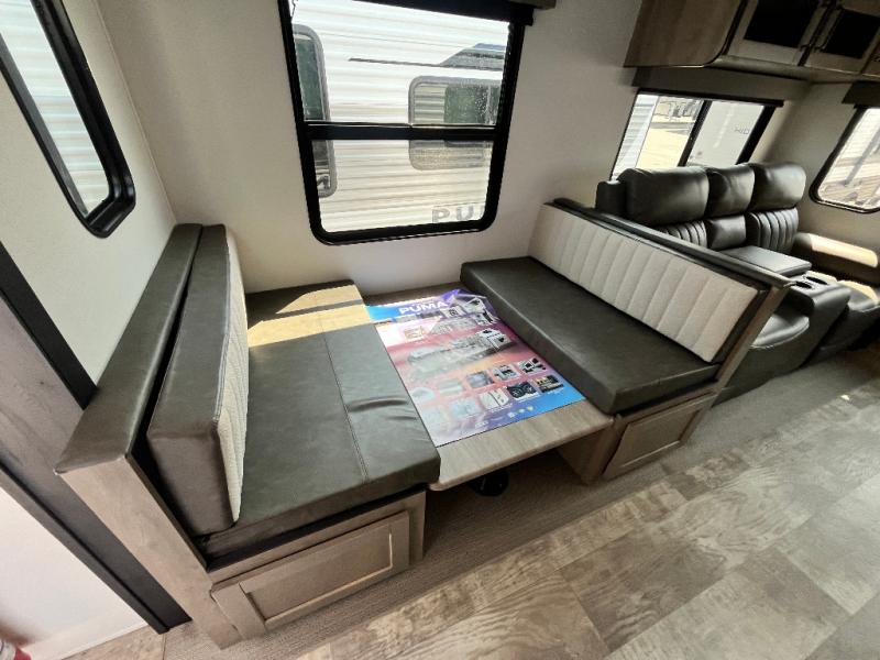 If you're looking for family-fun adventures then you need one of these Palomino Puma fifth wheels or travel trailers! They are built rugged, easy to tow, and jam packed with features. The Darco wrapped underbelly will protect your units vitals and the AlphaPly roofing membrane covers it. They also have new aluminum wheels and a powder coated steel I-beam frame. Inside, the Congoleum linoleum will be easy to keep clean, and the night roller shades will provide privacy when it's time to turn in. You'll also enjoy an electric awning with an LED light strip plus an AM/FM/Bluetooth stereo and two outside speakers to keep the party going!