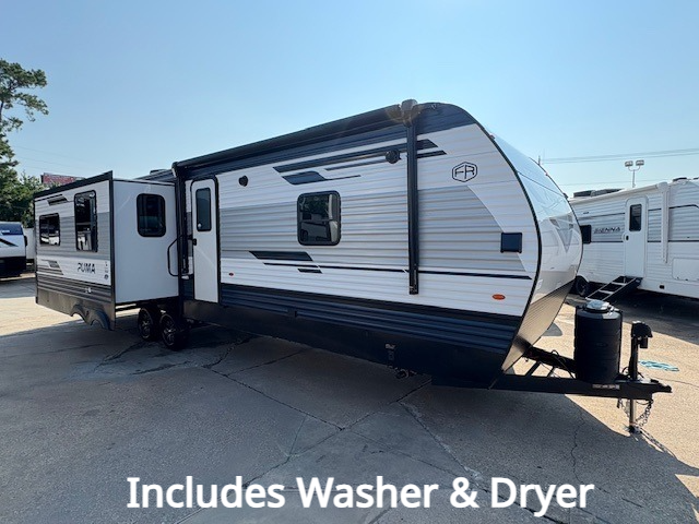 If you're looking for family-fun adventures then you need one of these Palomino Puma fifth wheels or travel trailers! They are built rugged, easy to tow, and jam packed with features. The Darco wrapped underbelly will protect your units vitals and the AlphaPly roofing membrane covers it. They also have new aluminum wheels and a powder coated steel I-beam frame. Inside, the Congoleum linoleum will be easy to keep clean, and the night roller shades will provide privacy when it's time to turn in. You'll also enjoy an electric awning with an LED light strip plus an AM/FM/Bluetooth stereo and two outside speakers to keep the party going!