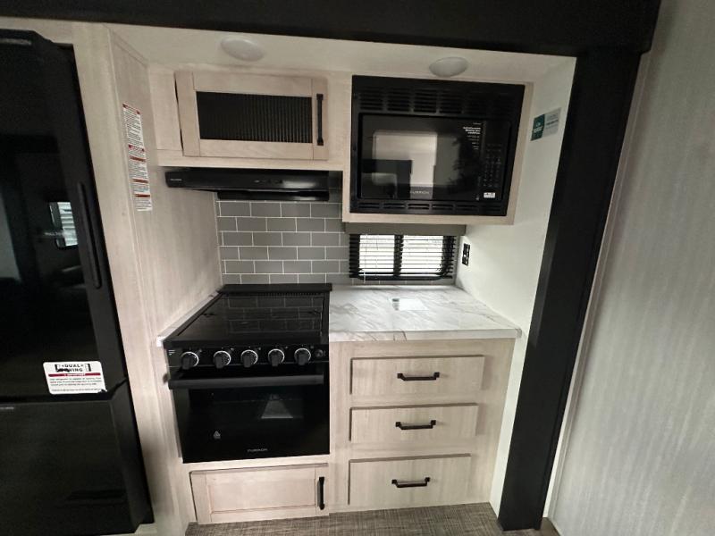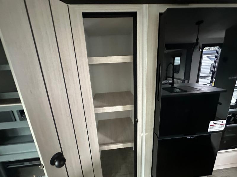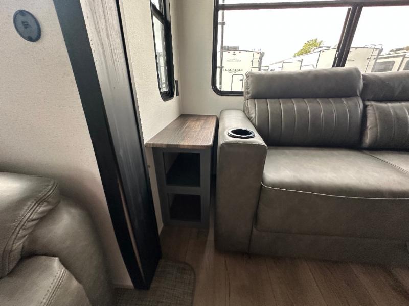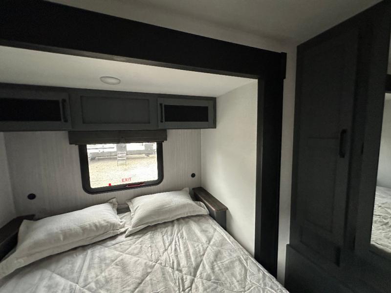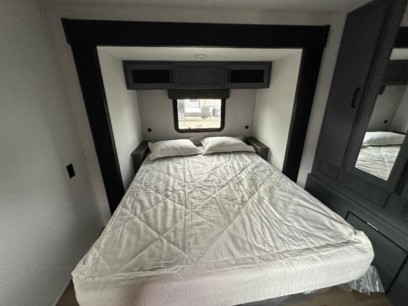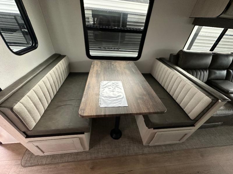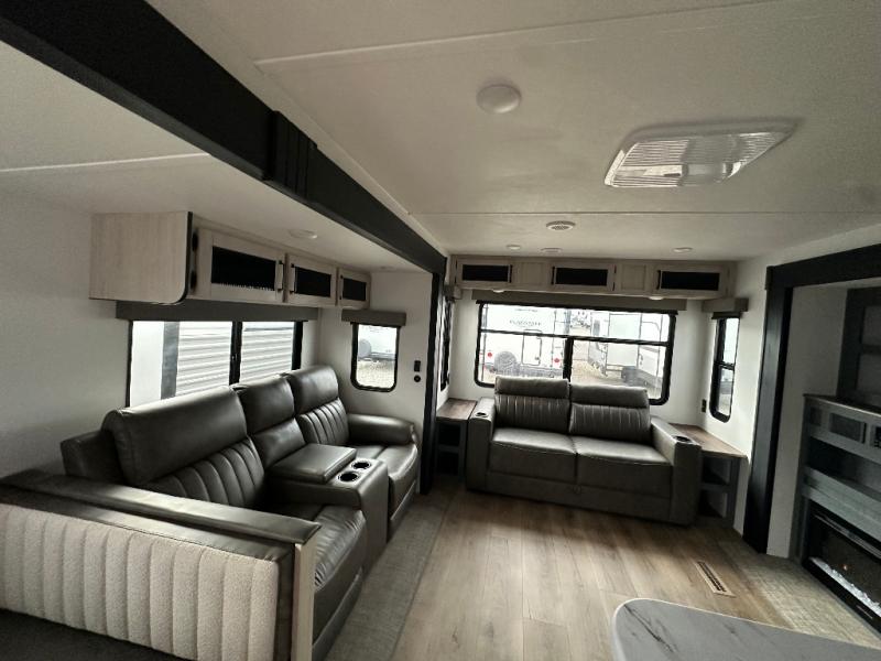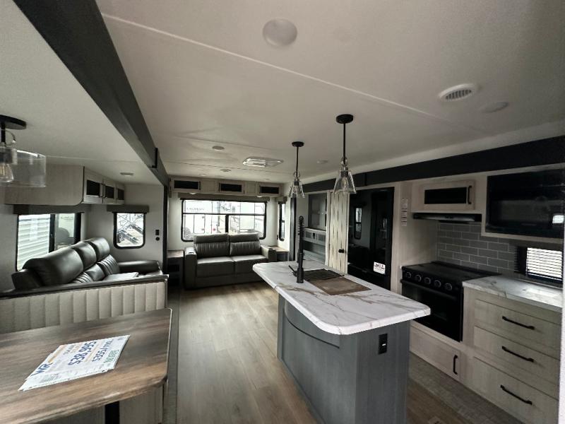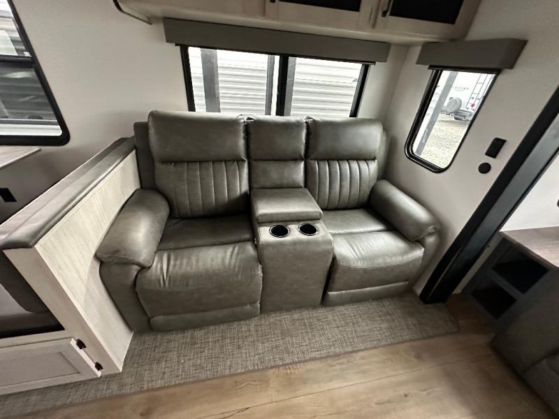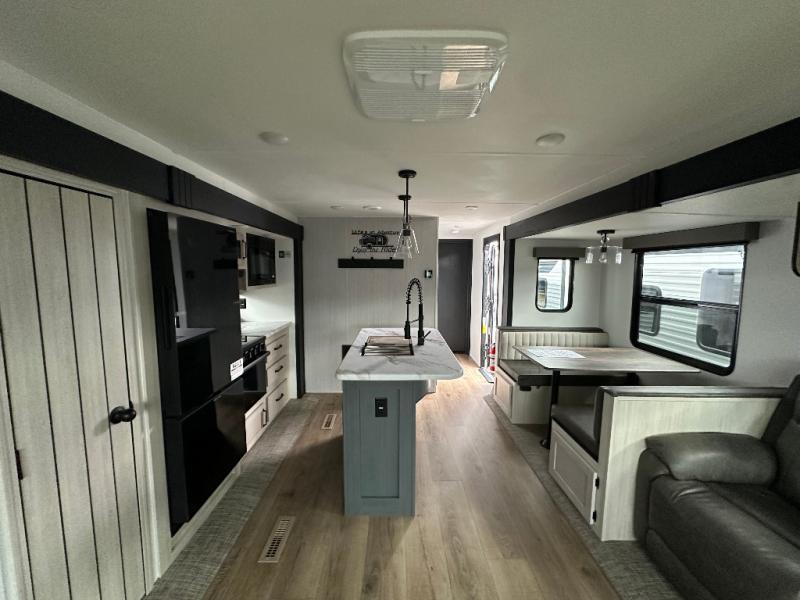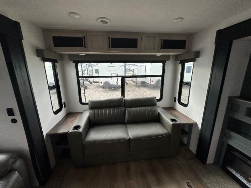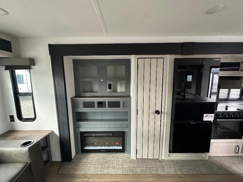 You're going to feel right at home in this travel trailer! The front private bedroom has a queen bed slide for a good night's rest, a dresser and front closet for your clothes, and another closet with washer and dryer prep. Freshen up each morning in the full bathroom with the 32" x 40" shower with a seat and then head to the kitchen to fry up some eggs on the stainless steel oven and range. You will also appreciate having a kitchen island for easier meal prep and a walk-in pantry to easily see your canned goods and snacks. The booth dinette offers a comfortable place to dine, play, and even sleep once converted. What better way to wind down your nights than to relax on either the rear sofa or in one of the two recliners across from the entertainment center with a fireplace!