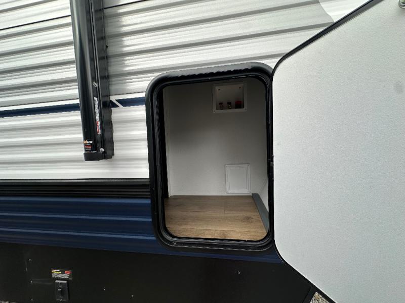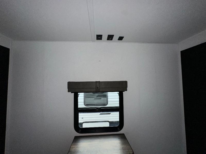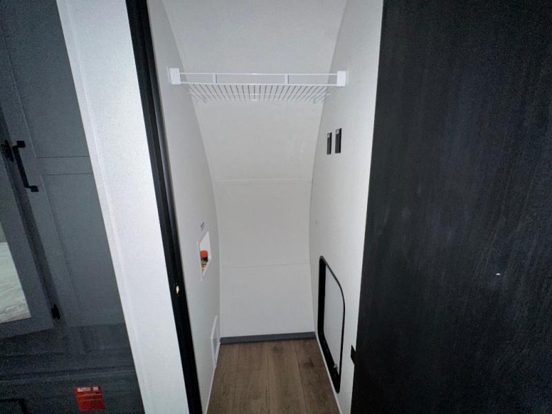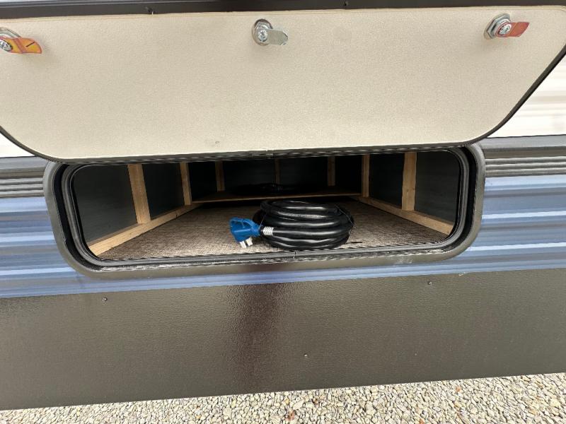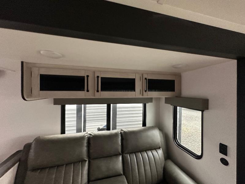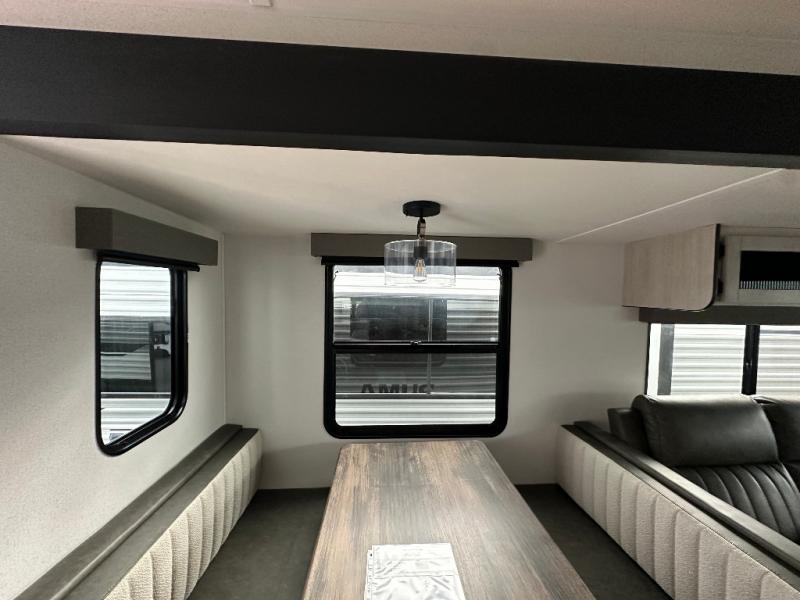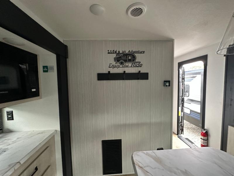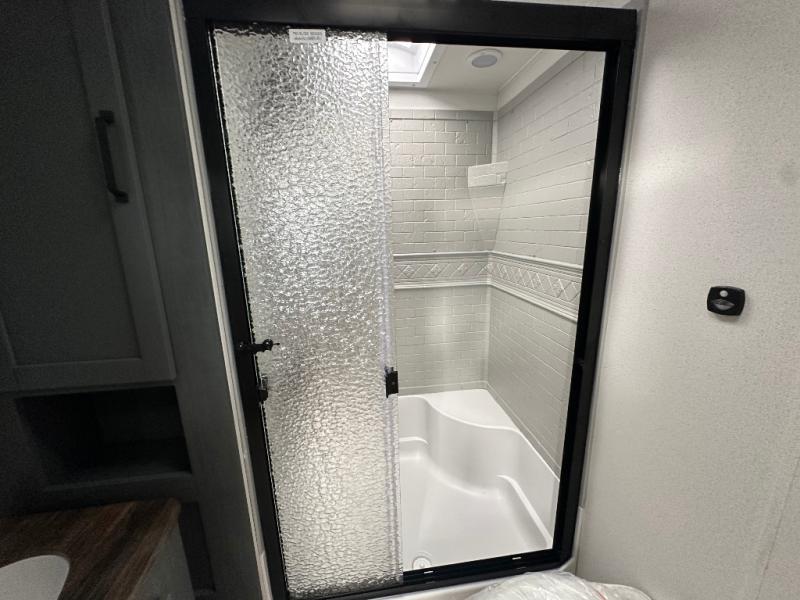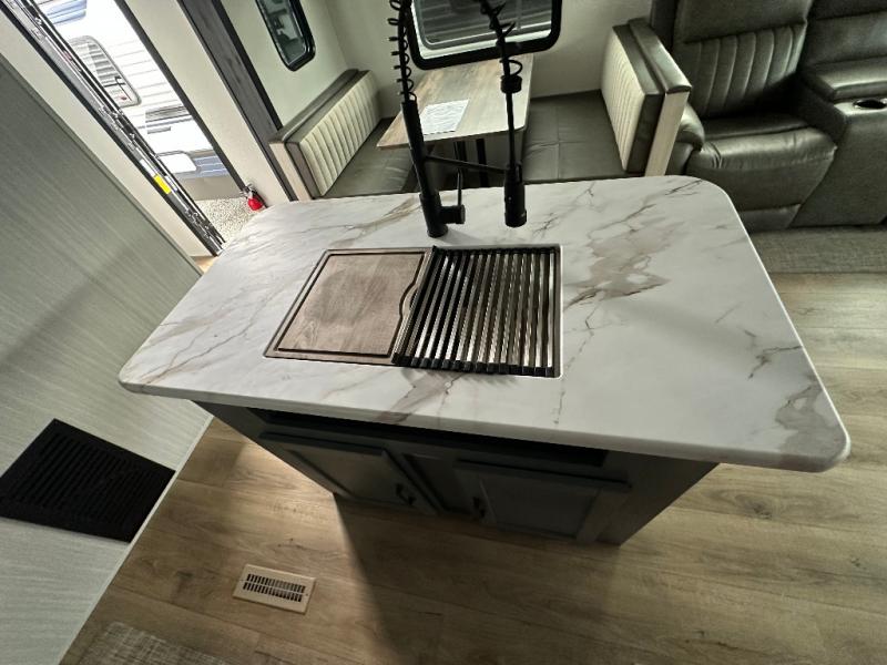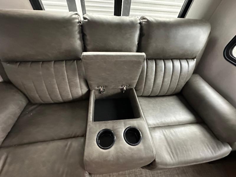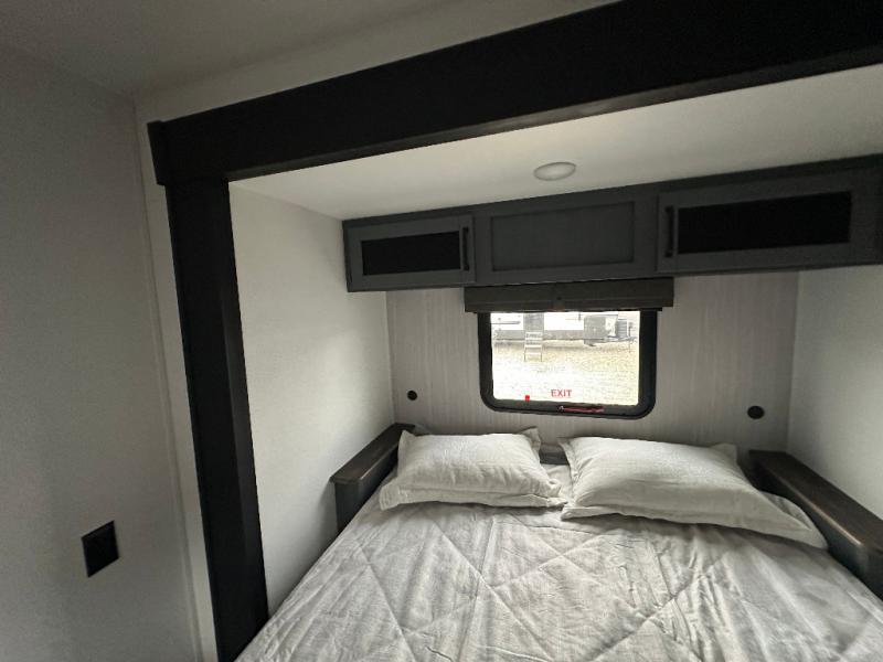 You're going to feel right at home in this travel trailer! The front private bedroom has a queen bed slide for a good night's rest, a dresser and front closet for your clothes, and another closet with washer and dryer prep. Freshen up each morning in the full bathroom with the 32" x 40" shower with a seat and then head to the kitchen to fry up some eggs on the stainless steel oven and range. You will also appreciate having a kitchen island for easier meal prep and a walk-in pantry to easily see your canned goods and snacks. The booth dinette offers a comfortable place to dine, play, and even sleep once converted. What better way to wind down your nights than to relax on either the rear sofa or in one of the two recliners across from the entertainment center with a fireplace!