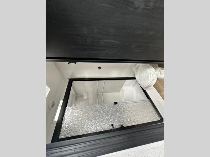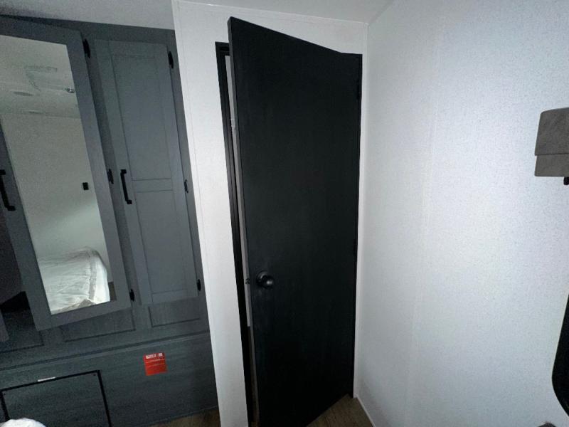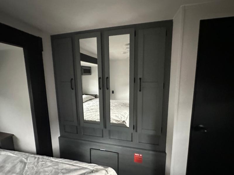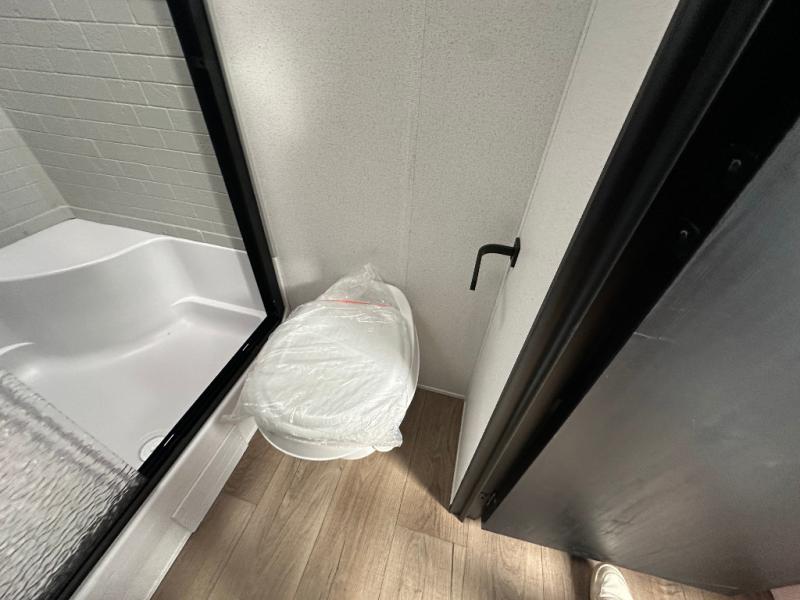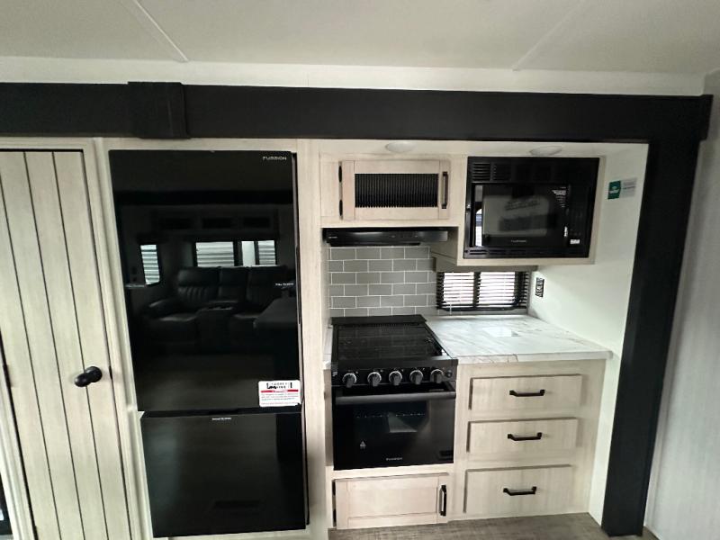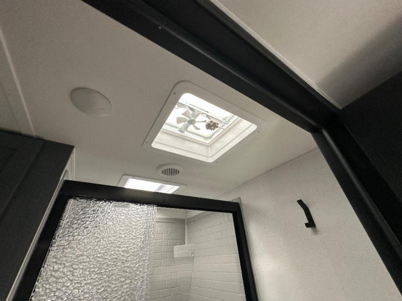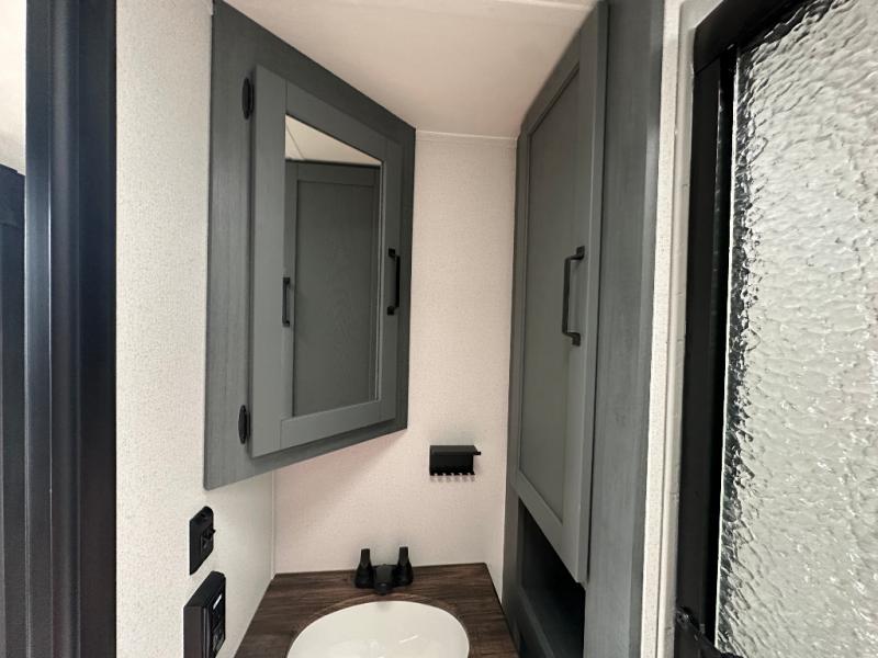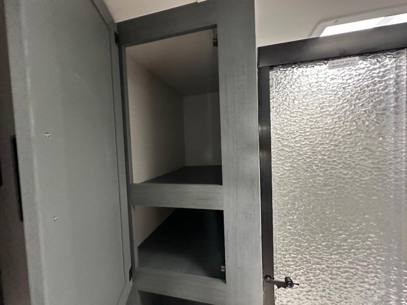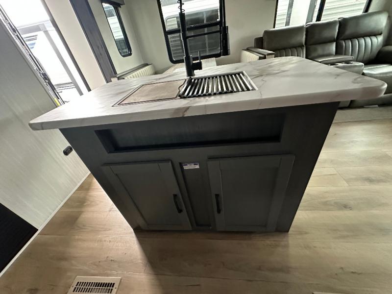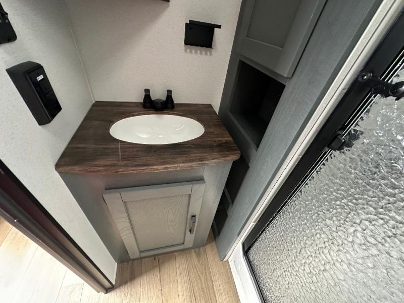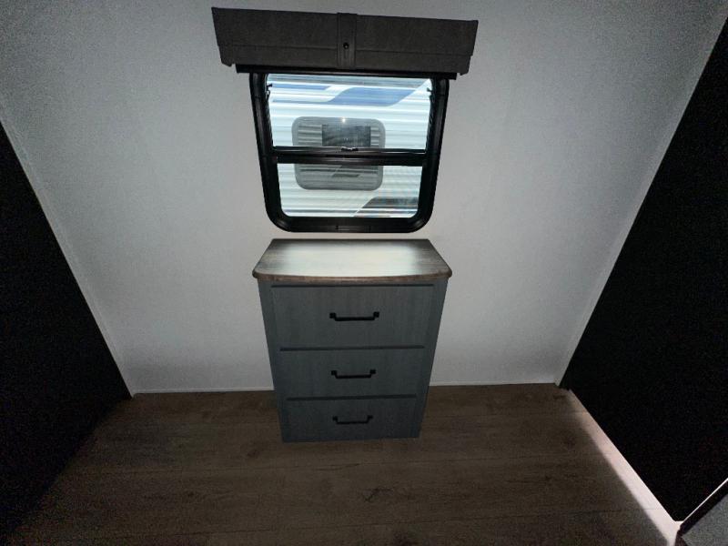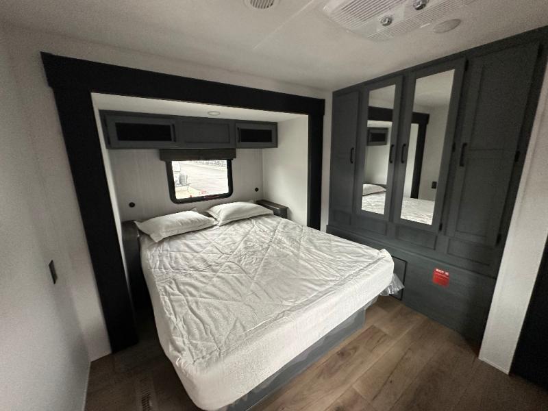 You're going to feel right at home in this travel trailer! The front private bedroom has a queen bed slide for a good night's rest, a dresser and front closet for your clothes, and another closet with washer and dryer prep. Freshen up each morning in the full bathroom with the 32" x 40" shower with a seat and then head to the kitchen to fry up some eggs on the stainless steel oven and range. You will also appreciate having a kitchen island for easier meal prep and a walk-in pantry to easily see your canned goods and snacks. The booth dinette offers a comfortable place to dine, play, and even sleep once converted. What better way to wind down your nights than to relax on either the rear sofa or in one of the two recliners across from the entertainment center with a fireplace!