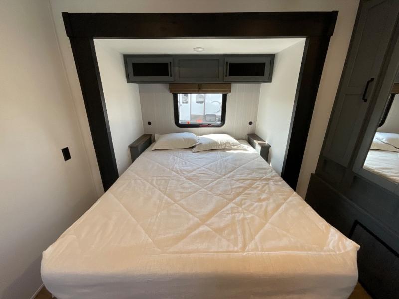 You're going to feel right at home in this travel trailer! The front private bedroom has a queen bed slide for a good night's rest, a dresser and front closet for your clothes, and another closet with washer and dryer prep. Freshen up each morning in the full bathroom with the 32" x 40" shower with a seat and then head to the kitchen to fry up some eggs on the stainless steel oven and range. You will also appreciate having a kitchen island for easier meal prep and a walk-in pantry to easily see your canned goods and snacks. The booth dinette offers a comfortable place to dine, play, and even sleep once converted. What better way to wind down your nights than to relax on either the rear sofa or in one of the two recliners across from the entertainment center with a fireplace!
