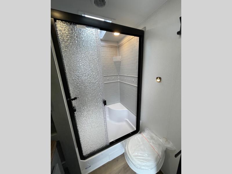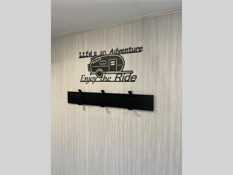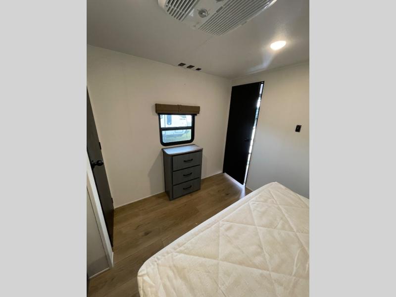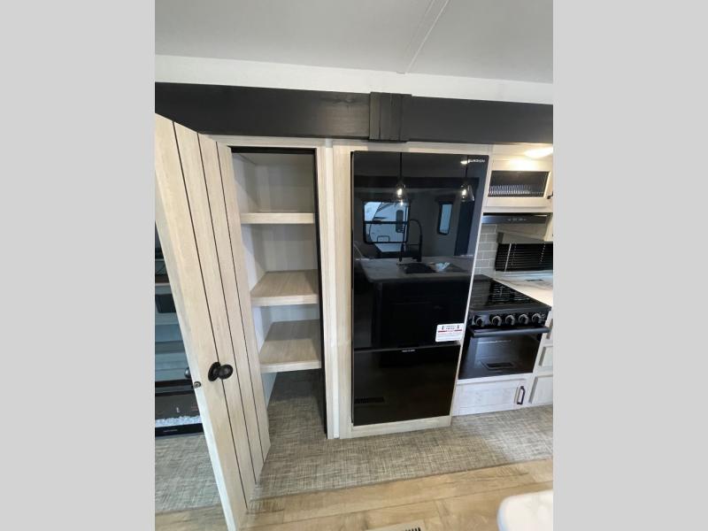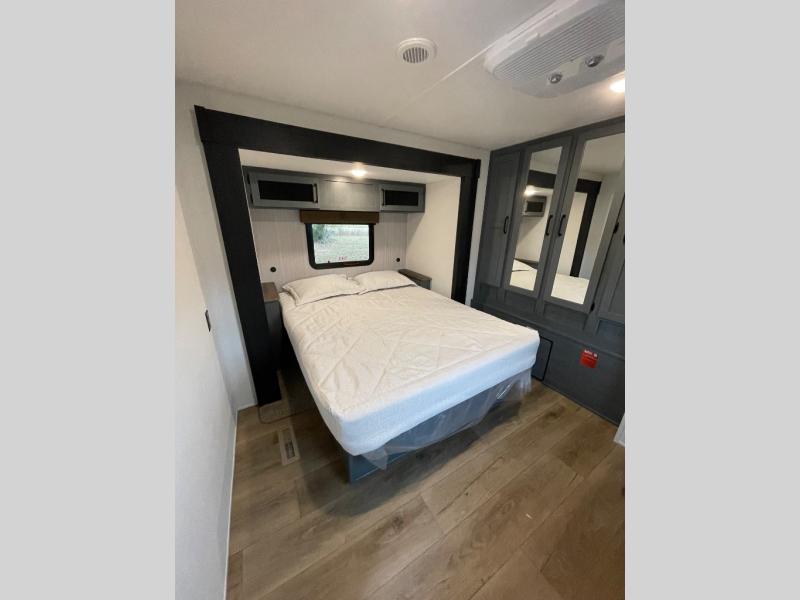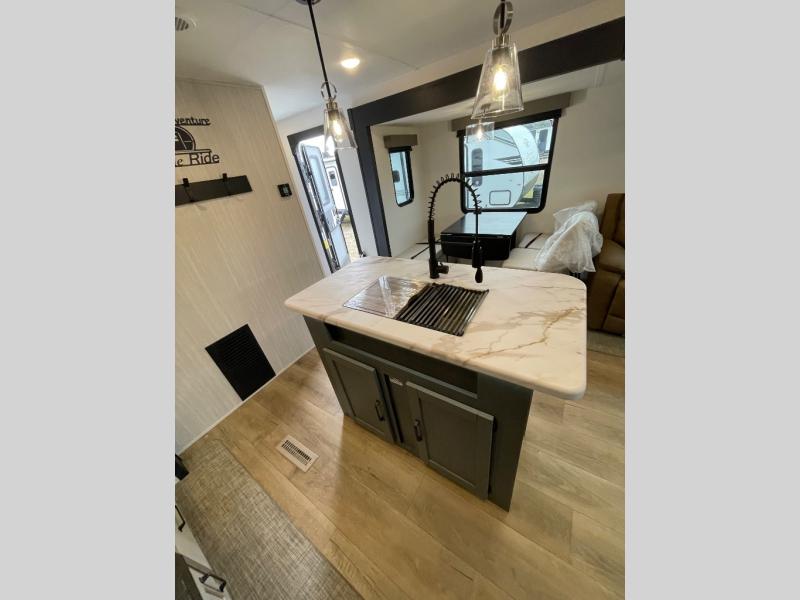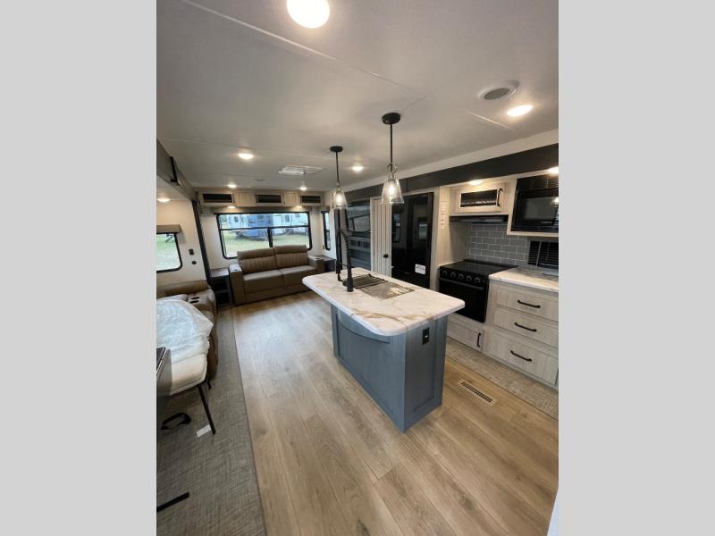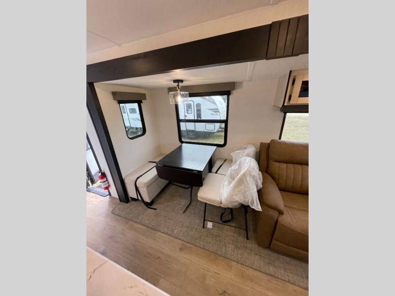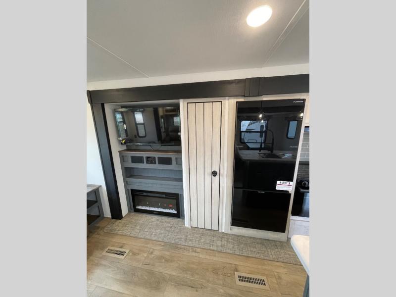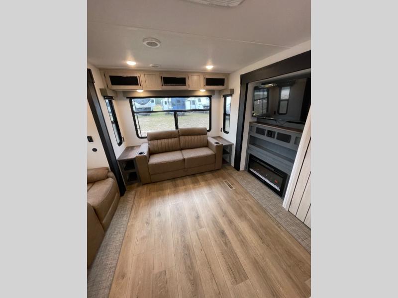 You're going to feel right at home in this travel trailer! The front private bedroom has a queen bed slide for a good night's rest, a dresser and front closet for your clothes, and another closet with washer and dryer prep. Freshen up each morning in the full bathroom with the 32" x 40" shower with a seat and then head to the kitchen to fry up some eggs on the stainless steel oven and range. You will also appreciate having a kitchen island for easier meal prep and a walk-in pantry to easily see your canned goods and snacks. The booth dinette offers a comfortable place to dine, play, and even sleep once converted. What better way to wind down your nights than to relax on either the rear sofa or in one of the two recliners across from the entertainment center with a fireplace!