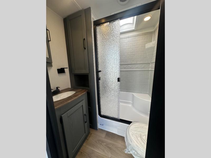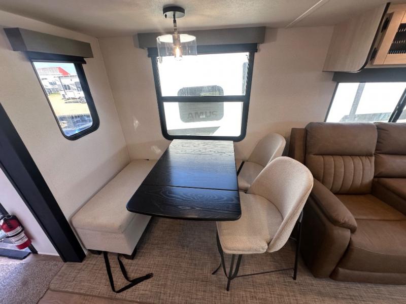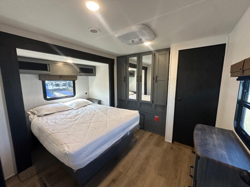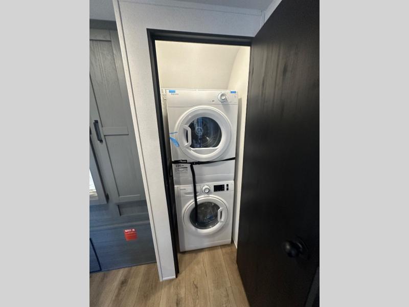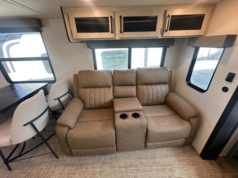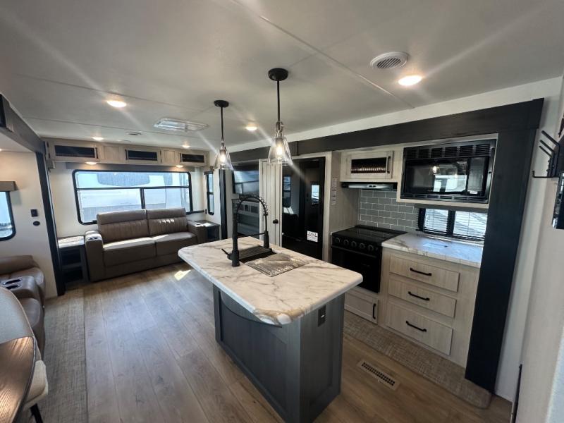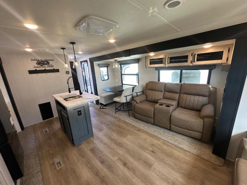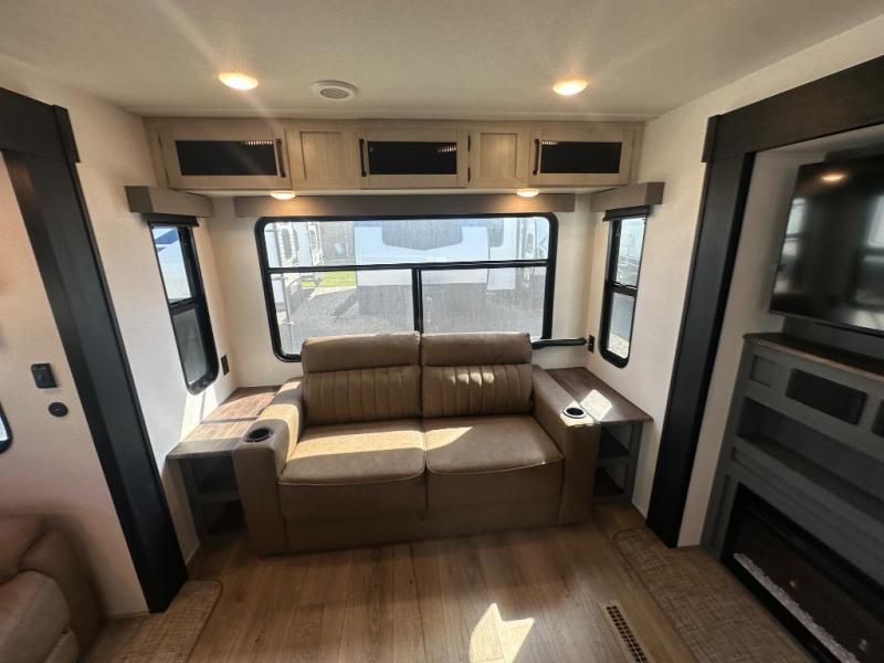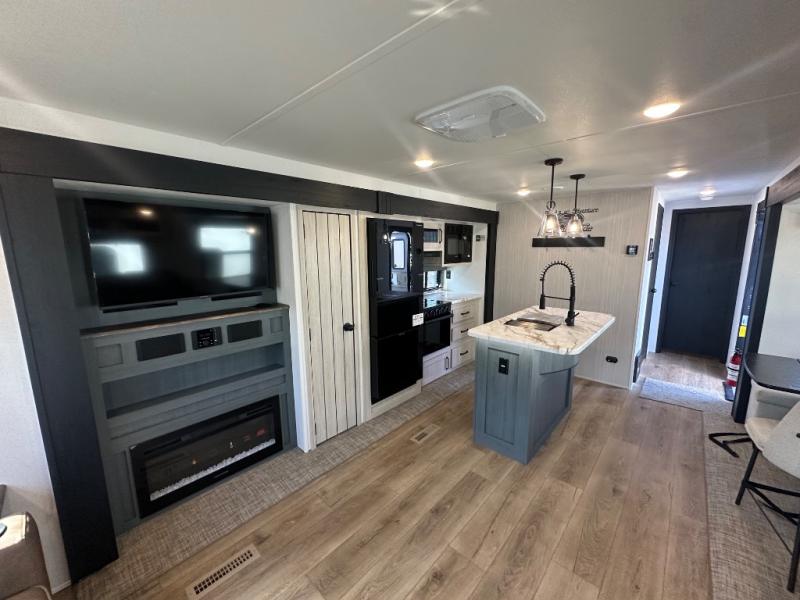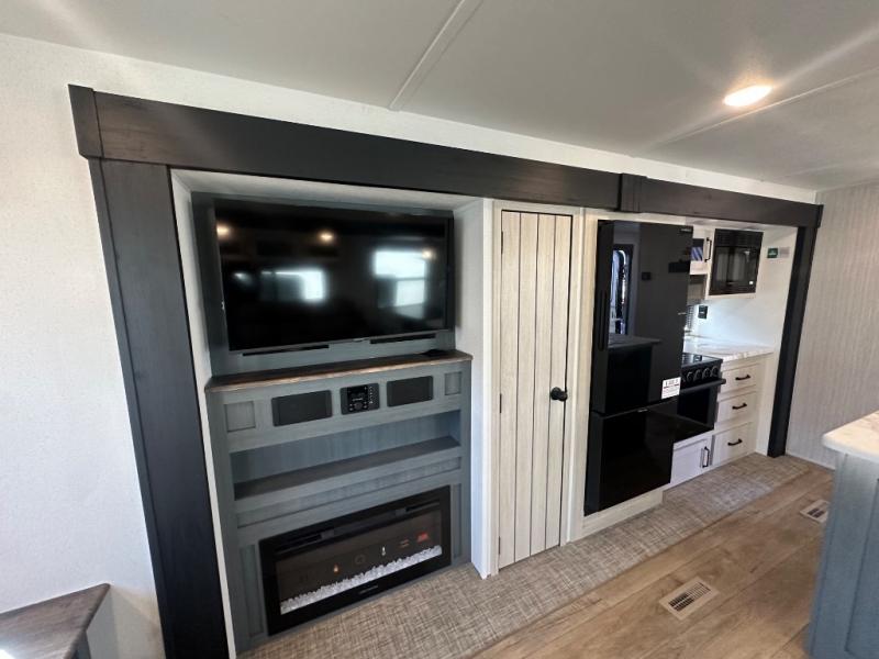 You're going to feel right at home in this travel trailer! The front private bedroom has a queen bed slide for a good night's rest, a dresser and front closet for your clothes, and another closet with washer and dryer prep. Freshen up each morning in the full bathroom with the 32" x 40" shower with a seat and then head to the kitchen to fry up some eggs on the stainless steel oven and range. You will also appreciate having a kitchen island for easier meal prep and a walk-in pantry to easily see your canned goods and snacks. The booth dinette offers a comfortable place to dine, play, and even sleep once converted. What better way to wind down your nights than to relax on either the rear sofa or in one of the two recliners across from the entertainment center with a fireplace!