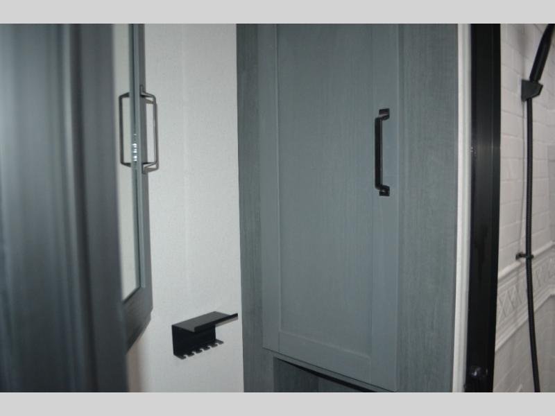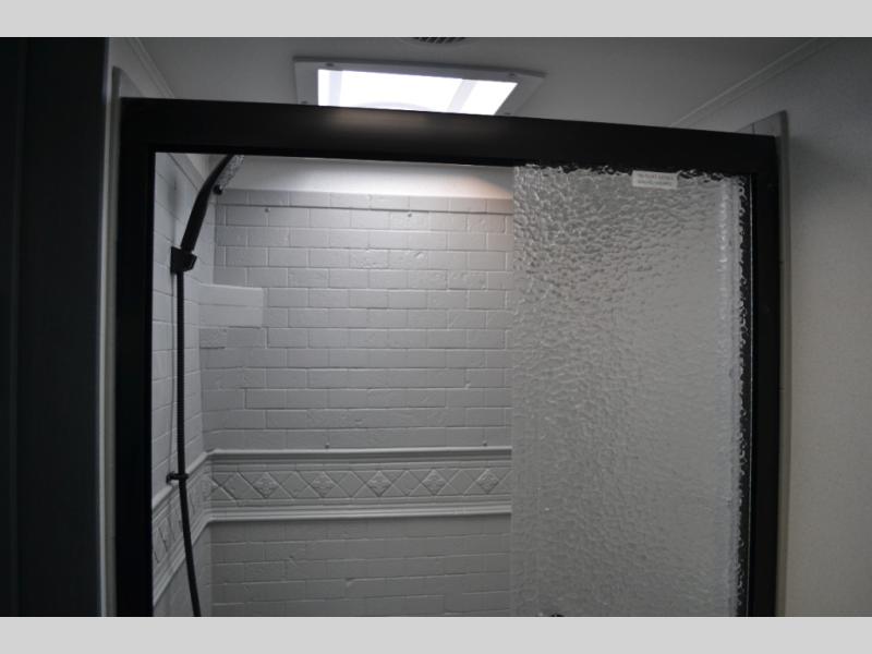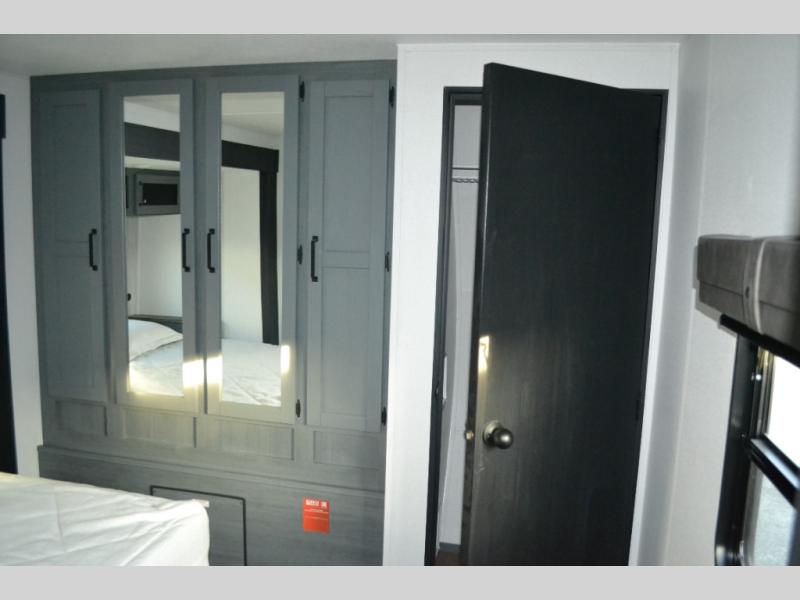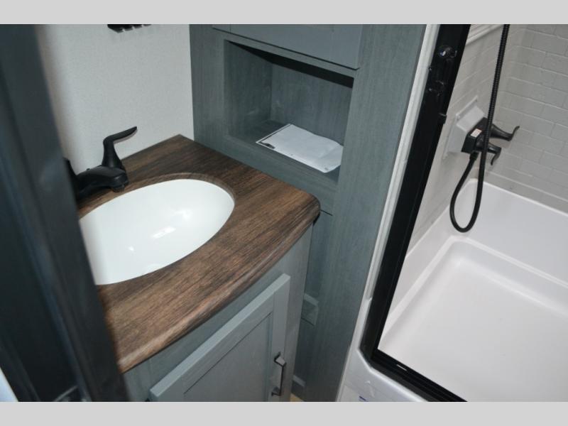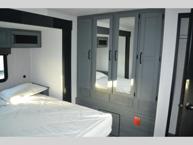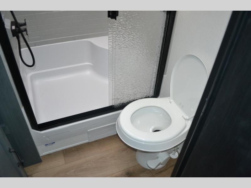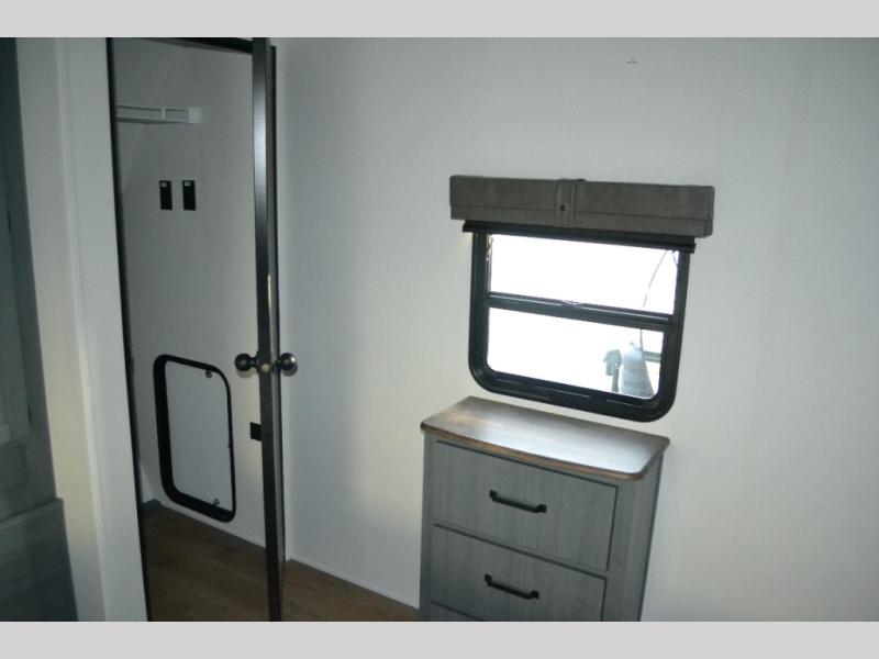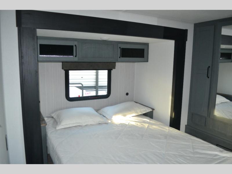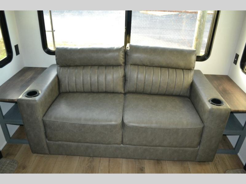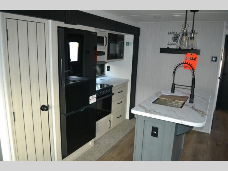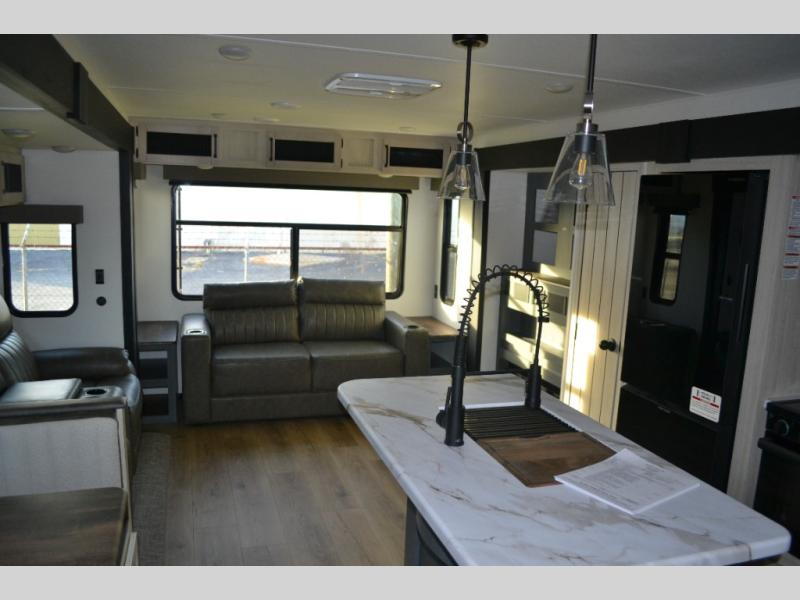 You're going to feel right at home in this travel trailer! The front private bedroom has a queen bed slide for a good night's rest, a dresser and front closet for your clothes, and another closet with washer and dryer prep. Freshen up each morning in the full bathroom with the 32" x 40" shower with a seat and then head to the kitchen to fry up some eggs on the stainless steel oven and range. You will also appreciate having a kitchen island for easier meal prep and a walk-in pantry to easily see your canned goods and snacks. The booth dinette offers a comfortable place to dine, play, and even sleep once converted. What better way to wind down your nights than to relax on either the rear sofa or in one of the two recliners across from the entertainment center with a fireplace!