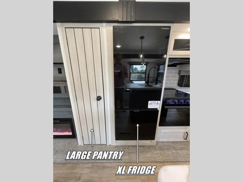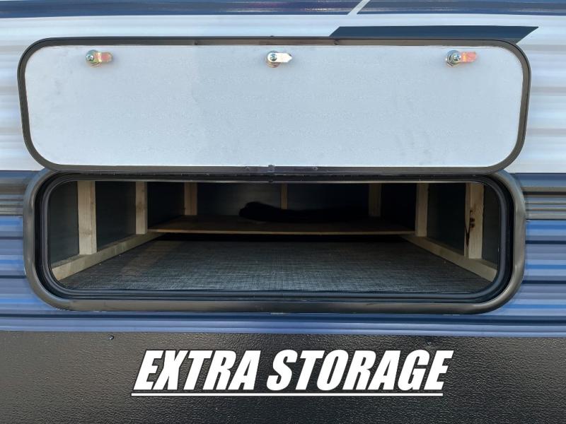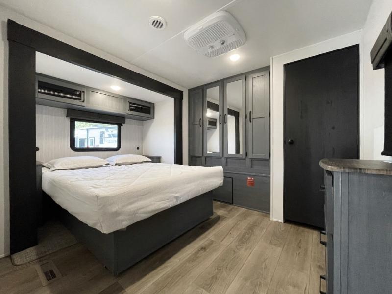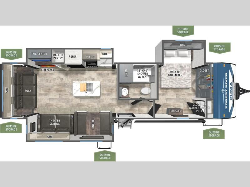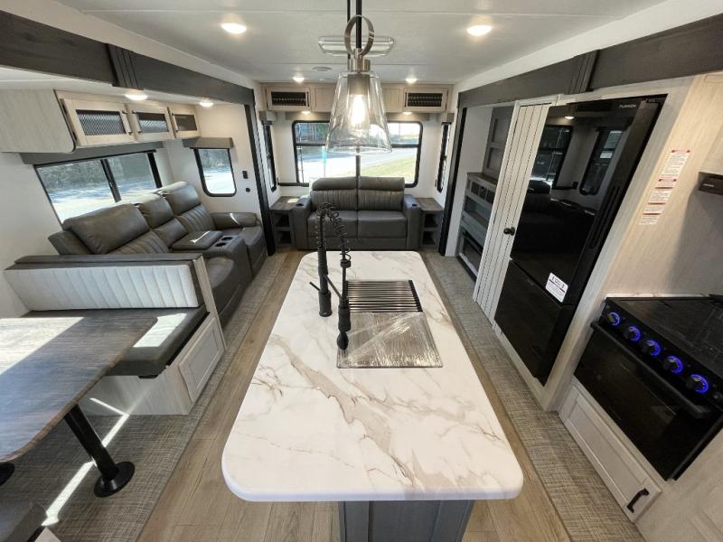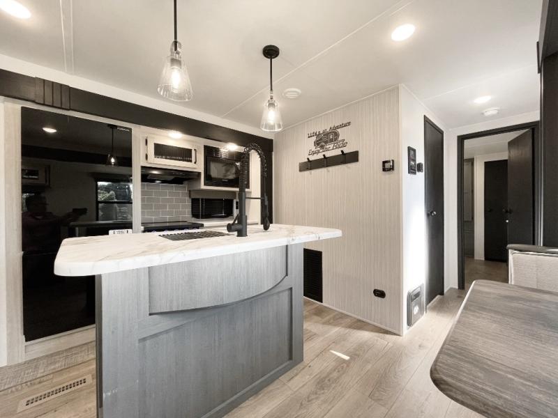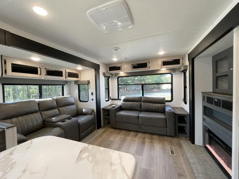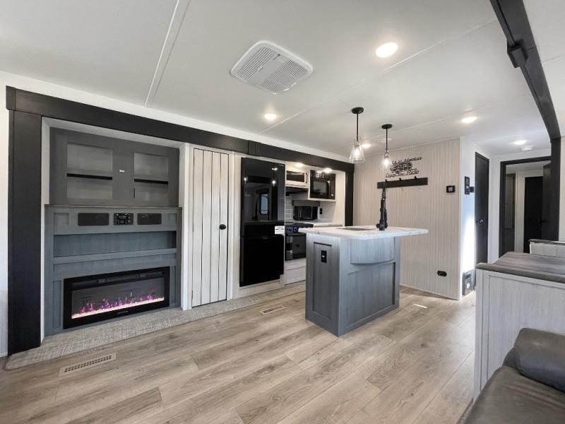 You're going to feel right at home in this travel trailer! The front private bedroom has a queen bed slide for a good night's rest, a dresser and front closet for your clothes, and another closet with washer and dryer prep. Freshen up each morning in the full bathroom with the 32" x 40" shower with a seat and then head to the kitchen to fry up some eggs on the stainless steel oven and range. You will also appreciate having a kitchen island for easier meal prep and a walk-in pantry to easily see your canned goods and snacks. The booth dinette offers a comfortable place to dine, play, and even sleep once converted. What better way to wind down your nights than to relax on either the rear sofa or in one of the two recliners across from the entertainment center with a fireplace!