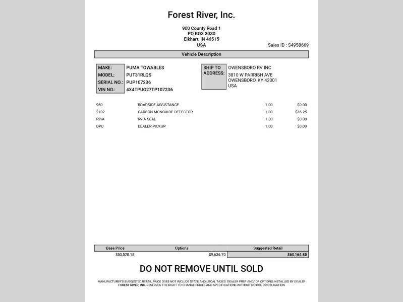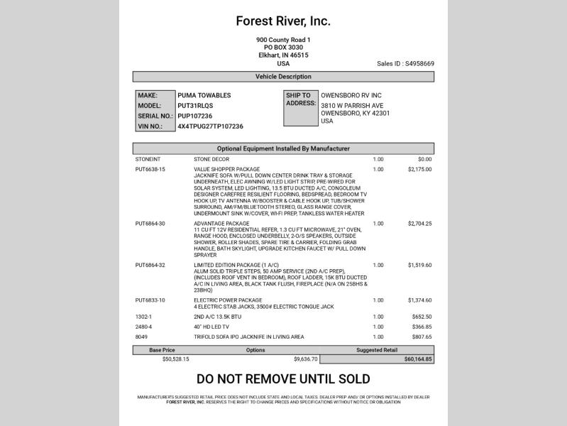 If you're looking for family-fun adventures, then you need one of these Forest River Puma travel trailers! They are built rugged, easy to tow, and jam packed with features. The Darco wrapped underbelly will help protect your unit, and the roof and side mount solar prep gives you the option to add off-grid power. Inside, the Congoleum linoleum will be easy to keep clean, and the night roller shades will provide privacy when it's time to turn in. You'll also enjoy an electric awning with an LED light strip plus an AM/FM/Bluetooth stereo and two outside speakers to keep the party going!