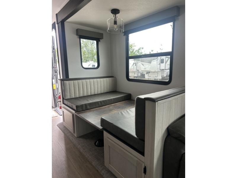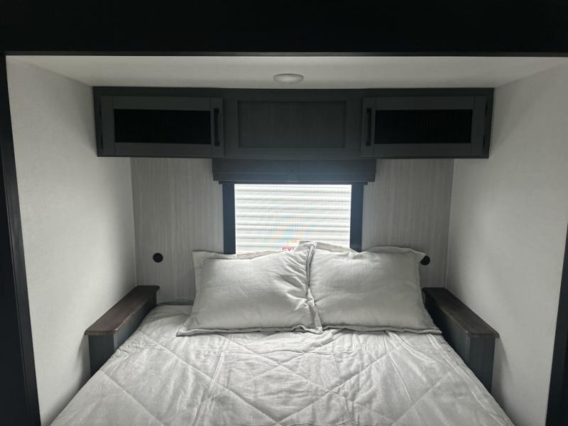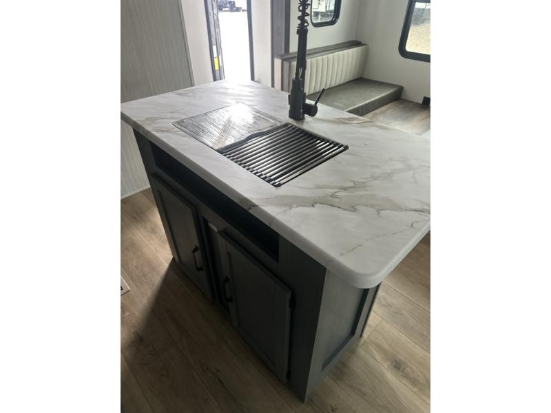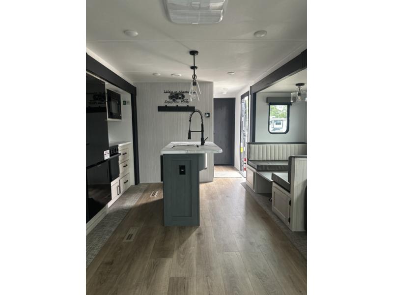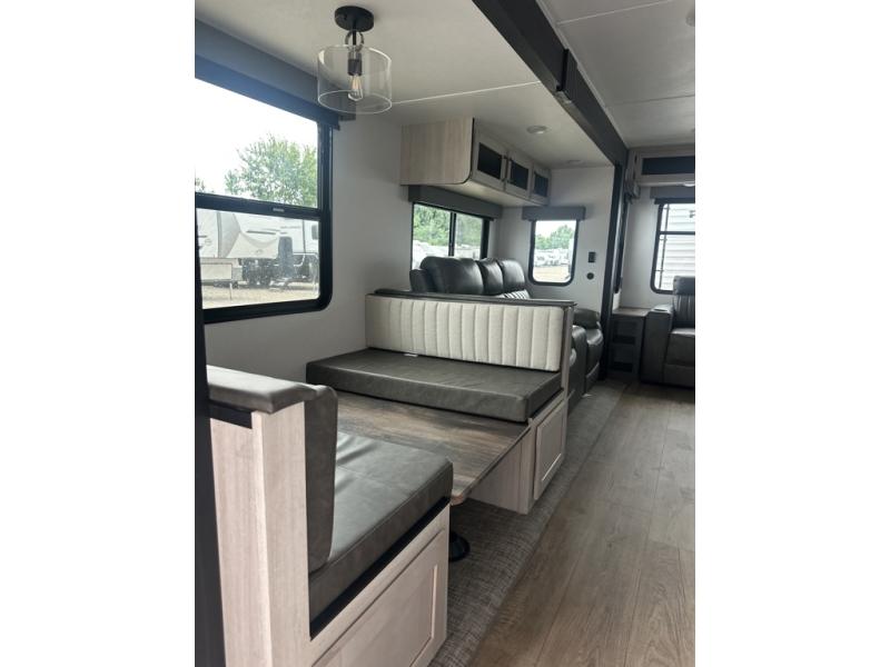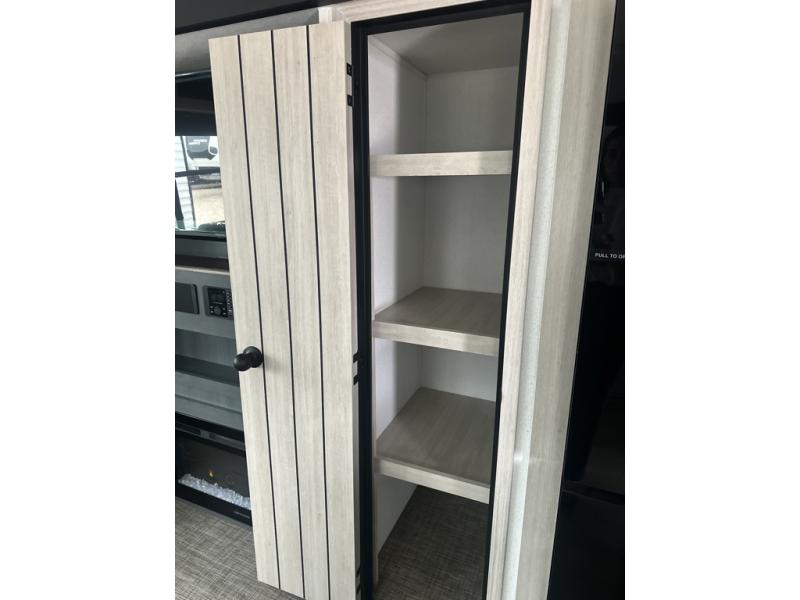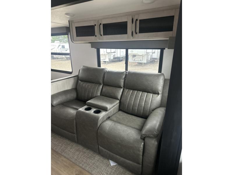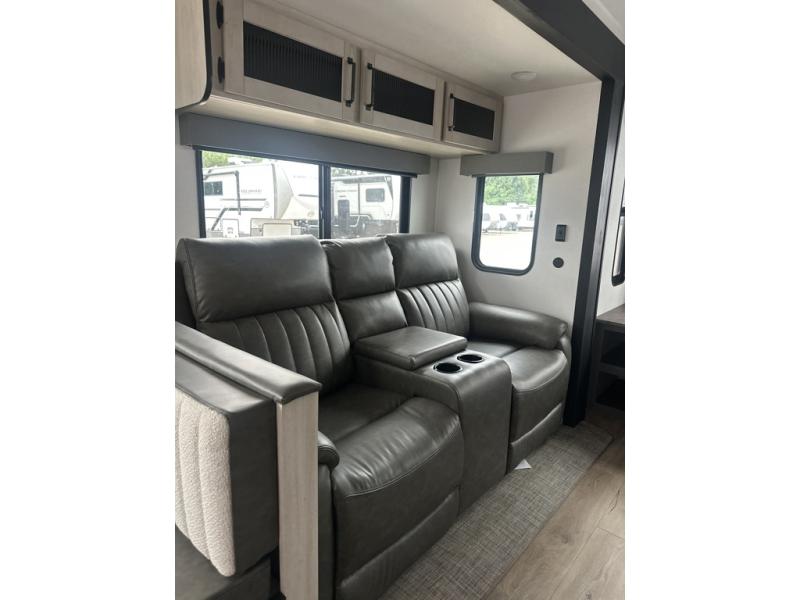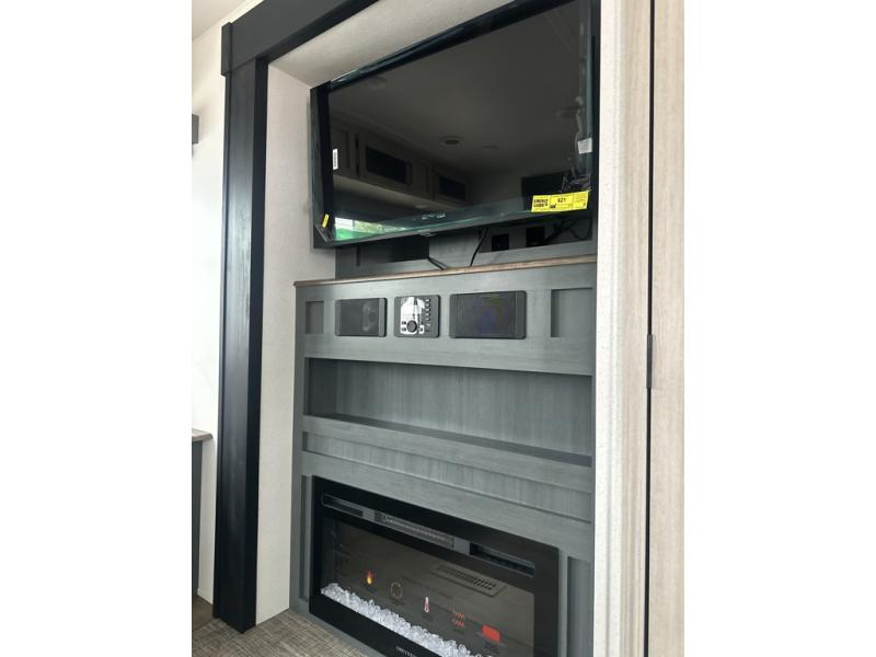 You're going to feel right at home in this travel trailer! The front private bedroom has a queen bed slide for a good night's rest, a dresser and front closet for your clothes, and another closet with washer and dryer prep. Freshen up each morning in the full bathroom with the 32" x 40" shower with a seat and then head to the kitchen to fry up some eggs on the stainless-steel oven and range. You will also appreciate having a kitchen island for easier meal prep and a walk-in pantry to easily see your canned goods and snacks. The booth dinette offers a comfortable place to dine, play, and even sleep once converted. What better way to wind down your nights than to relax on either the rear sofa or on the theater seating across from the entertainment center with a fireplace!