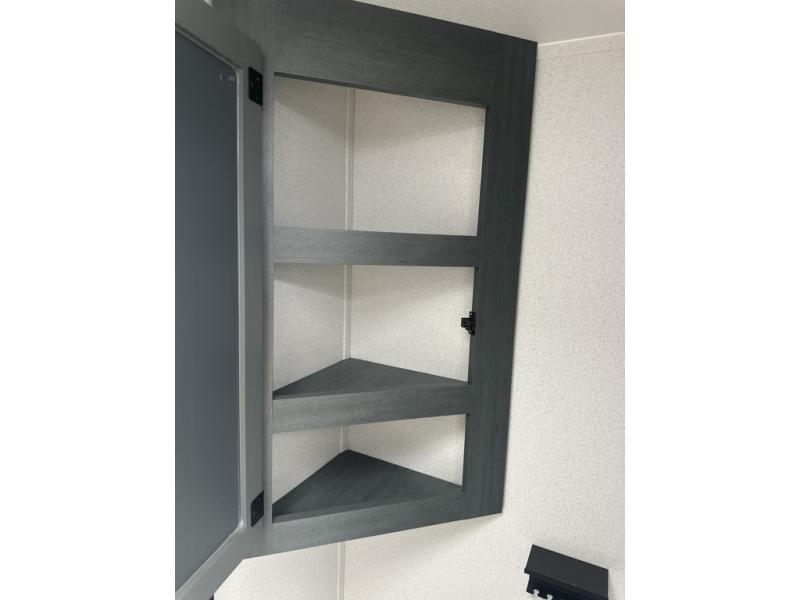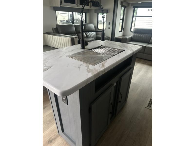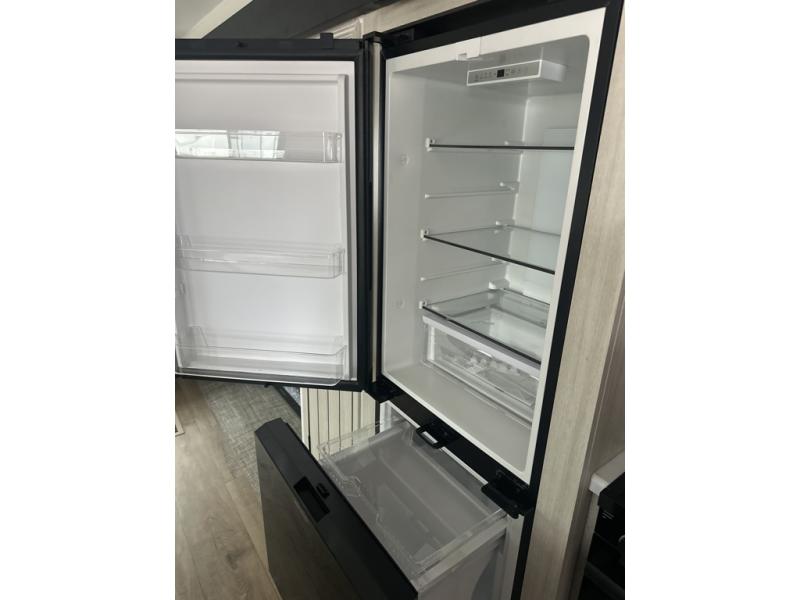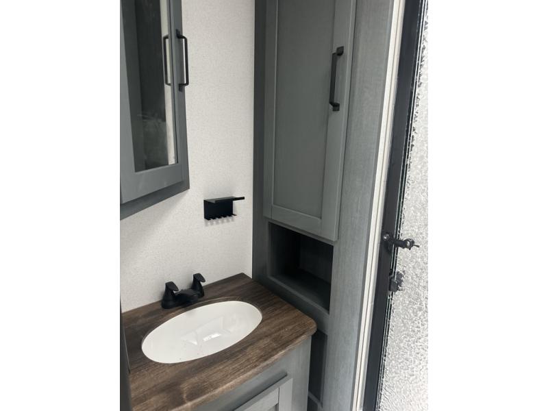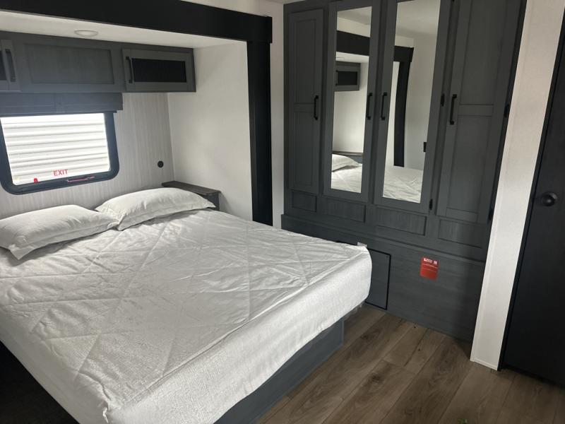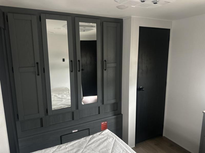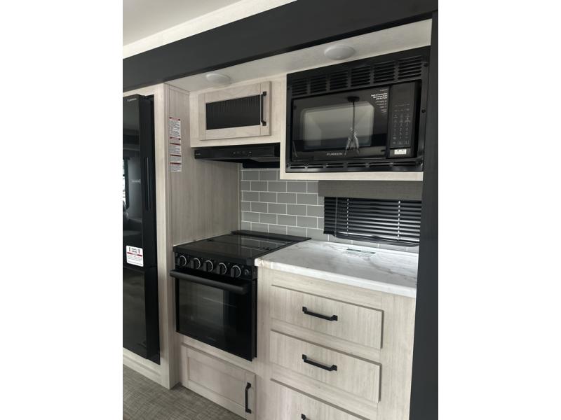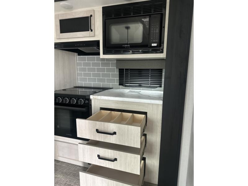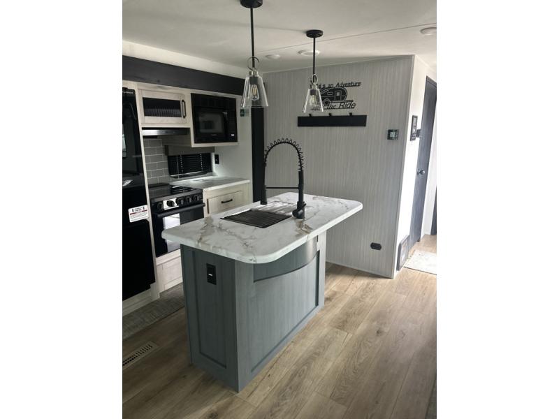 You're going to feel right at home in this travel trailer! The front private bedroom has a queen bed slide for a good night's rest, a dresser and front closet for your clothes, and another closet with washer and dryer prep. Freshen up each morning in the full bathroom with the 32" x 40" shower with a seat and then head to the kitchen to fry up some eggs on the stainless-steel oven and range. You will also appreciate having a kitchen island for easier meal prep and a walk-in pantry to easily see your canned goods and snacks. The booth dinette offers a comfortable place to dine, play, and even sleep once converted. What better way to wind down your nights than to relax on either the rear sofa or on the theater seating across from the entertainment center with a fireplace!
