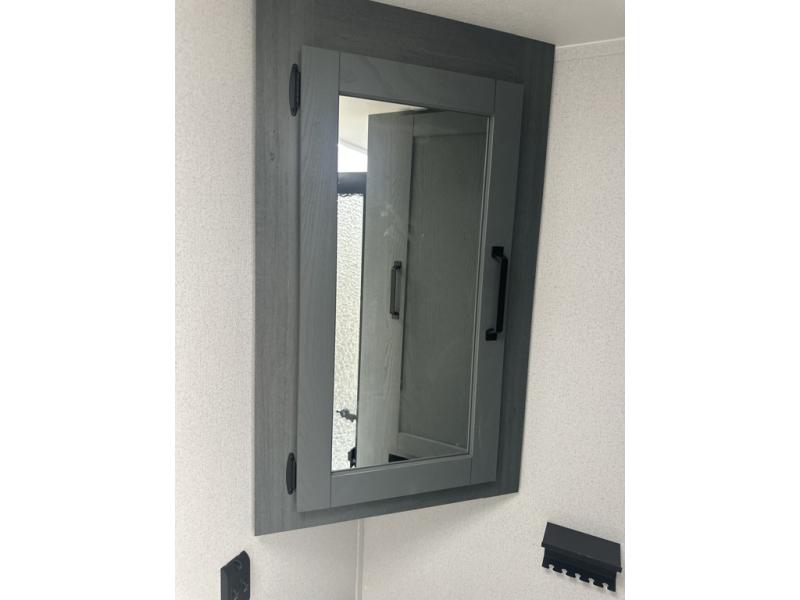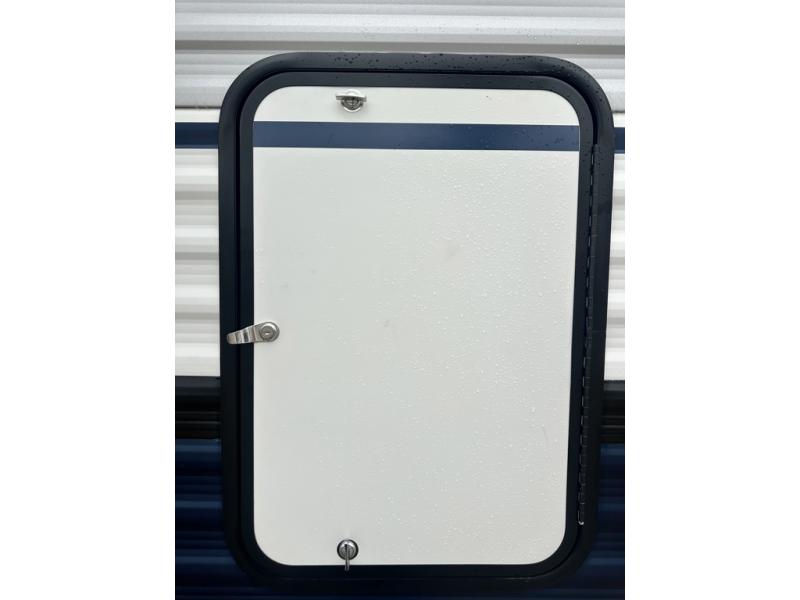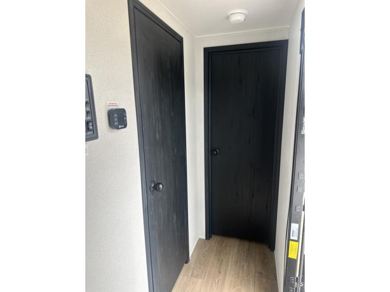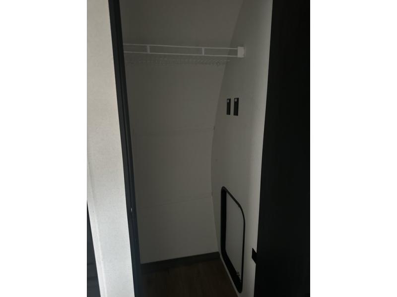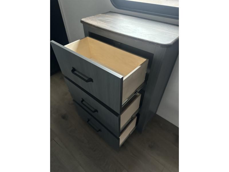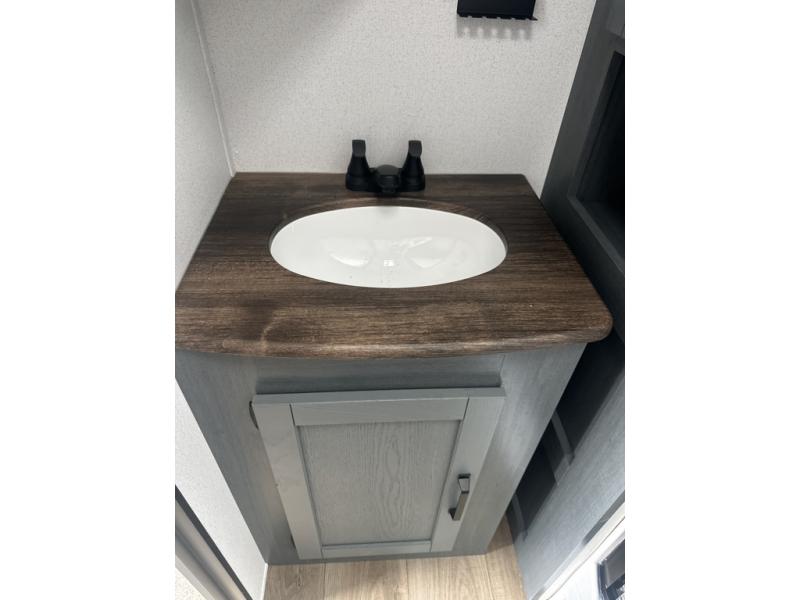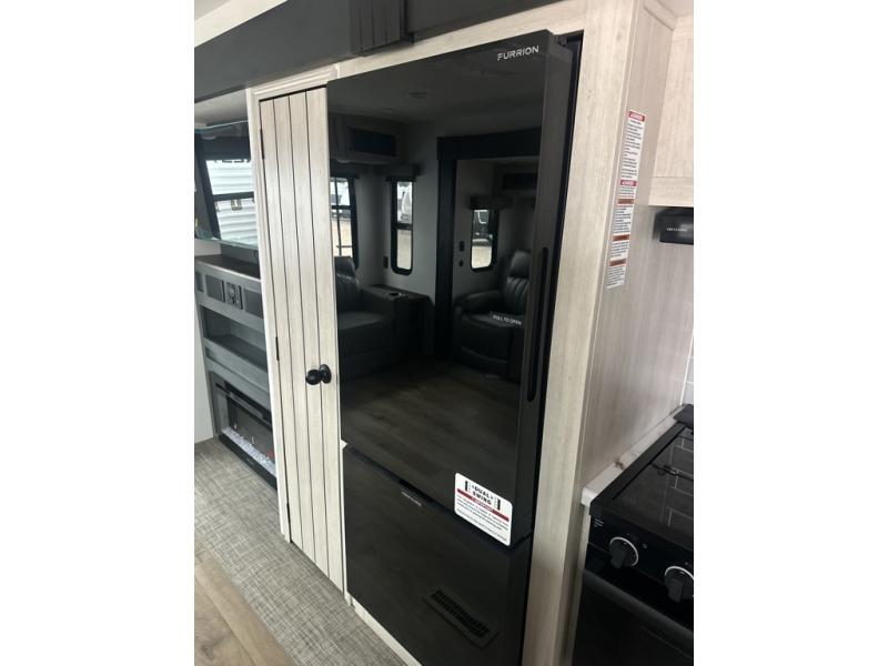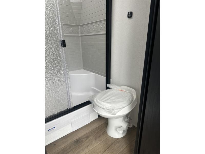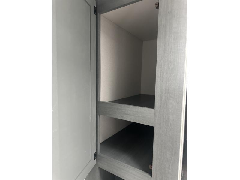 You're going to feel right at home in this travel trailer! The front private bedroom has a queen bed slide for a good night's rest, a dresser and front closet for your clothes, and another closet with washer and dryer prep. Freshen up each morning in the full bathroom with the 32" x 40" shower with a seat and then head to the kitchen to fry up some eggs on the stainless-steel oven and range. You will also appreciate having a kitchen island for easier meal prep and a walk-in pantry to easily see your canned goods and snacks. The booth dinette offers a comfortable place to dine, play, and even sleep once converted. What better way to wind down your nights than to relax on either the rear sofa or on the theater seating across from the entertainment center with a fireplace!