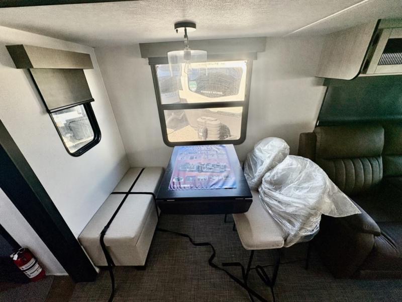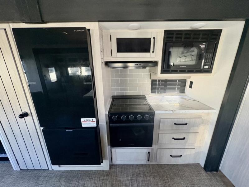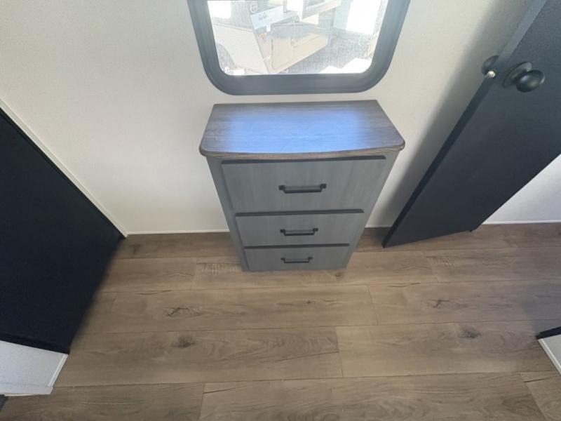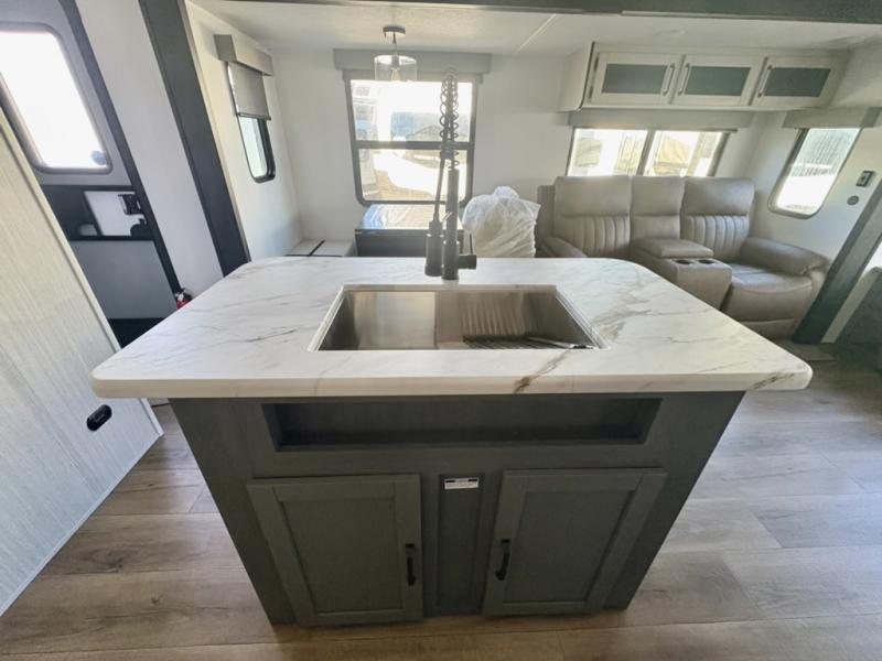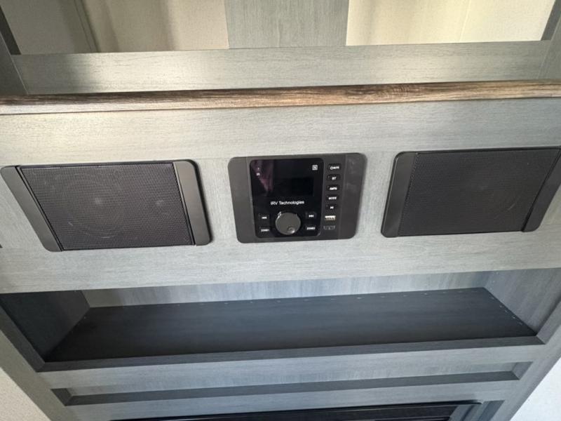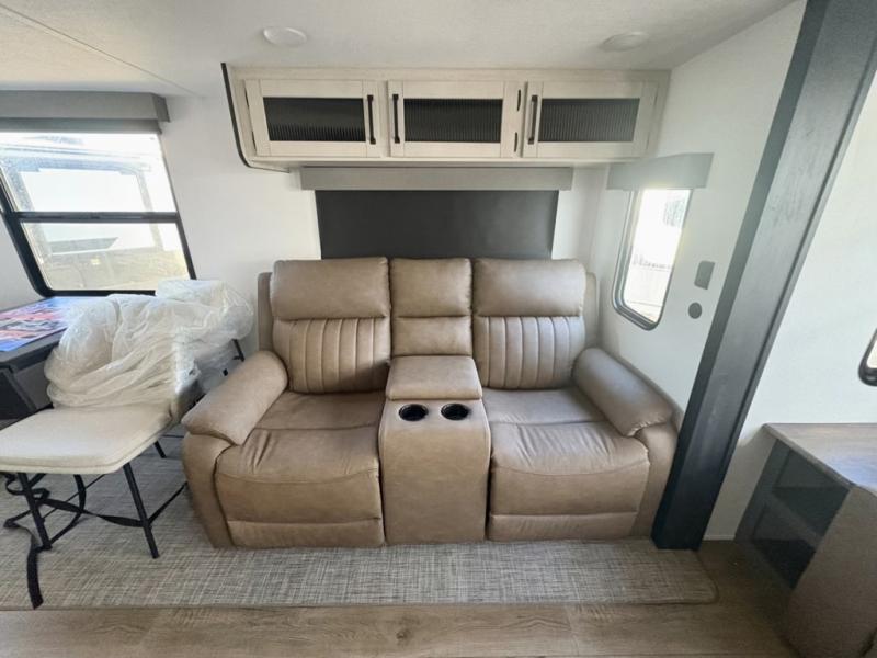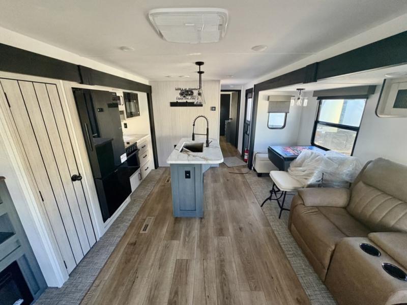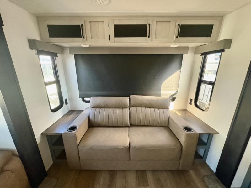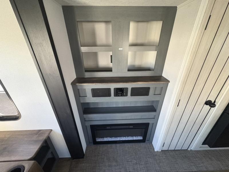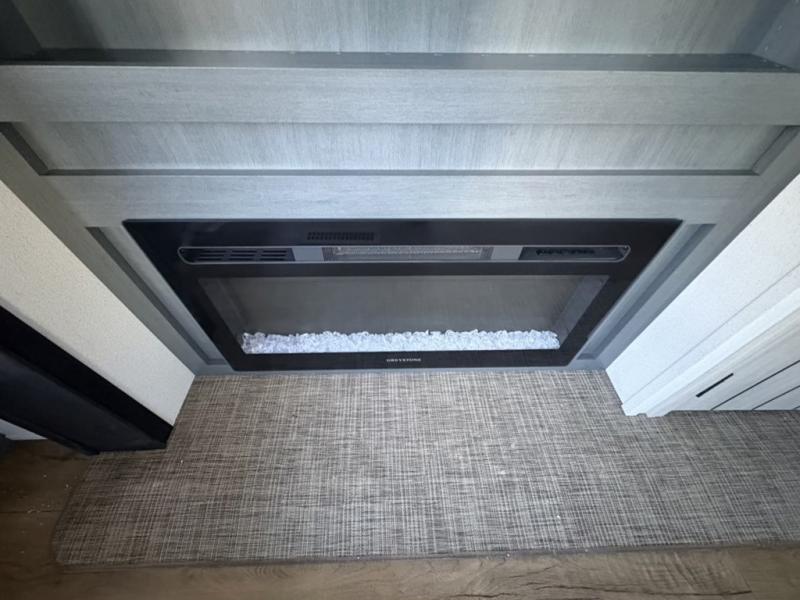 You're going to feel right at home in this travel trailer! The front private bedroom has a queen bed slide for a good night's rest, a dresser and front closet for your clothes, and another closet with washer and dryer prep. Freshen up each morning in the full bathroom with the 32" x 40" shower with a seat and then head to the kitchen to fry up some eggs on the stainless-steel oven and range. You will also appreciate having a kitchen island for easier meal prep and a walk-in pantry to easily see your canned goods and snacks. The booth dinette offers a comfortable place to dine, play, and even sleep once converted. What better way to wind down your nights than to relax on either the rear sofa or on the theater seating across from the entertainment center with a fireplace!