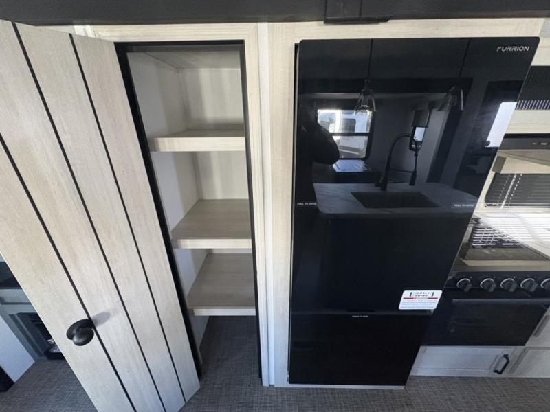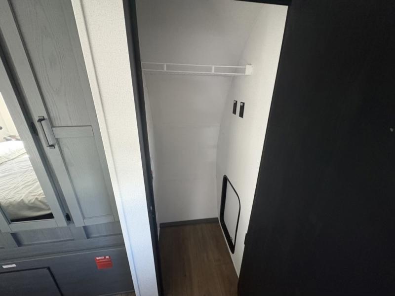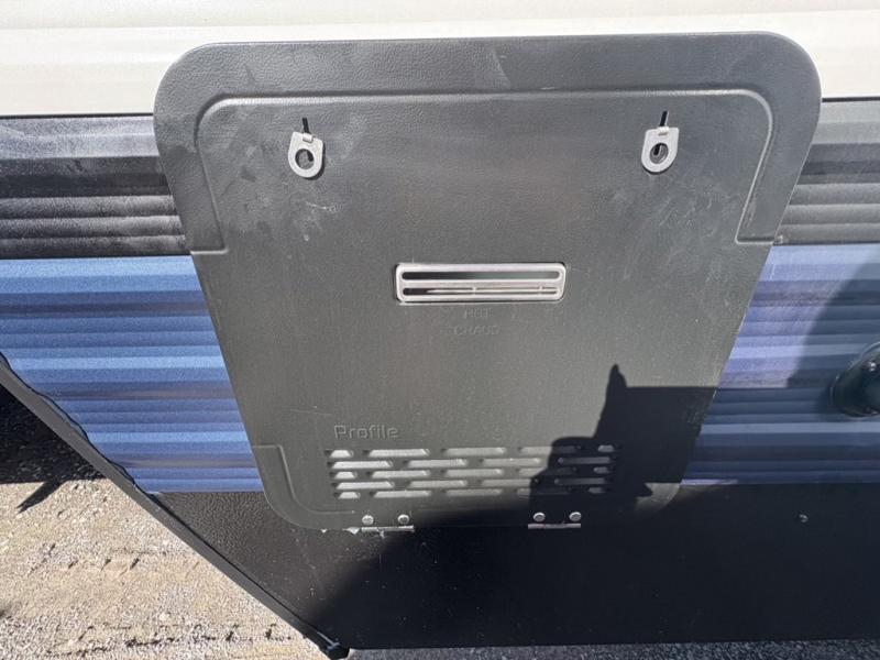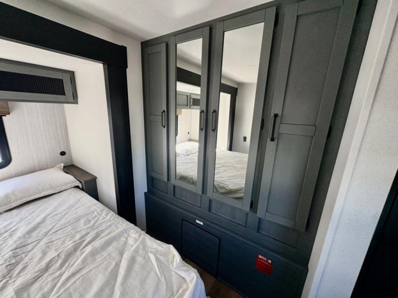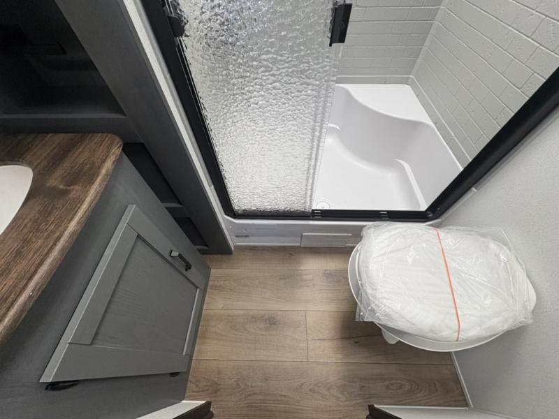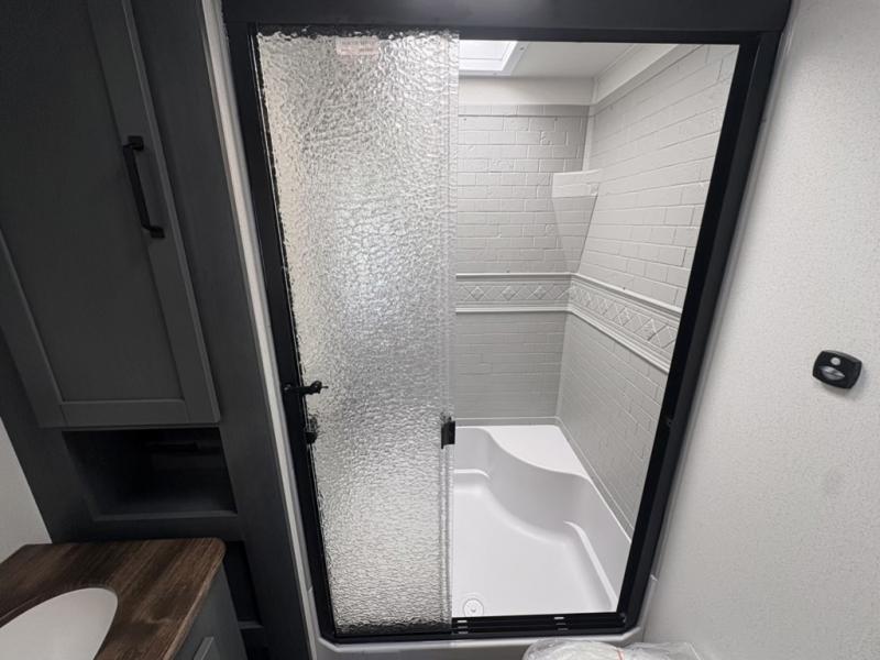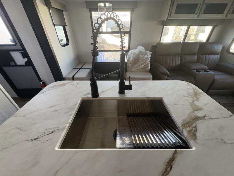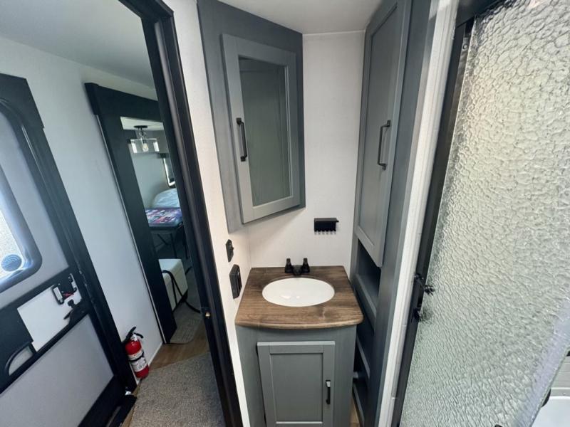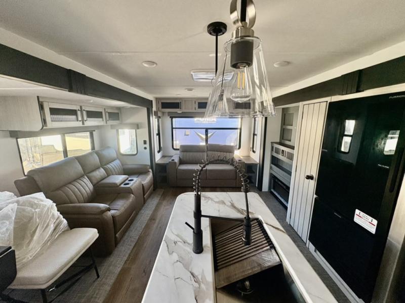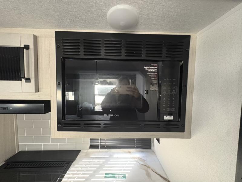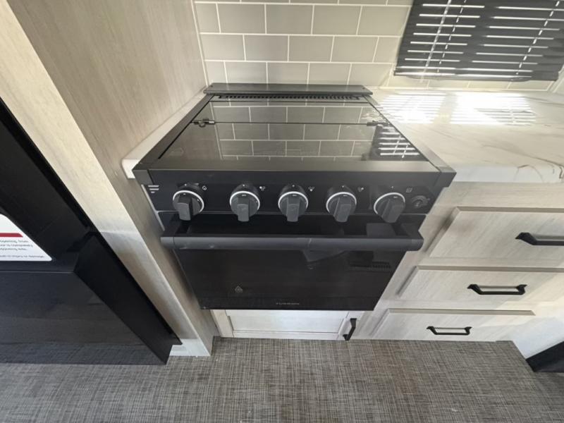 You're going to feel right at home in this travel trailer! The front private bedroom has a queen bed slide for a good night's rest, a dresser and front closet for your clothes, and another closet with washer and dryer prep. Freshen up each morning in the full bathroom with the 32" x 40" shower with a seat and then head to the kitchen to fry up some eggs on the stainless-steel oven and range. You will also appreciate having a kitchen island for easier meal prep and a walk-in pantry to easily see your canned goods and snacks. The booth dinette offers a comfortable place to dine, play, and even sleep once converted. What better way to wind down your nights than to relax on either the rear sofa or on the theater seating across from the entertainment center with a fireplace!