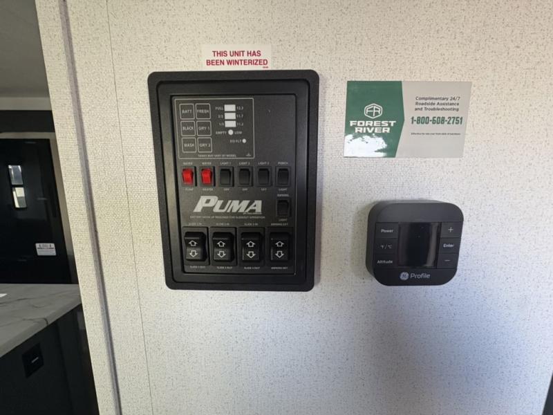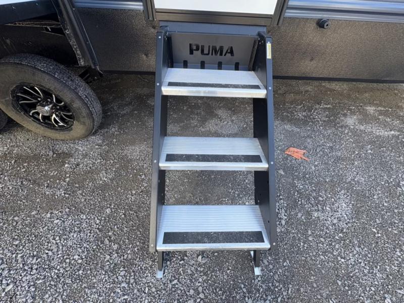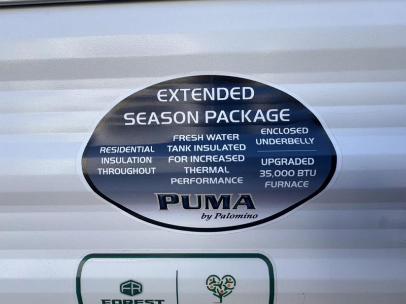 If you're looking for family-fun adventures, then you need one of these Forest River Puma travel trailers! They are built rugged, easy to tow, and jam packed with features. The Darco wrapped underbelly will help protect your unit, and the roof and side mount solar prep gives you the option to add off-grid power. Inside, the Congoleum linoleum will be easy to keep clean, and the night roller shades will provide privacy when it's time to turn in. You'll also enjoy an electric awning with an LED light strip plus an AM/FM/Bluetooth stereo and two outside speakers to keep the party going!