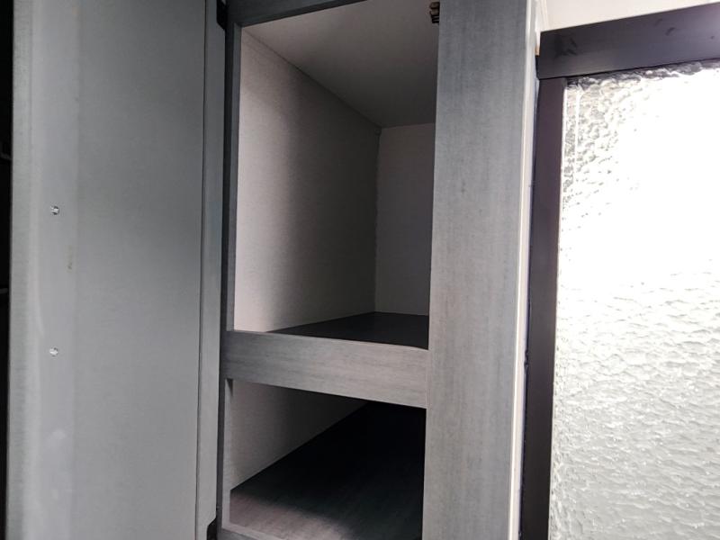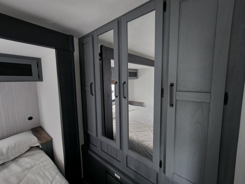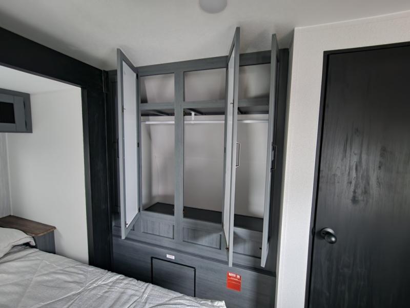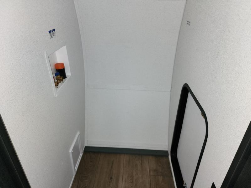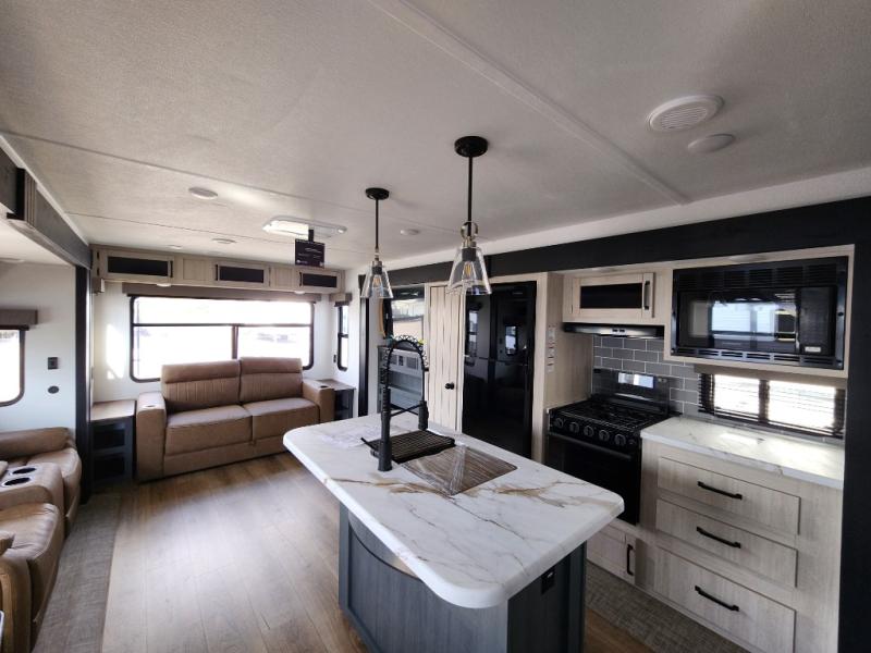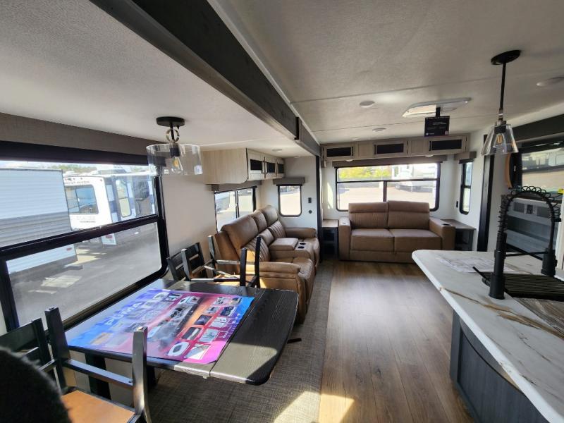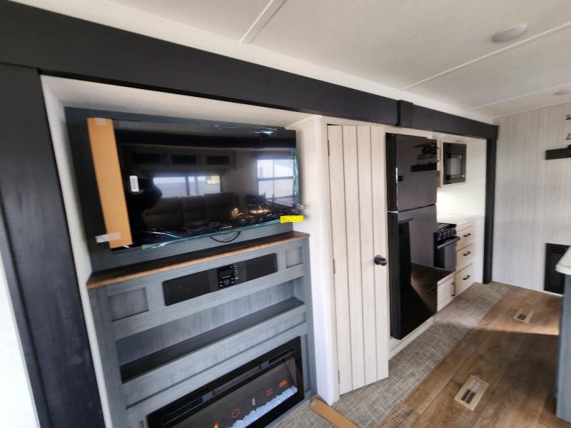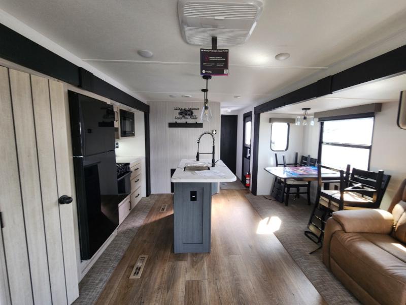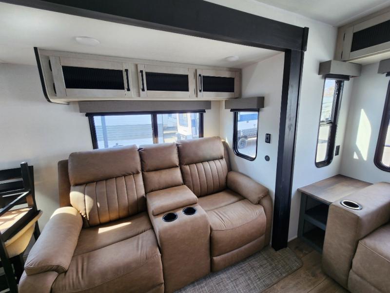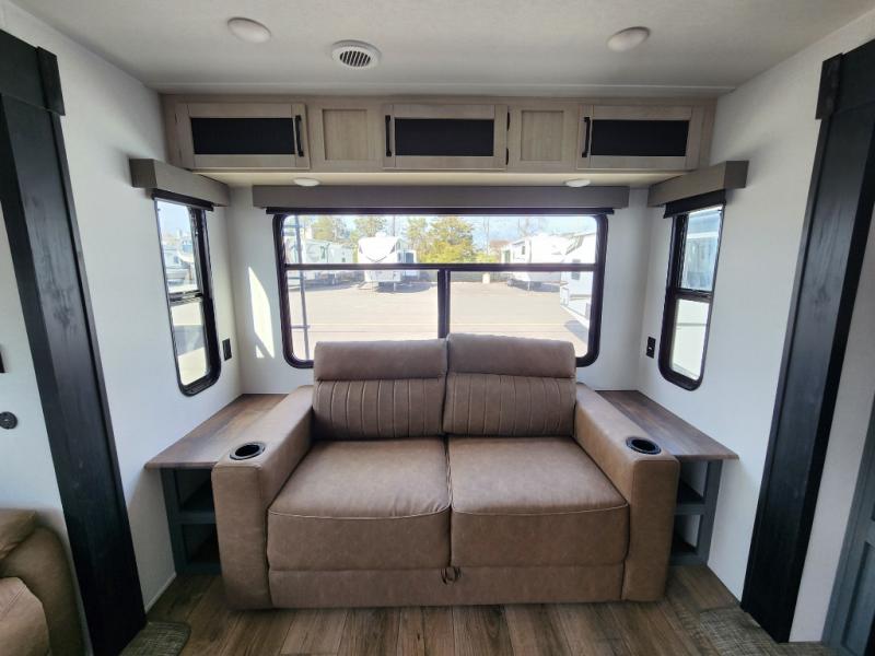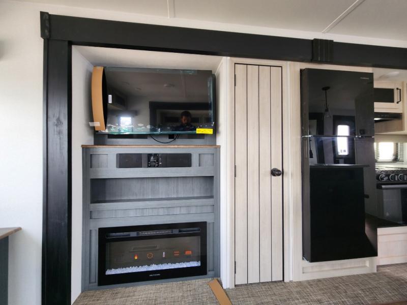 You're going to feel right at home in this travel trailer! The front private bedroom has a queen bed slide for a good night's rest, a dresser and front closet for your clothes, and another closet with washer and dryer prep. Freshen up each morning in the full bathroom with the 32" x 40" shower with a seat and then head to the kitchen to fry up some eggs on the stainless-steel oven and range. You will also appreciate having a kitchen island for easier meal prep and a walk-in pantry to easily see your canned goods and snacks. The booth dinette offers a comfortable place to dine, play, and even sleep once converted. What better way to wind down your nights than to relax on either the rear sofa or on the theater seating across from the entertainment center with a fireplace!